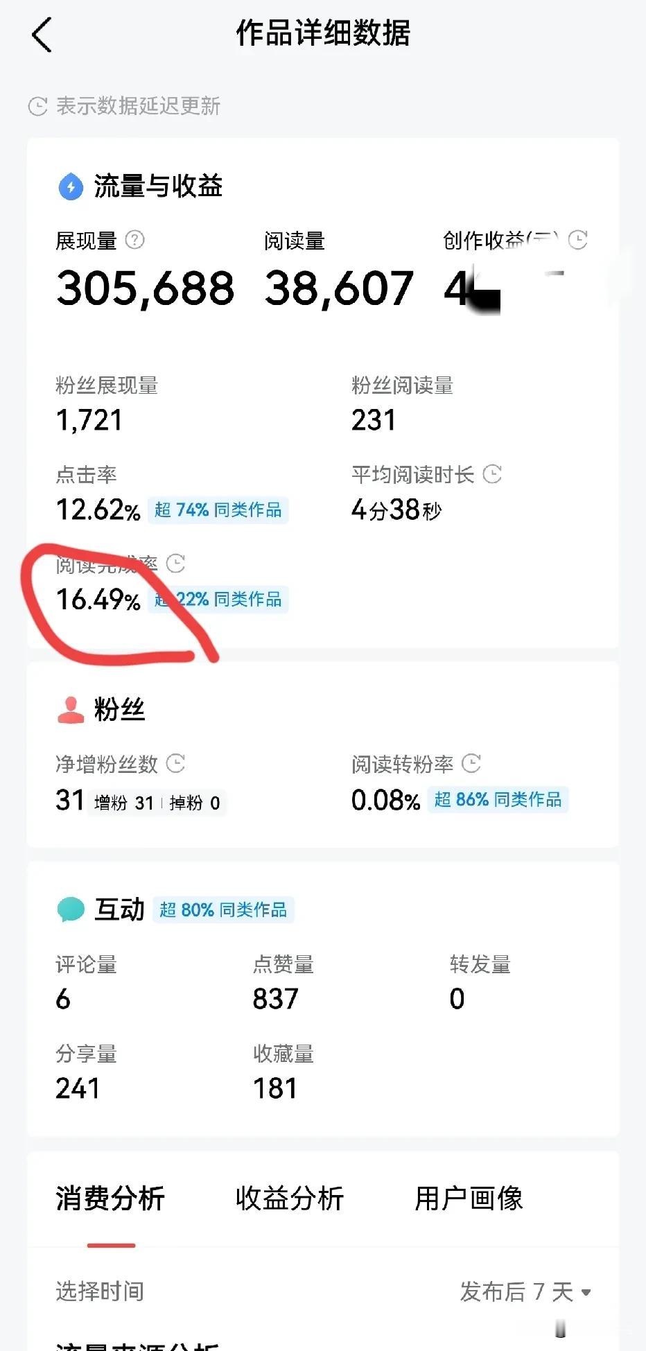 别再说没有流量,就怪头条了! 是不是好的文章,条友们是最清楚的! 一篇文章展现30万,点击率12%,可阅读完成率才16.94%?说明了什么呢? 说明了,一篇好的文章标题很重要,因为标题能吸引条友点击! 点击进入后,靠的就是内容及自己实打实的文笔了! 所以头条还是很公平的,写得好,就永远不缺流量! 反之,则需要自己琢磨琢磨了! 当然了,运气也是要有,比如前两天一两句话,再配个青菜叶子,几百万的展现及几十万的阅读? 这些就为之奈何了呀!都来晒流量 流量出问题了 流量这亊 流量很大啊 无赞无流量 流量够用么 请给我多多流量