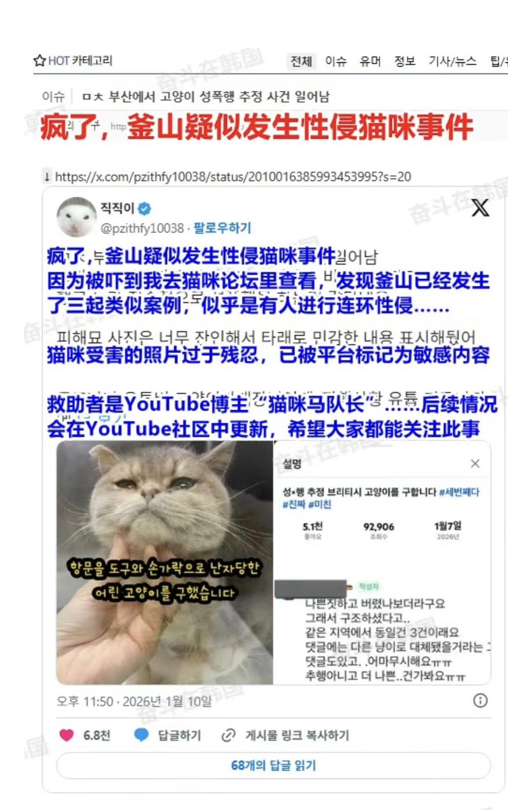 近日,网传韩国釜山发生性侵猫咪事件…. 据韩国网民在网上爆料,在韩国釜山已经发生了三起类似事件!被救助的受害猫咪,其肛门处遭到摧残,脖子也被割伤…. 一时之间不知道该说什么了,只能说可以和印度人坐一桌了…. 你可以不爱但不要伤害,希望小动物们都能被温柔以待…