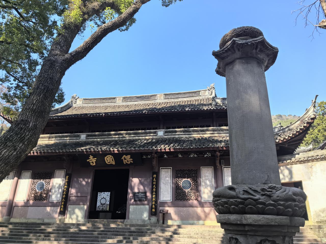 今天天气不错,和闺蜜们相约驱车半小时来到江南最古老木构建筑—宁波保国寺游玩。 保国寺被誉为“中国南方第一古建”,采用三重藻井和瓜棱柱工艺,代表了江南木构建筑的巅峰,始建于东汉,重建于北宋。 我们四人拾阶而上,曲径通幽,徜徉在这绿色的天然氧吧中。 在大殿上,我们看到了最有特色的奇特现象:虫不蛀,鸟不栖,无尘无网,这是因为建筑木材含有独特的油脂。 在明媚的阳光里感受着中华传统建筑的气势雄大和华美宏丽,美哉快哉。