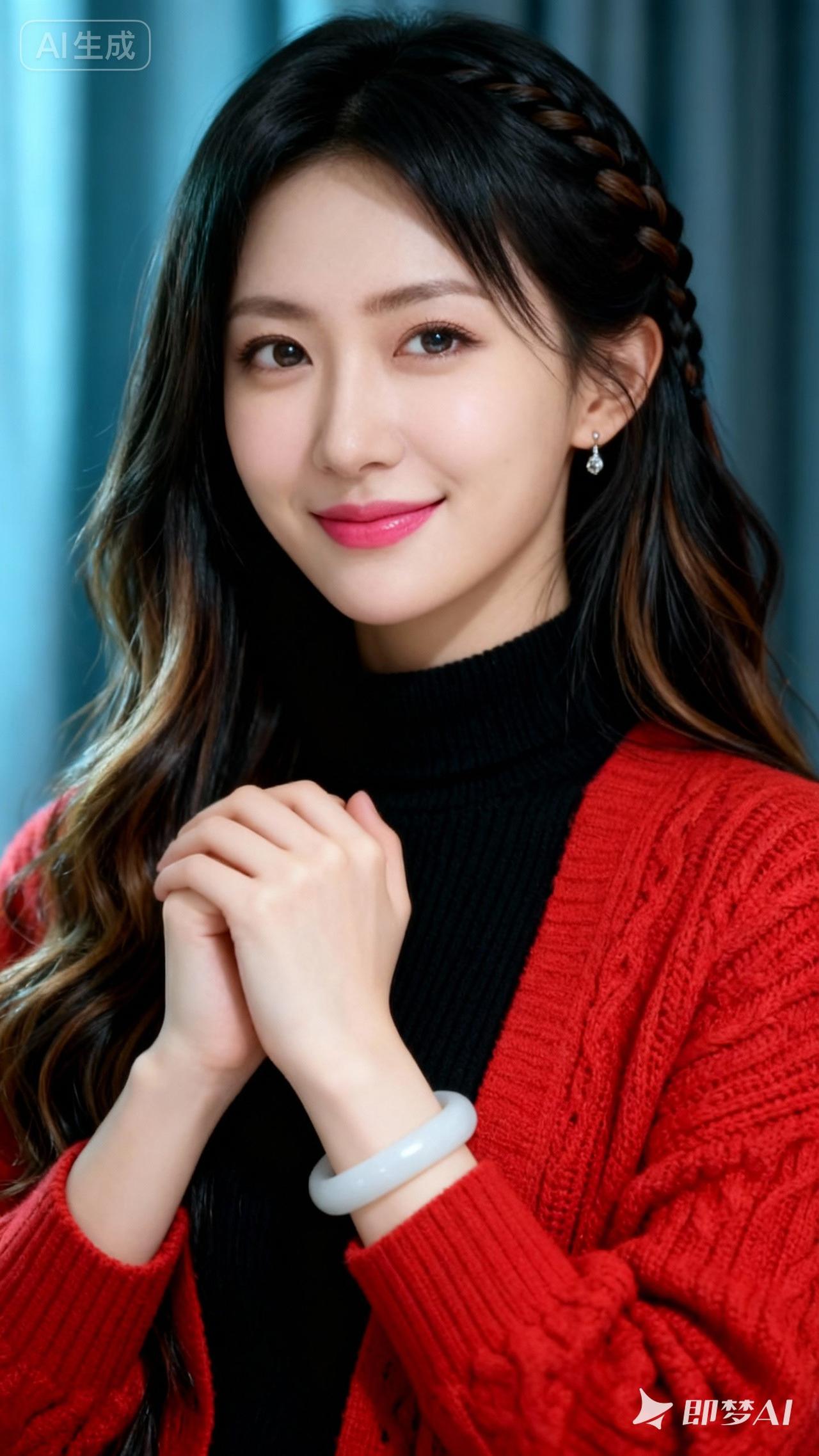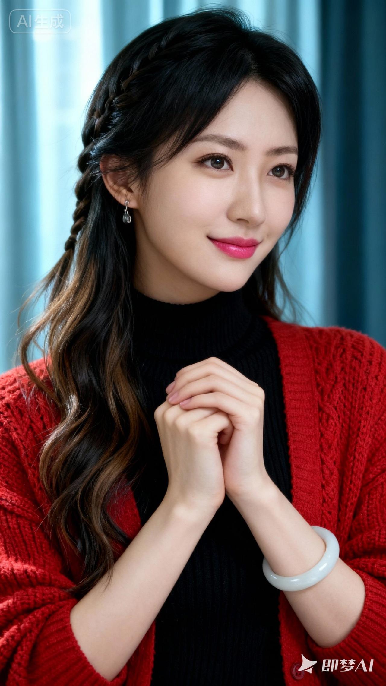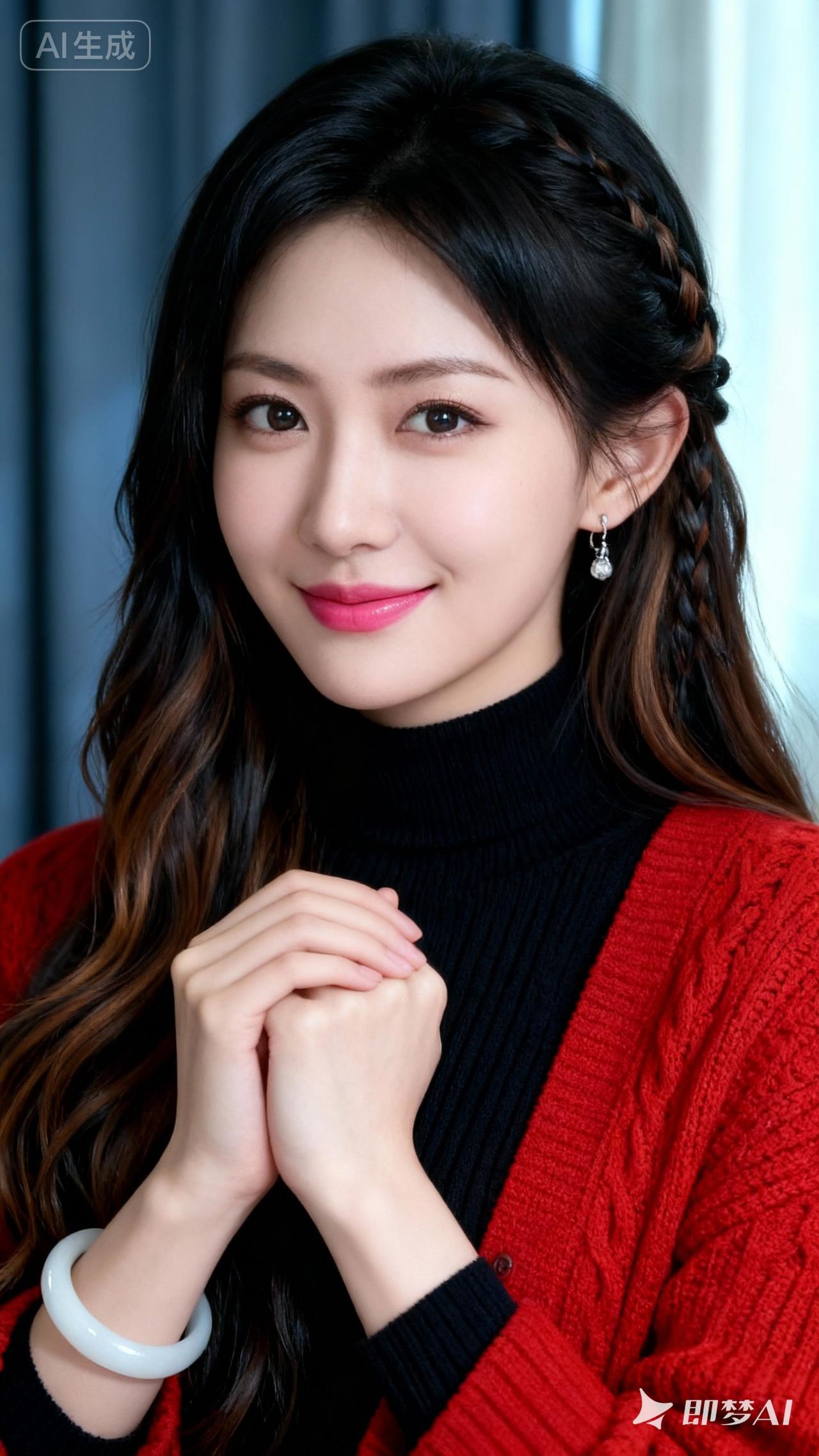 温柔甜美的少女,红衣黑发,微笑动人。