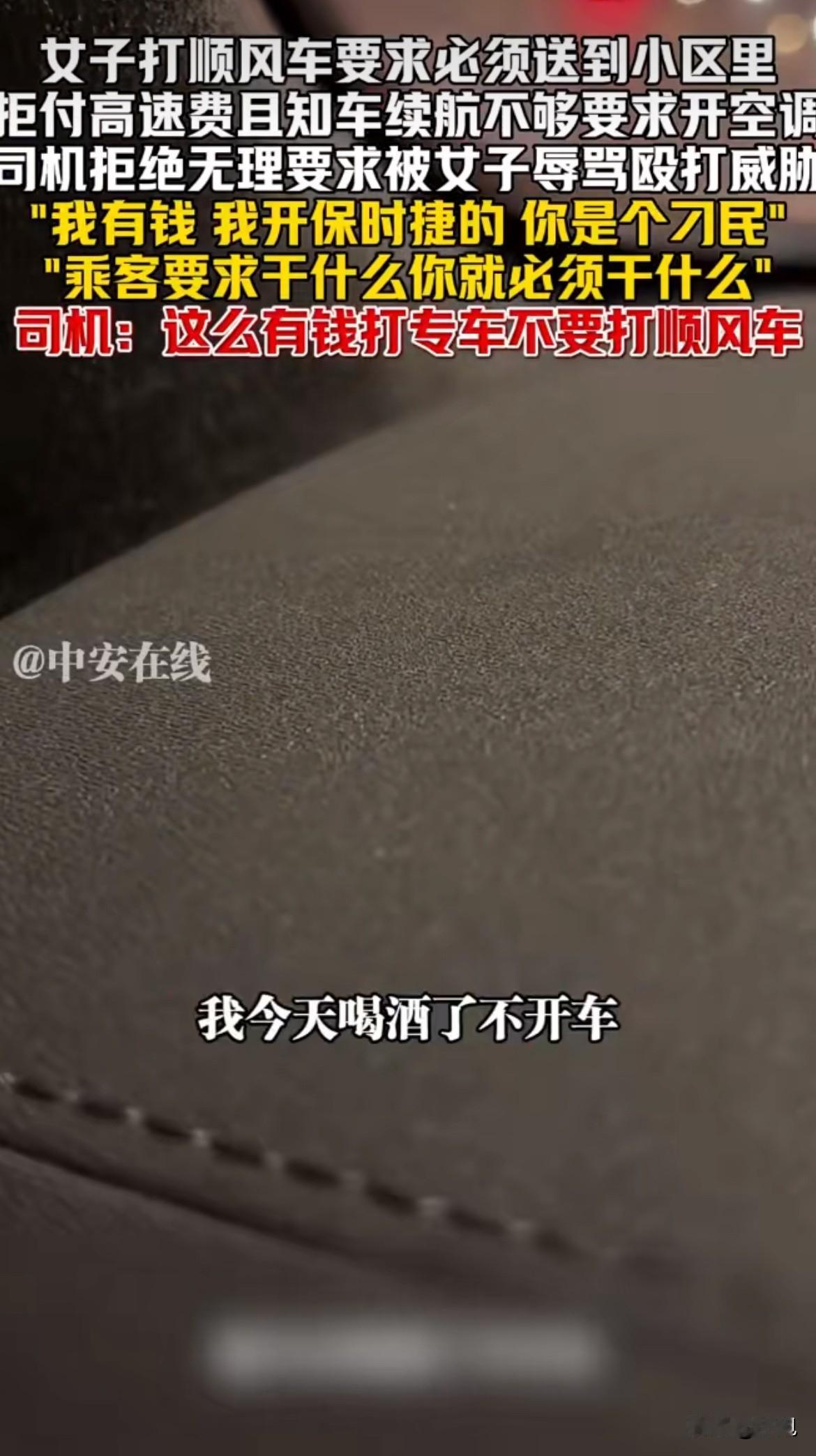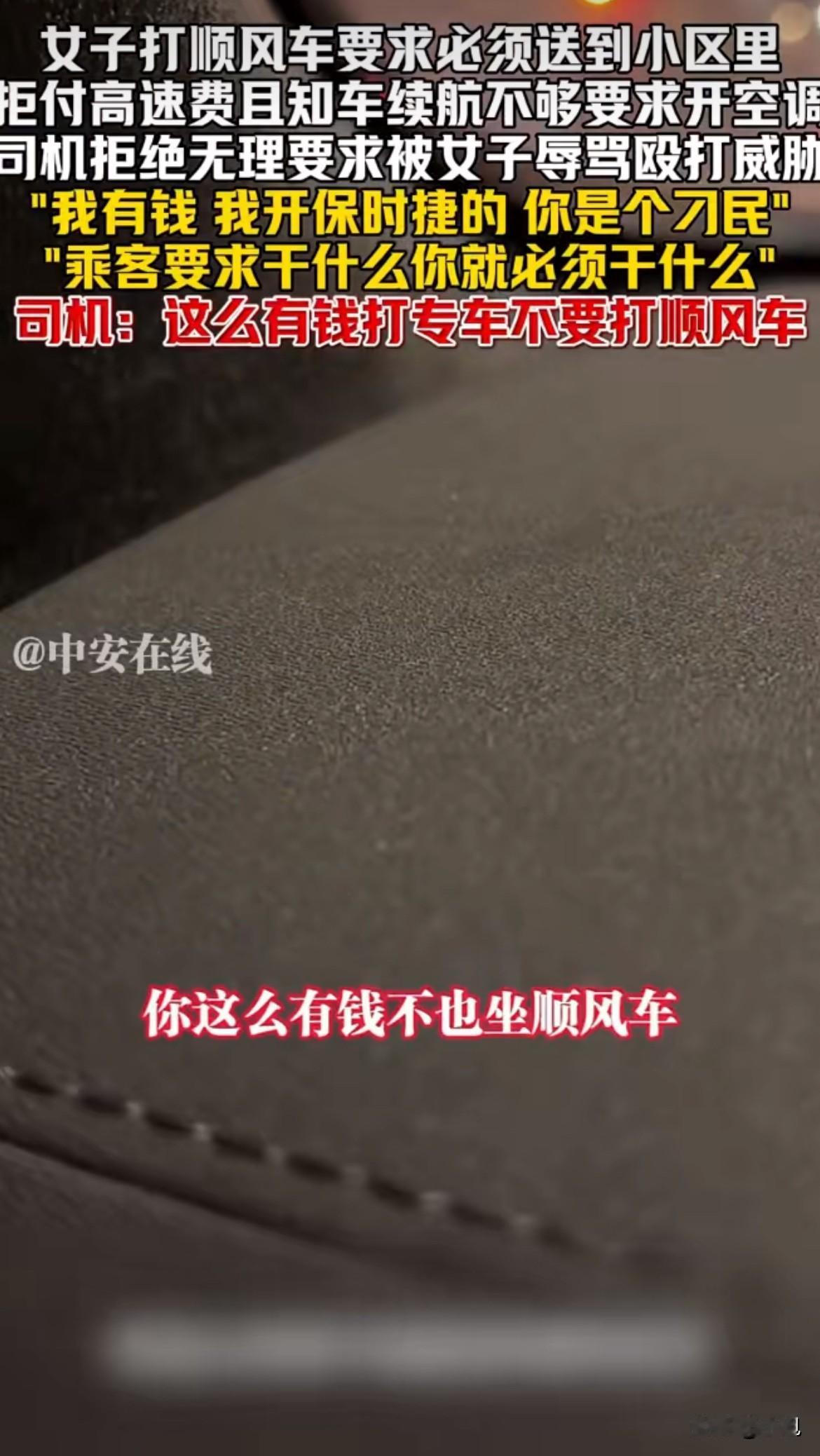 看了江苏那个顺风车视频,真是火冒三丈。一个女乘客,打车前怎么约定的不知道,但一上车就要求必须开进小区里面,拒绝支付高速费,还明知车子续航可能不够,非要司机开空调。 司机拒绝这些要求后,事情彻底变味了。那女子直接开骂,甚至动手打人,嘴里还嚣张得很:“我有钱,我开保时捷的,你是个刁民,乘客要求干什么你就必须干什么。” 而司机回了一句大实话:“这么有钱就打专车。” 很多人不明白,顺风车到底是什么。它本质上不是网约车服务,而是一种民事互助行为,司机和乘客之间是平等的。你付的是分摊油电费的钱,不是买一个专属司机。 这件事里,那个保时捷车主搞混了。她觉得自己出了钱,就可以像使唤佣人一样,无视规则,无限提要求。她把“共享出行”理解成了“我的专车”。 更让人反感的是她那套居高临下的做派。开什么车,跟有没有资格辱骂殴打他人,没有一毛钱关系。“我有钱”成了她为所欲为的借口,这才是最刺痛普通人的地方。 普通人每天奔波,遵守规则,赚一份辛苦钱。凭什么要无端承受这种来自所谓“有钱人”的恶意和侮辱?这不是钱多钱少的问题,是做人最起码的尊重问题。 事情闹大了,警方已经介入处理。大家现在都等着一个结果。普通人就想看到一个简单的道理被印证:不管开保时捷还是开普通车,法律面前都一样,动手打人骂人,就要承担责任。 这件事之所以让人气愤,就是因为它用最直接的方式,展示了一种扭曲的优越感。大家反感的是这种把财富当欺负人资本的模样。生活不易,谁也不想在路上,无缘无故就成了别人宣泄傲慢的对象。