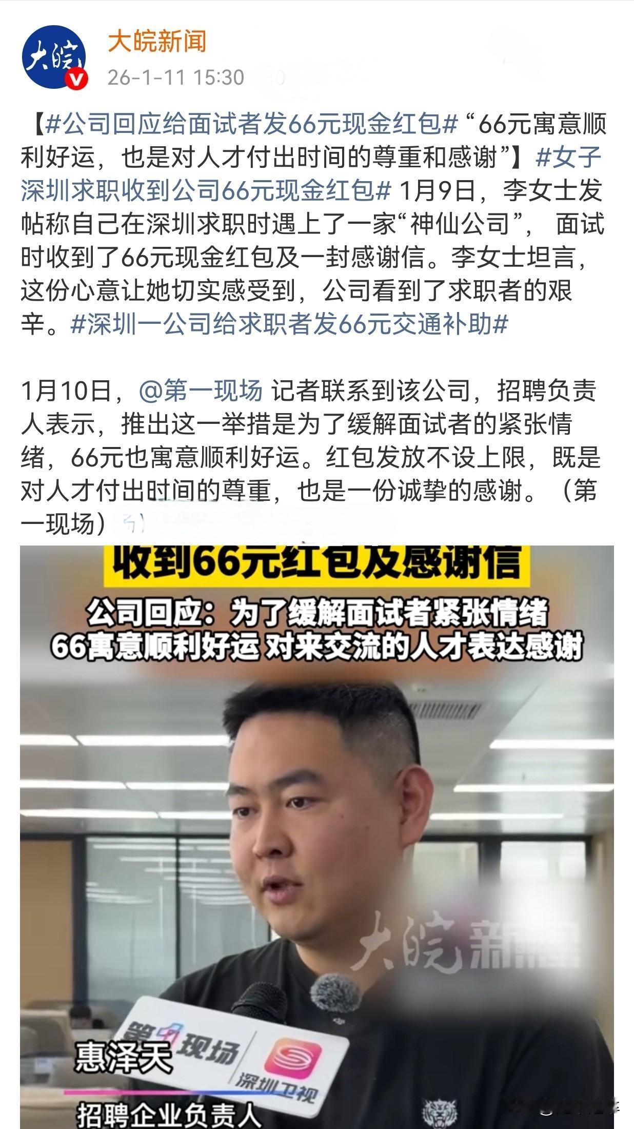 深圳的神仙公司! 1月9日,求职者李碧华在深圳小谷顿餐饮公司面试后,收到内含66元现金的交通补助红包及感谢信。信中感谢您路途奔波的辛苦,愿小心意为行程带来温暖的表述。 这样的举动远胜不少同行,不少人都有过被HR用假面试实则只是为了完成面试KPI的经历。与之对比,涉事公司被网友称为“神仙公司”一点也不夸张。66元并没有多少钱,大概够在深圳市内往返两三次的交通费,却在平常的商业行为中多了一抹人性的温度。该公司向求职者传递了你付出时间和精力来面试,这份付出值得被感谢。哪怕最终没能入职,这份善意也会成为求职者美好的回忆。 也有网友质疑这个事件是营销炒作,公司回应:不在乎质疑,只做正确的事善待求职者才最好的企业广告。长久以来,我们看到了太多职场上的寒心事,看到了太多求职者遭遇的奇葩经历。大家为这样的企业点赞,并不是苛求所有用人单位原样照做,而是呼吁用人单位对求职者多一些关照和善意,HR多一些换位思考、将心比心。