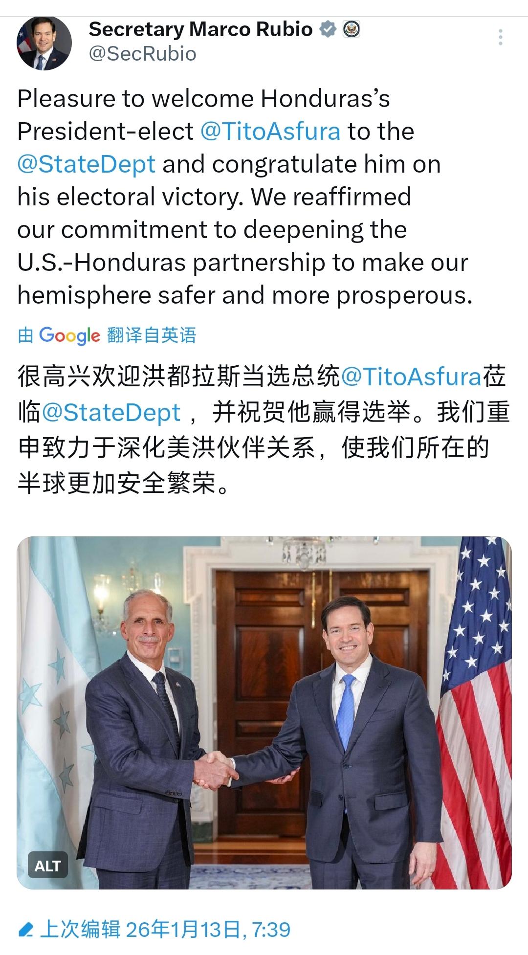 美国国务卿鲁比奥今天(北京时间1月13日)写道:“很高兴欢迎洪都拉斯当选总统阿斯富拉莅临国务院,并祝贺他赢得选举。我们重申致力于深化美洪伙伴关系,使我们所在的半球更加安全繁荣。” 这番操作看似常规的外交互动,实则是美国在拉美推行“右转”战略的又一公开动作。阿斯富拉此行的时机耐人寻味,距离他1月27日正式就职仅剩两周,却迫不及待奔赴华盛顿表姿态,背后的政治逻辑早已超越单纯的外交礼节。 阿斯富拉能在2025年洪都拉斯大选中胜出,本身就充满了争议与外部干预的痕迹。这场选举的竞争异常激烈,最终他仅以40.27%的得票率险胜,比第二名候选人高出不足1个百分点,微弱的优势让选举结果自公布起就备受质疑。 落选者直言这是一场“选举政变”,就连选举委员会内部都有委员对计票流程提出异议,认为在特别计票程序未完成、尚有核查时间的情况下,仓促用有争议的系统公布结果并不合规。 而这一切争议的背后,都离不开美国前总统特朗普的强势介入,他不仅公开为阿斯富拉站台,称其为美国“唯一愿意合作”的候选人,更直白发出胁迫信号,暗示若其他候选人当选,美国将削减对洪都拉斯的经济援助。 特朗普的干预并非口头表态那么简单,而是一套组合拳。选举前72小时内,他多次通过数字平台发声,抹黑竞争对手为“共产主义者”,甚至宣布将赦免阿斯富拉所属国民党的前主席——一位因贩毒和武器指控在美国被判45年监禁的前总统,用这种极具争议的方式为阿斯富拉铺路。 原本民调领先的对手,正是在特朗普的密集攻击下支持率下滑,最终让阿斯富拉实现了逆转。要知道,洪都拉斯非正规就业率超过70%,经济对外部援助依赖度不低,特朗普的“断援”威胁,对选民和参选各方都形成了难以忽视的压力。 阿斯富拉曾担任洪都拉斯首都区区长近八年,虽有基础设施建设的政绩积累人气,却也背负着滥用职权、挪用公款的指控,如今靠着外部势力加持上位,奔赴华盛顿的举动更像是对“靠山”的投桃报李。 美国对阿斯富拉的扶持,本质上是想稳住其在中美洲的传统“后院”。近年来洪都拉斯左翼政府推动与中国建交,两年间双方在基础设施、医疗卫生、人文交流等领域的合作成果显著,孔子学院的筹备、共建“一带一路”的推进,都让美国感到了影响力被稀释的焦虑。 而阿斯富拉早早就亮明了亲美立场,不仅提议与美国结成优先联盟,还明确要与委内瑞拉等左翼政权保持距离,这恰好契合了美国在拉美推动保守化、亲美化路线的诉求。从萨尔瓦多到阿根廷,美国正通过政治背书、经济绑定等手段,在拉美构建保守派联盟,洪都拉斯不过是这一战略中的最新一环。 更值得警惕的是,阿斯富拉在涉台问题上的反复试探,让中洪关系的前景蒙上阴影。早在2025年7月竞选期间,他就曾在美国宣称要恢复与台湾地区的所谓“邦交”,还扬言要重新审查与中国签署的协议,这番言论当时就遭到中国驻洪使馆的强烈谴责。 大选获胜后,台当局更是借机炒作“复交可期”,而阿斯富拉并未明确否认,反而隐隐将其作为与中方博弈的筹码。 一边以“断交”相要挟试图索要更多援助,一边拿一中原则做政治交易,这种投机做法无视中洪建交以来的合作成果,也违背了183个国家公认的一个中国原则。 要知道,洪都拉斯副总统曾公开表示,与中国建交是最正确的决定,两国合作实实在在惠及了民众,如今新政府的态度转变,无疑让这些成果面临变数。 阿斯富拉的华盛顿之行,看似是美洪关系升温的起点,实则暗藏诸多不稳定因素。他背负着选举争议和腐败指控上台,过度依赖美国的支持能否稳住国内局势还是未知数,而拿国家外交原则做投机的做法,更可能让洪都拉斯陷入被动。 美国想要通过扶持亲美派掌控拉美局势,这种新干涉主义能否得逞,也取决于各国对主权独立的坚守。中洪关系未来会走向何方?阿斯富拉就职后是否会兑现涉台错误言论?欢迎留下你的观点共同探讨。