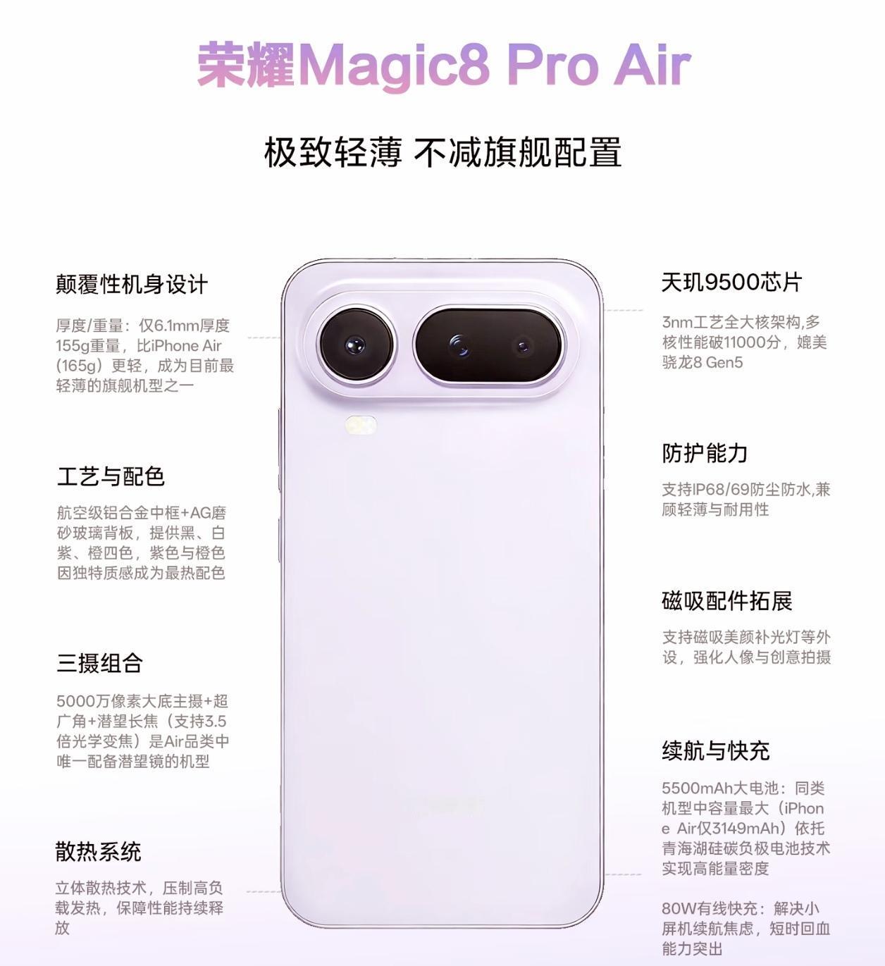 苹果这下真傻眼了吧[捂脸]荣耀是真有两把刷子,荣耀Magic8 Pro Air竟然能堆料如此之狠的情况下还能做到如此轻薄,相比于iPhone17 Air,真是高下立判。 有一说一,155g的轻薄机身,还能确保性能、影像和续航都很强,这真的很需要技术,相信只要价格合理,这就是一匹黑马产品了。