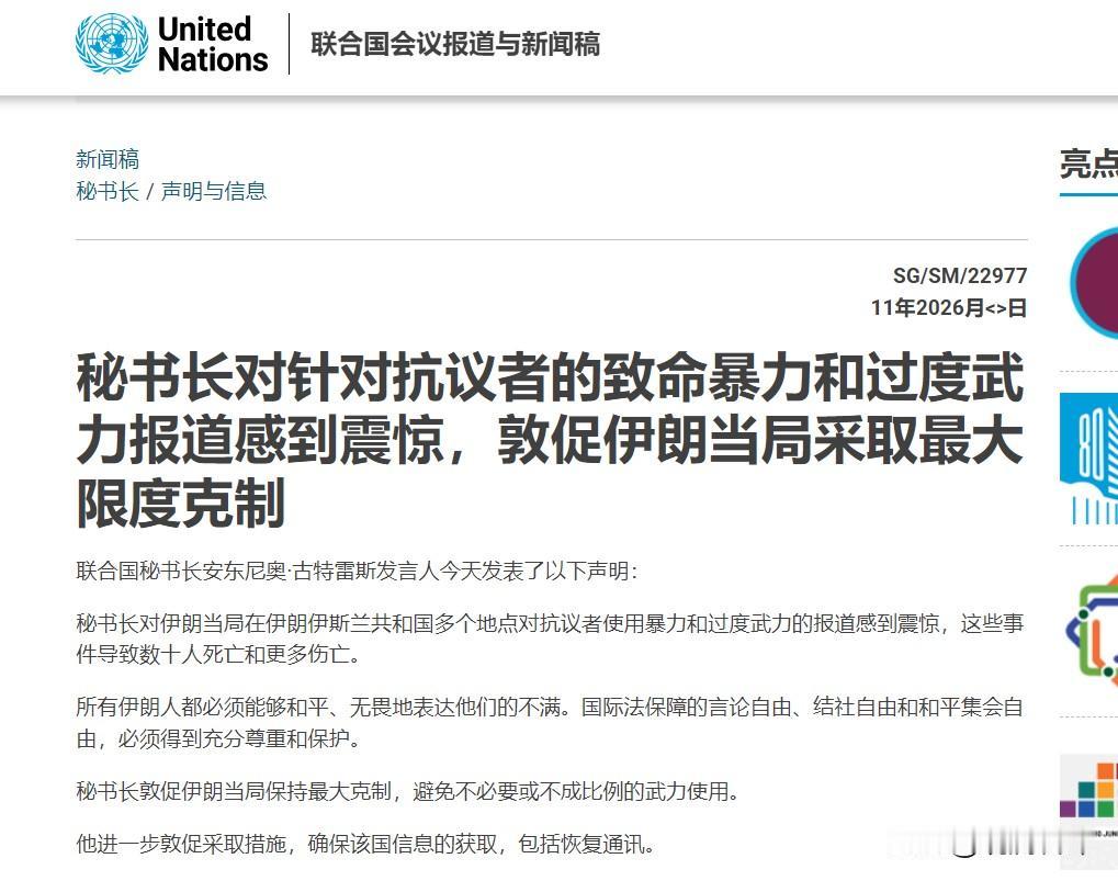 从这几次表态看,联合国虽然没能力,但相比很多成员国,最起码三观还是正的。 1、针对伊朗暴力镇压,联合国秘书长安东尼奥·古特雷斯:对伊朗当局在伊朗伊斯兰共和国多个地点对抗议者使用暴力和过度武力的报道感到震惊,这些事件导致数十人死亡和更多伤亡。所有伊朗人都必须能够和平,无畏地表达他们的不满。国际法保障的言论自由,结社自由和和平集会自由,必须得到充分尊重和保护。 2、针对俄乌冲突,联合国政治事务及和平建设事务副秘书长罗丝玛丽·迪卡洛:乌克兰的任何和平都必须充分维护乌克兰在其国际公认边界内的主权、独立和领土完整。