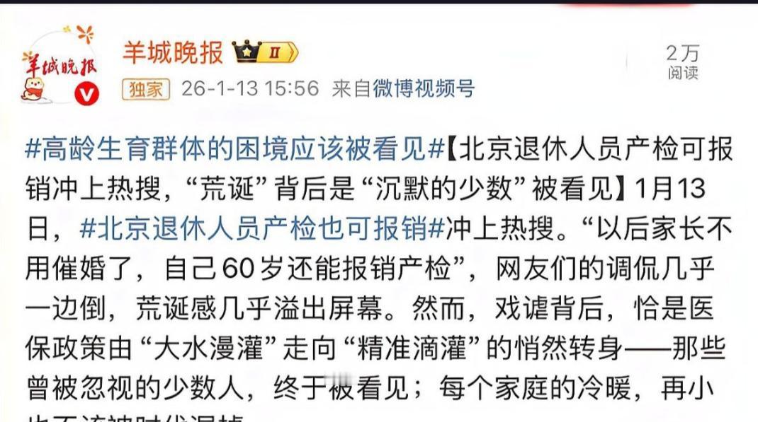 北京医保新规引发热议:退休人员产检也能报销?这背后隐藏着怎样的社会关怀? 北京医保新规自2026年1月1日起实施,允许退休人员享受与在职女职工同等的产检报销待遇,此举引发了广泛关注和讨论。这项政策不仅填补了生育保障制度的空白点,还体现了医保政策从“一刀切”向“量身定制”的转变。具体而言,退休人员发生的医保范围内产前检查费用可按照生育保险标准报销,报销上限为1万元。尽管政策初衷是为了照顾特殊需求群体,如失独家庭,但公众对“60岁还能报销产检”这一设定提出了质疑,认为其合理性存疑。支持者则认为,这一政策有助于减轻特殊群体的经济负担,体现了制度的公平性和温度。