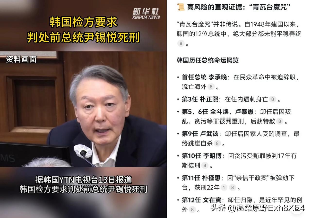 炸裂!今日韩国检方要求法院,以内乱头目嫌疑判处尹锡悦死刑,预计2月底宣判。 而他的妻子金建希因涉贪腐、操纵股价等16项罪名被检方求刑15年,两人可能成为韩国政宪政史上首对同时入狱的前总统夫妇。 据悉,从韩国1948年建国以来,韩国的前13任总统除了文在寅,都未能平稳善终。这在全球没有战乱的国家中,也极其罕见。 庭审中,当审判长叫到尹锡悦时,他还微笑与律师低声交谈,随后才转头回应!估计是太难接受,掩饰心里巨大的落差吧! 对此,您怎么看呢?据悉,韩国1997年就暂停了执行死刑!