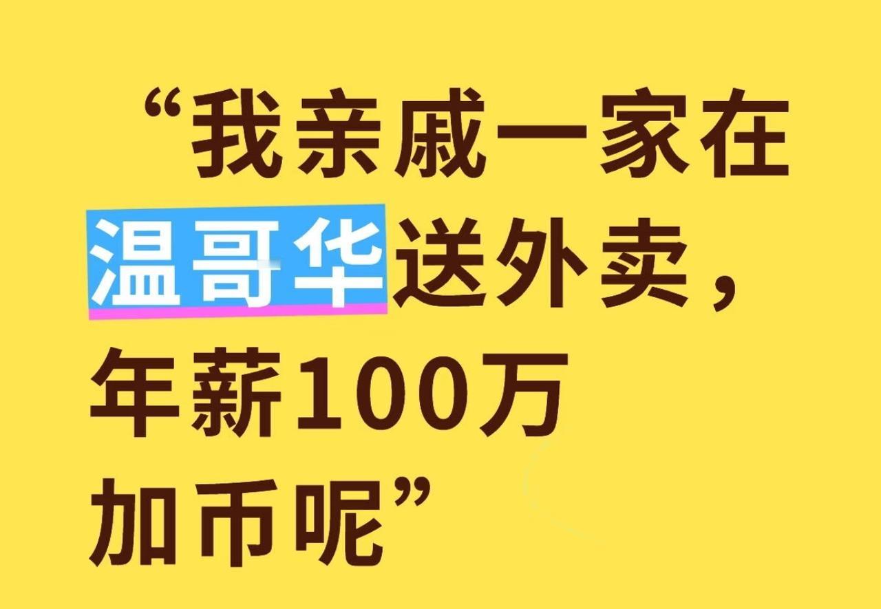 吹吧你,在加拿大送外卖年薪100万加币,我看到另外一个华人分享的收入,是最高时薪17加币,一天干10个小时也才170,一个月干三十天也才5100加币,年薪100万的话,一个月賺8万多,给那么高的派送费,那餐厅得破产吧