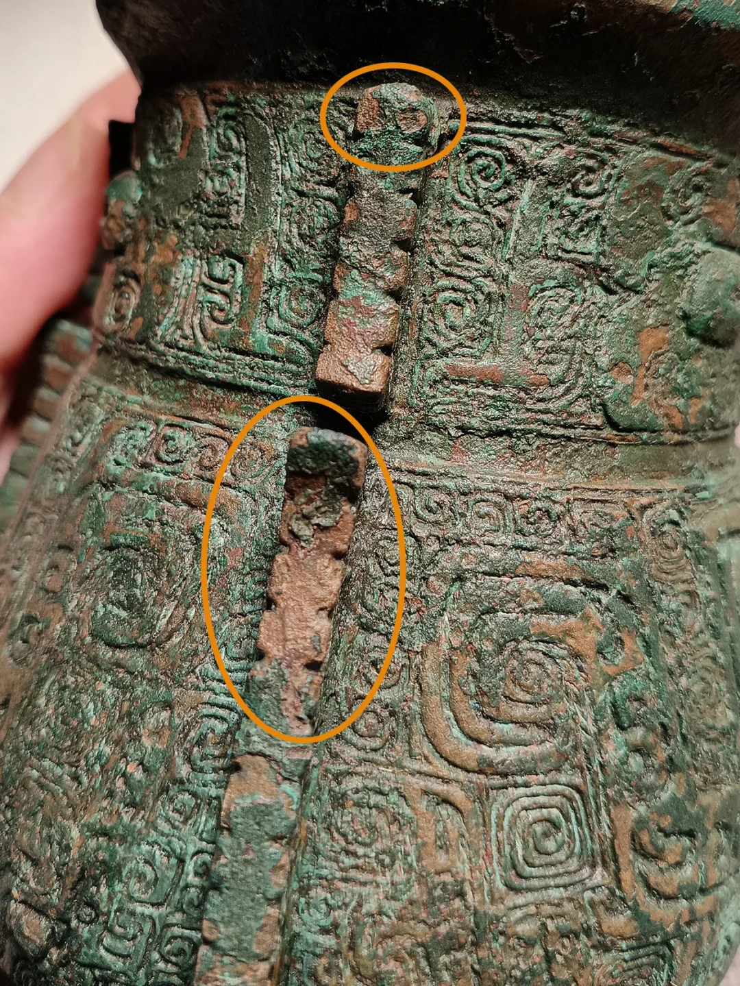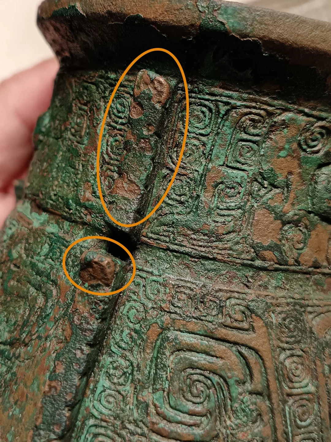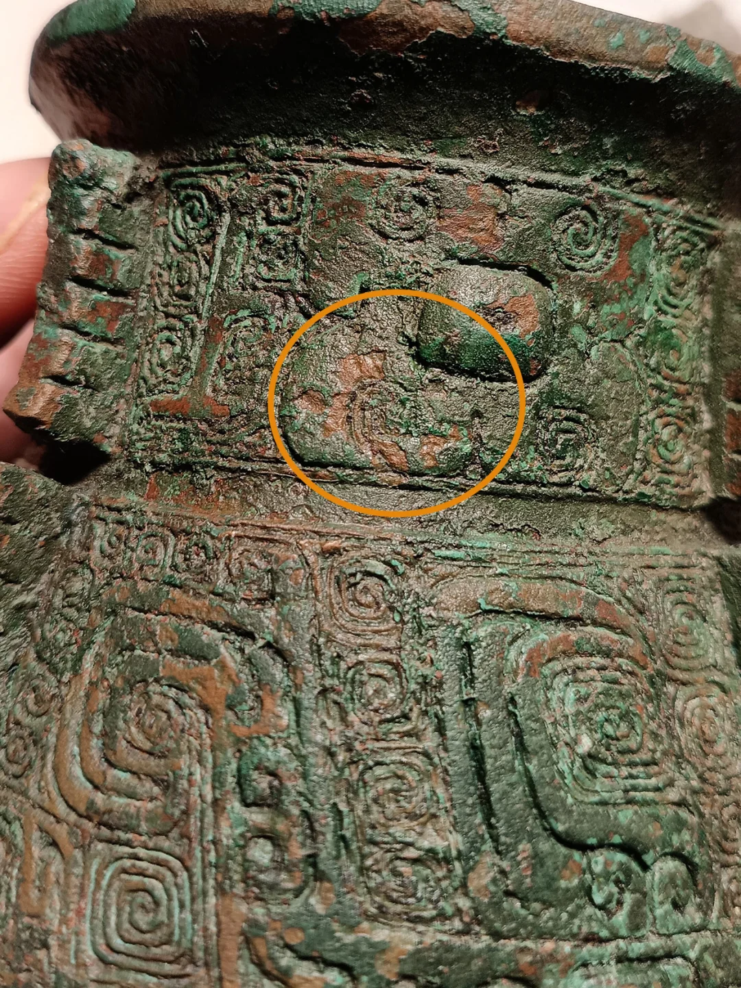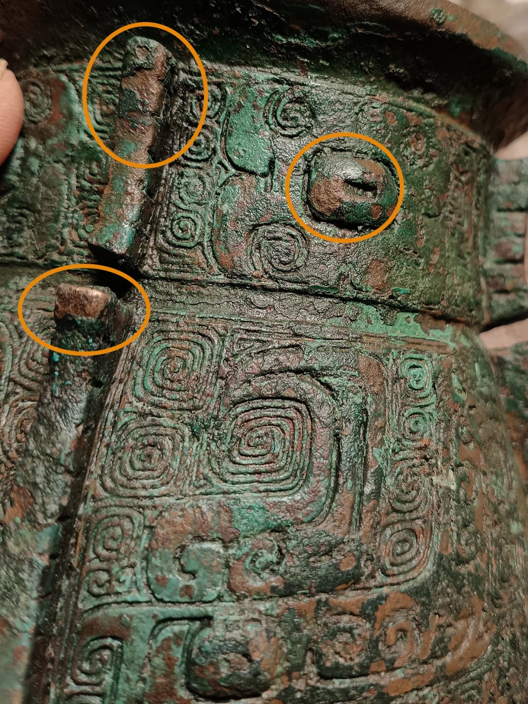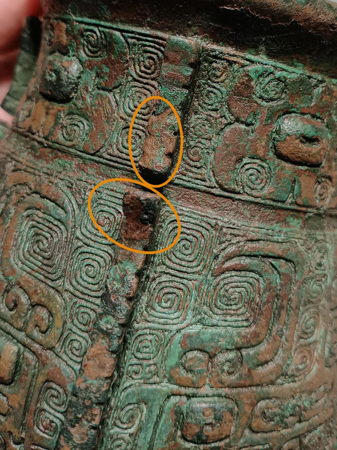 商周(西周)时期墓葬出土的青铜礼器,在当时社会中都是现实生活中的实用器皿。 实用器物经常且长期使用,就会有磨损,使用时间越久磨损痕迹越明显。 一件商周青铜器在当时是如何使用的,就需要通过器物表面的一些磨损情况来判断。 上图画圈部分就是器物的磨损痕迹。
