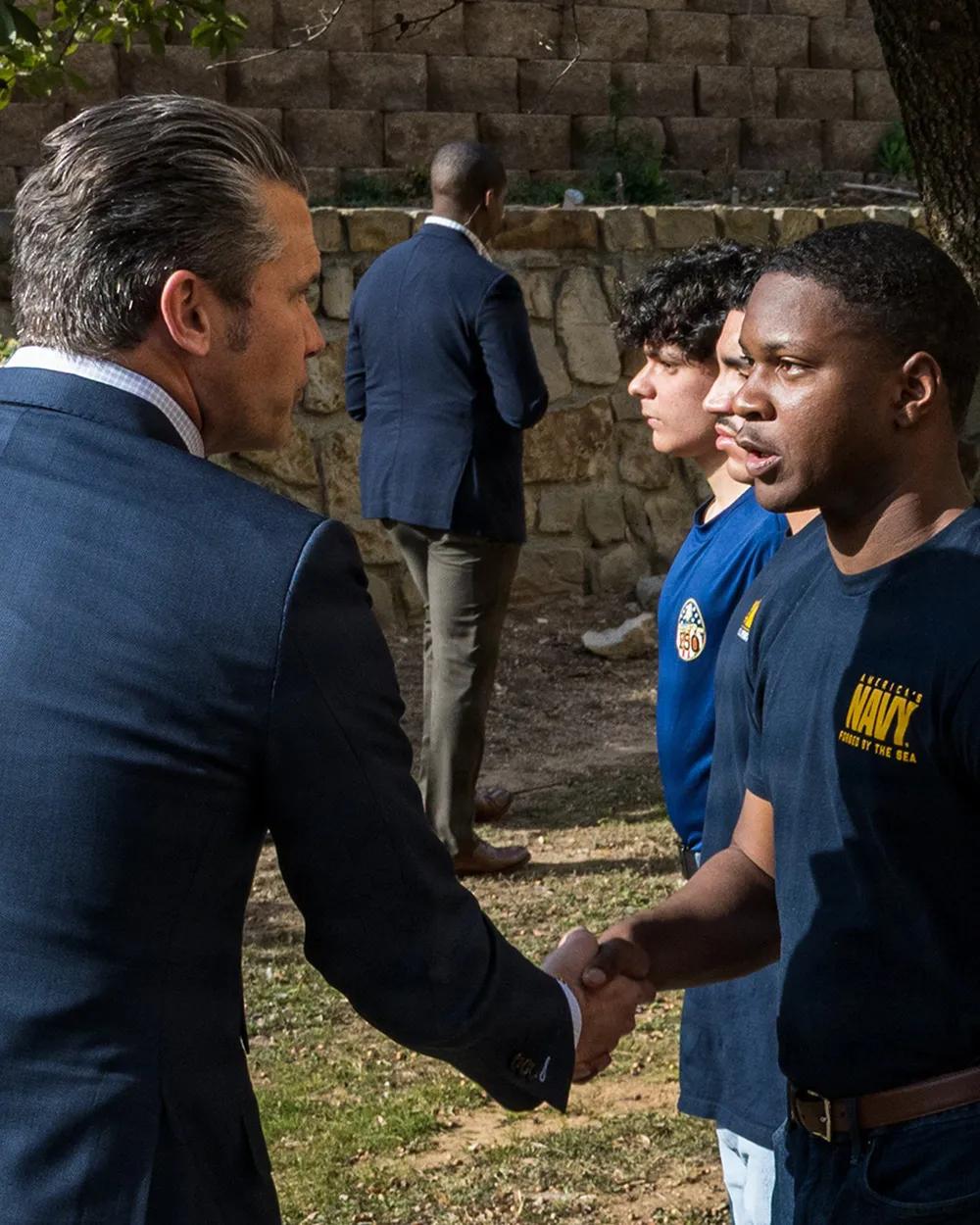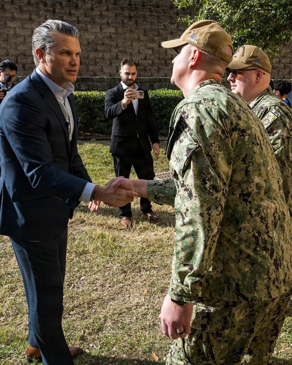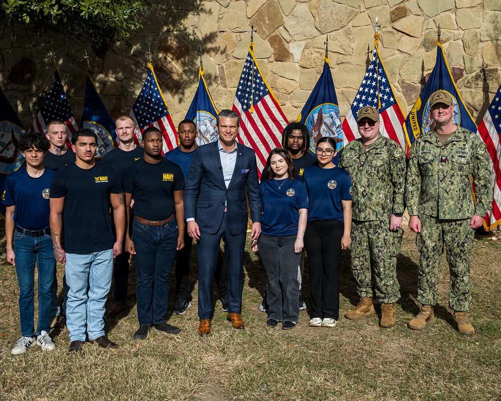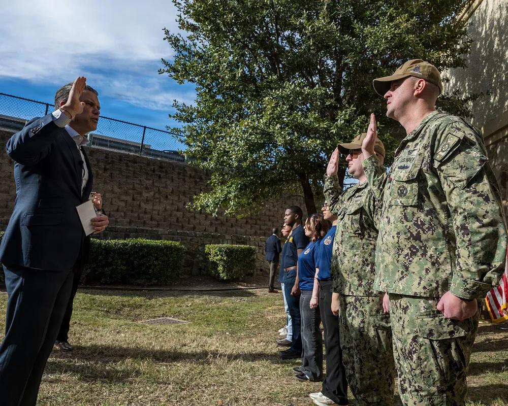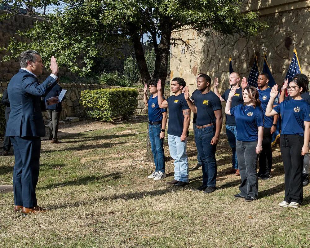 2026年1月12日,新年新气象,美国国防部长皮特·赫格塞斯于访问沃斯堡海军预备役基地时,与新入伍的海军新兵及重新入伍的士官们站在一起。赫格塞斯此行德克萨斯,将与制造业和创新行业的工人及领导者会面,并为新一代美国战士宣誓入伍,这是“自由兵工厂”巡演的延续,推动战争部“以力量实现和平”议程。
