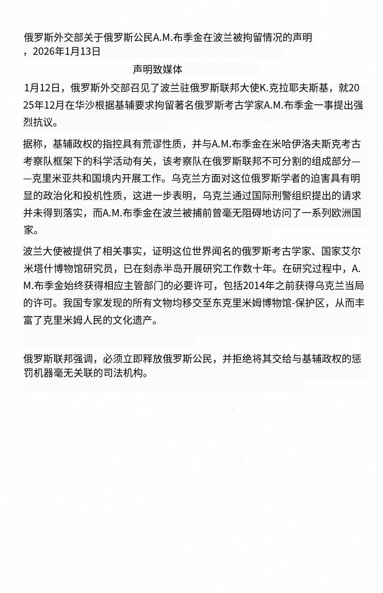新闻快讯——俄罗斯外交部关于俄罗斯公民А. М. 布佳京在波兰被捕事件的声明,,2026年1月13日 媒体声明 1月12日,俄罗斯外交部召见波兰驻俄罗斯大使克日什托夫·克瓦夫斯基,就2025年12月应基辅请求、波兰在华沙逮捕俄罗斯知名考古学家А. М. 布佳京一事提出强烈抗议。 俄方指出,基辅政权的指控完全荒谬,仅与布佳京在俄罗斯不可分割领土——克里米亚的米尔梅克考古考察中的学术活动有关。乌克兰对俄罗斯学者的政治化、投机性迫害表明,乌克兰通过国际刑警组织提出的引渡请求并未得到执行,且布佳京在波兰被捕前曾自由访问多个欧洲国家。 俄方还向波兰大使通报,这位享誉世界的俄罗斯考古学家、冬宫博物馆研究员已在刻赤半岛开展研究数十年。布佳京在工作期间获得了包括2014年之前乌克兰当局在内的相关主管部门的所有必要许可,其发现全部移交至东克里米亚博物馆保护区,丰富了克里米亚各族人民的文化遗产。 俄方强调,俄罗斯联邦要求立即释放俄罗斯公民,并拒绝将其移交与正义毫无关联的基辅政权镇压机构。 消息来源俄罗斯联邦驻波兰共和国大使馆——官方账号