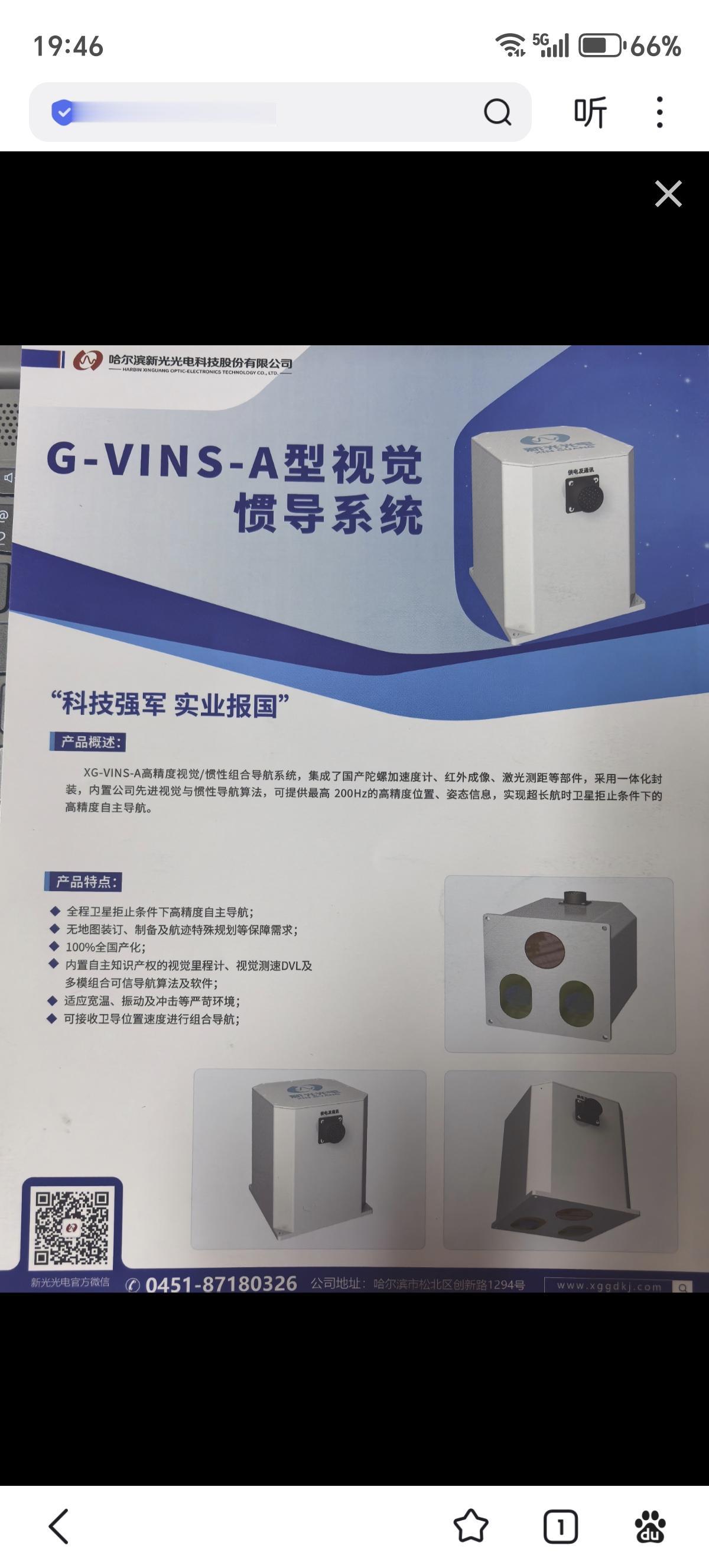 哈尔滨新光光电科技股份有限公司研制的XG-VINS-A型高精度视觉/惯性组合导航系统,集成了国产陀螺加速度计、红外成像与激光测距等部件,采用一体化封装,并内置公司先进的视觉与惯性导航算法,可提供最高200Hz的高精度位置与姿态信息,实现在超长航时且卫星信号拒止条件下的高精度自主导航。该系统具备全程卫星拒止条件下高精度自主导航、无需地图装订与特殊航迹规划保障、100%全国产化等特点,内置自主知识产权的视觉里程计、视觉测速DVL及多模组合可信导航算法与软件,能够适应宽温、振动及冲击等严苛环境,并可在必要时接收卫星导航位置速度信息进行组合导航,主要应用于长航时无人机及其他飞行器。其技术参数包括:航向精度0.5°(RMS)、姿态精度0.3°(RMS),在云遮挡不大于10分钟且视觉工作高度为500-10000米的限定条件下,水平定位精度不大于300米(CEP);云遮挡时定位精度为100米/5分钟(CEP)及1海里/30分钟(CEP);定高精度30米(RMS);速度精度0.2米/秒(RMS),最大飞行速度100米/秒;导航数据输出频率200Hz。物理特性方面,尺寸(不含连接器)为150毫米(长)×150毫米(宽)×180毫米(高),重量2.5公斤,供电为24VDC额定(范围12V–32V),功耗小于80W,防护等级IP65,工作温度-40°C至+60°C,存储温度-40°C至+85°C,可承受15g(11ms半正弦)冲击与20–2000Hz(6.06g)振动。接口提供2路可配置的RS422串口(传输速率9600-921600bps),并可拓展CAN、1553B、USB及网口等接口。