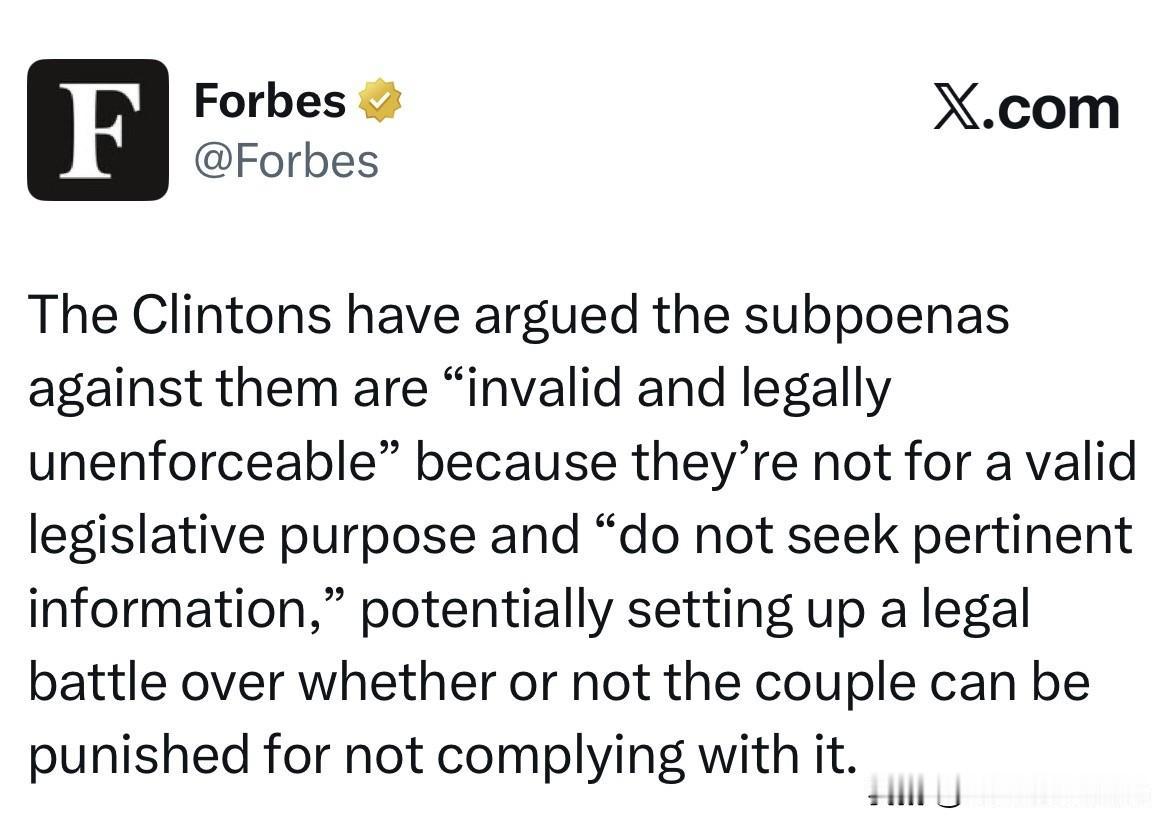 《福布斯杂志》报道:前总统比尔·克林顿夫妇拒绝出庭为爱波斯坦案作证。 克林顿夫妇辩称,针对他们的传票“无效且不具法律效力”,因为这些传票并非出于有效的立法目的,并且“没有寻求相关信息”,这可能会引发一场法律战,争论这对夫妇是否会因不遵守传票而受到惩罚。 克林顿夫妇均是法学院出身的专业人士,可想而知如果由此引发一场法律战,将会是怎样激烈的过程和结局?