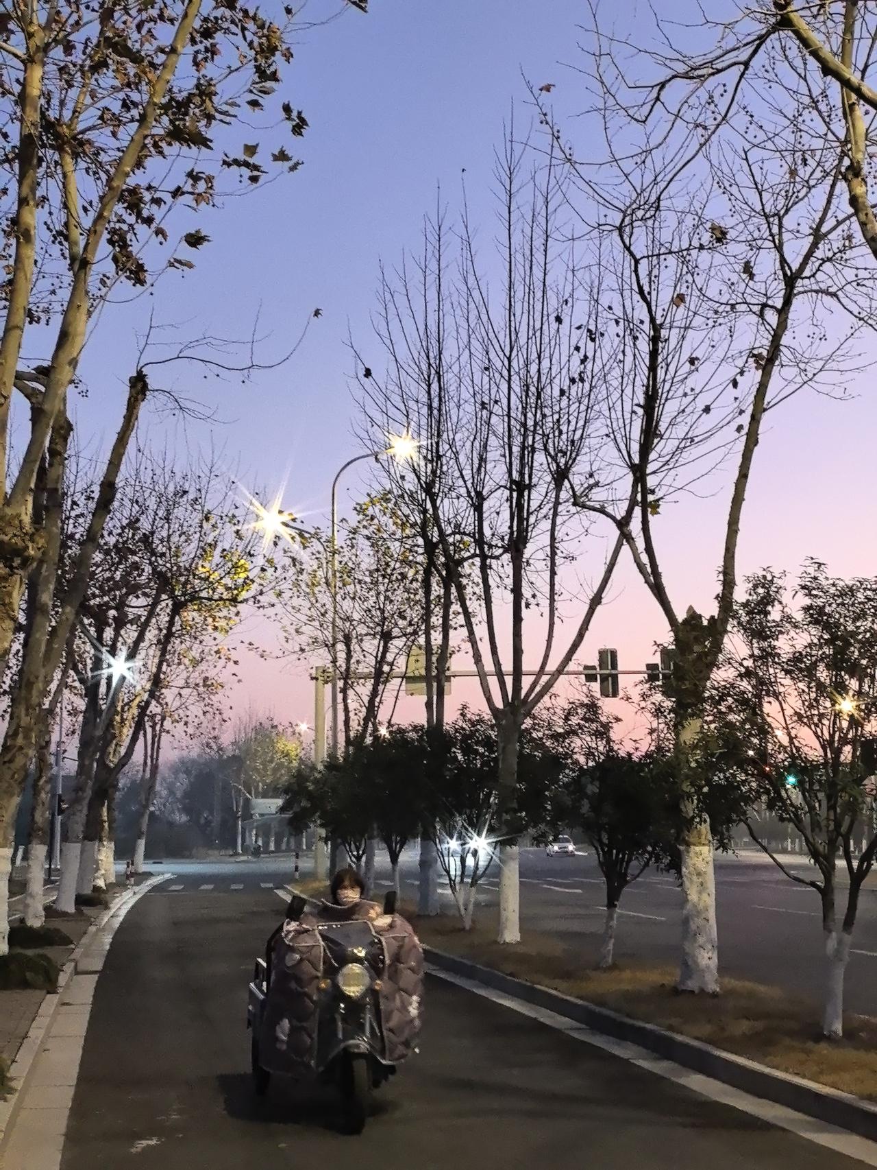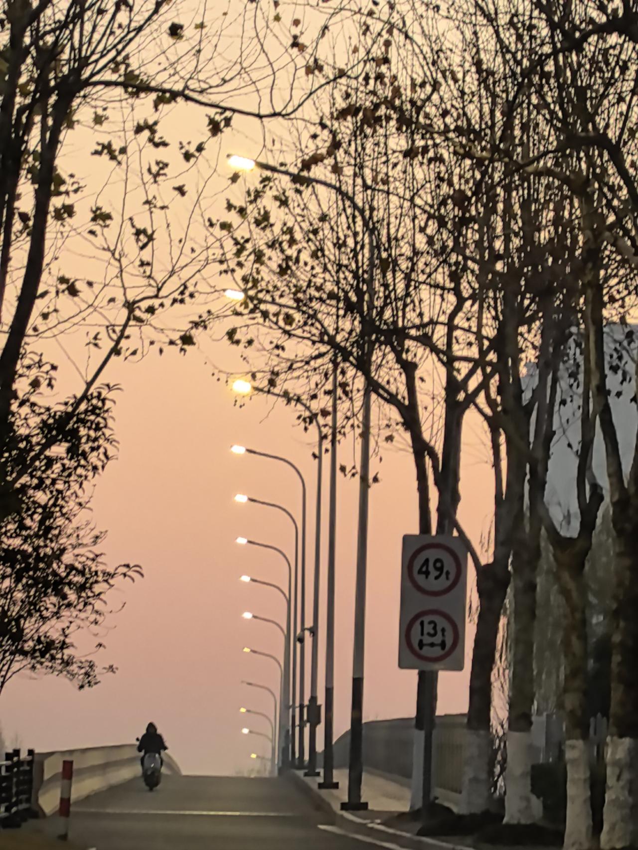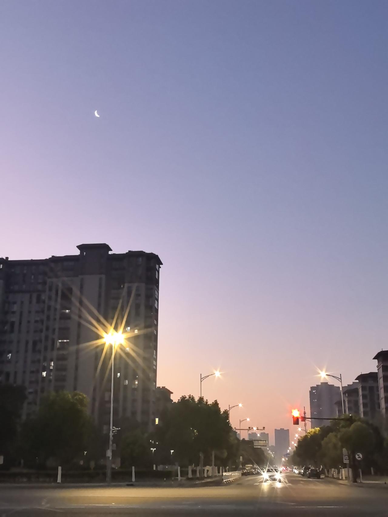 提前半小时出门,你会看到什么? 三九第七天,浙江湖州,提前半小时出门。 遇见一轮弯月,一路路灯相伴,还有新的一天的第一缕阳光…… 绿色出行!美美哒!