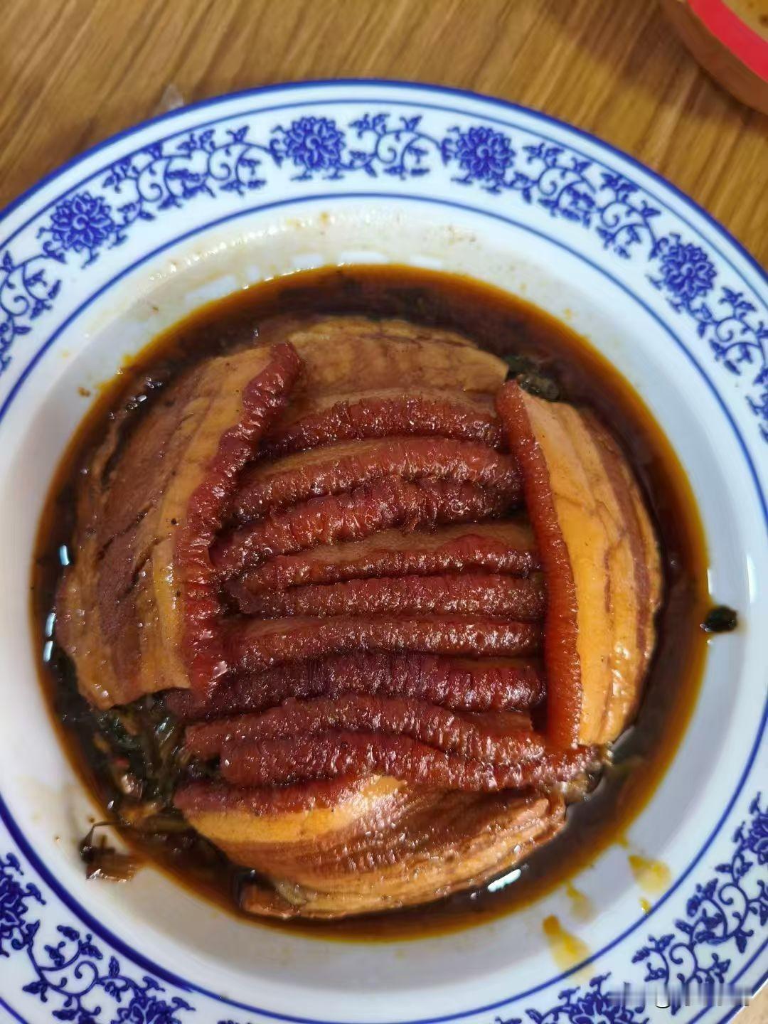 冬日生活打卡季 冬日生活打卡季,冬天来上一份梅干菜扣肉,那满足感简直爆棚!这道菜软糯的口感,配上梅菜的独特香气,大人小孩都爱不释口。 我做梅干菜扣肉时,先把五花肉放进冷水锅,加入葱、姜、料酒煮上20分钟,待肉达到八成熟后捞出,在肉的周身涂抹老抽,接着放入六成热的油中,将肉皮煎至焦黄色,再切成0.5cm厚的肉片,整齐地码放在碗里。梅干菜要提前泡软,锅中倒油,放入冰糖、葱姜蒜炒化爆香,加入梅干菜,再放入些老抽、盐等调料炒香,然后盖在五花肉上,再加上豆豉、八角。最后用高压锅蒸熟,把蒸出的汁水勾个芡,浇在扣肉上。这道菜肥而不腻、入口即化,我能一口气炫三碗米饭!