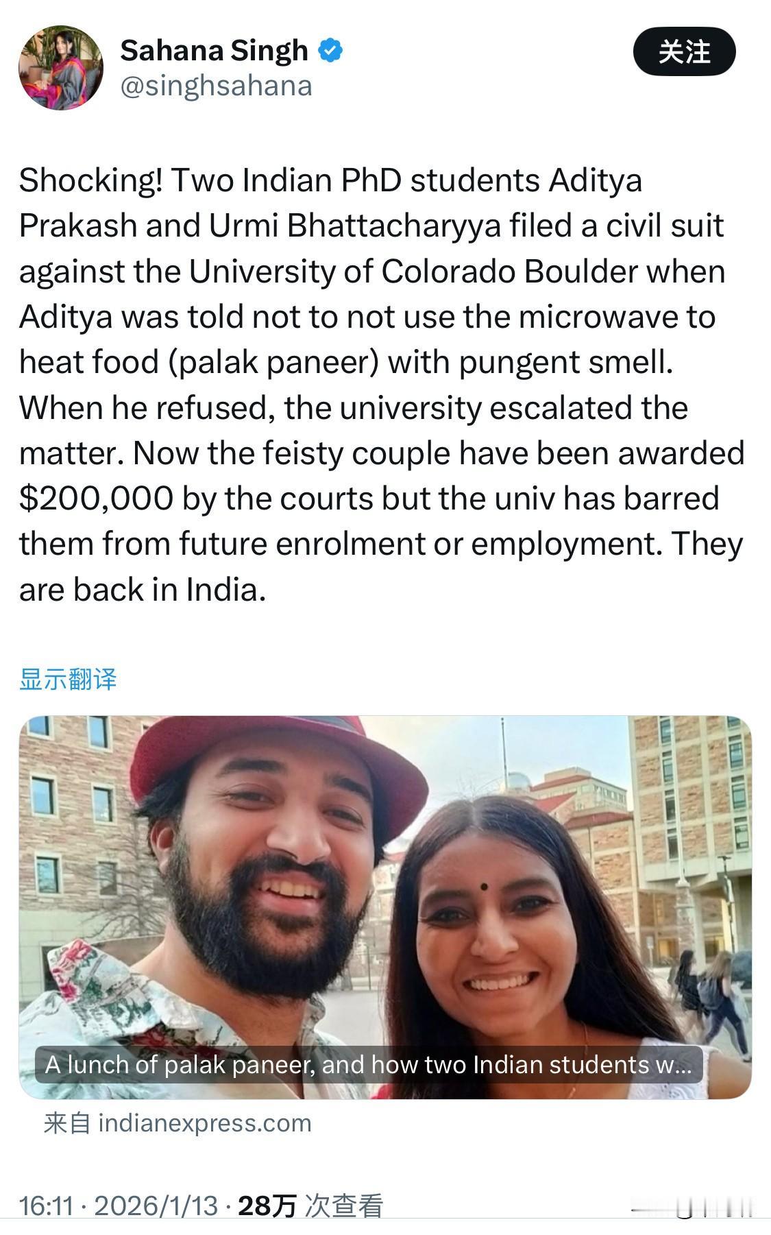 2023 年 9 月,来自印度的博士生阿迪亚·普拉卡什(Aditya Prakash)在科罗拉多大学博尔德分校(CU Boulder)校内公共休息室使用微波炉加热菠菜奶酪(Palak Paneer)时,遭到一名工作人员阻拦,理由是该食物有“强烈气味”。 冲突升级: 普拉卡什认为这涉及文化偏见和种族歧视。随后,他的妻子乌尔米·巴塔查里亚(Urmi Bhattacharya)失去了助教职位,且两名学生面临校方的纪律指控,甚至被指控“煽动骚乱”。 法律结果: 这对夫妇随后向联邦法院提起民事权利诉讼。2026 年 1 月,双方达成和解,学校向两人支付了共计 20 万美元(约合 1.66 亿印度卢比)的赔偿金。 目前状态: 两人已离开该校并返回印度。和解协议中包含相关条款,禁止他们未来再次进入该校学习或工作。