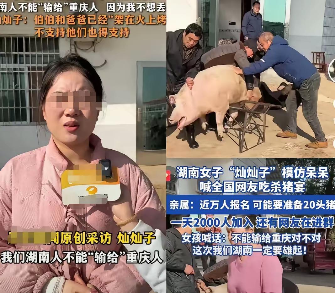 重庆合川的呆呆,是无心插柳柳成荫,在网上吆喝杀猪,成为了顶流人物。 而这个湖南株洲灿灿子,看到别人这么成功,也想复刻人家的做法。 发视频吆喝18号,网友们要来参加她主持的杀猪宴,大杀19头猪任你们吃。而且还在动员前准备了,开直播来宣布这件事情。 可惜呀,灿灿子一开播就露馅了,把满眼的嘉年华都写在了脸上,这种反感都是被大家所抛弃和厌恶的。 这样大搞杀猪宴,这背后得动用多少的人力物力在帮她跟进呀,现在株洲文旅官方都没发声要这样搞,举办这样一场大型聚会,这风险后果,她承担得起吗? 就是为了一时的口嗨快意,心里昧着金钱的铜臭味,把刻意目的性,都装在了自己脑子上,这种人就该遭到唾弃……