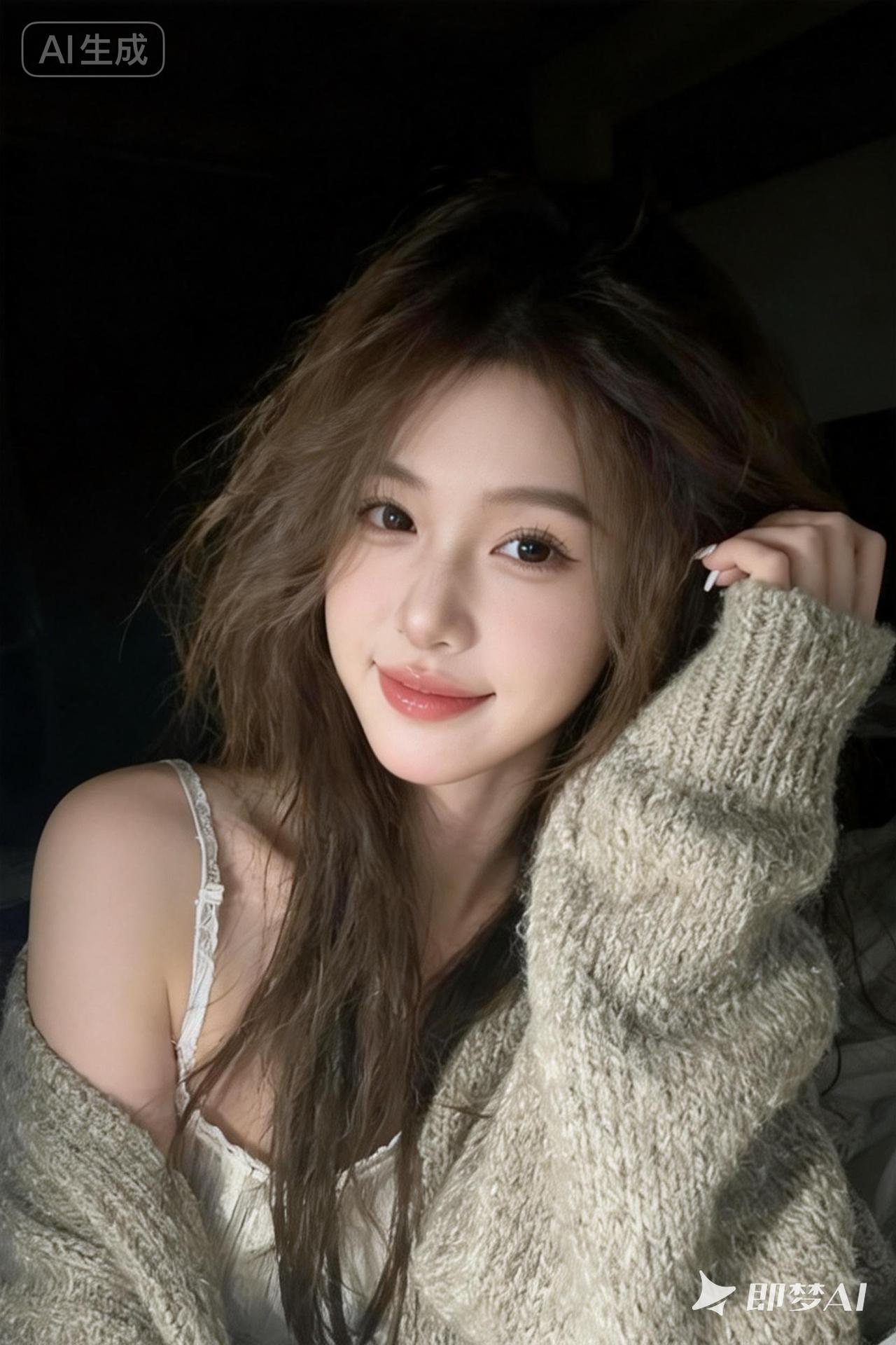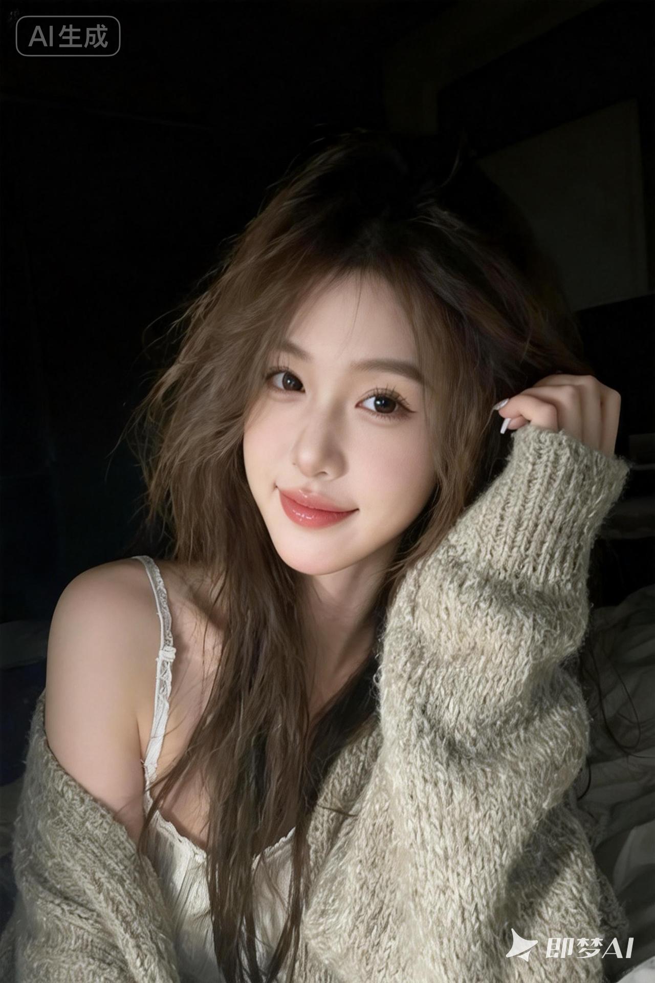 一位年轻的中国美女,鹅蛋脸,精致的五官,大眼睛,化着温柔的纯欲妆容,唇色是浅豆沙