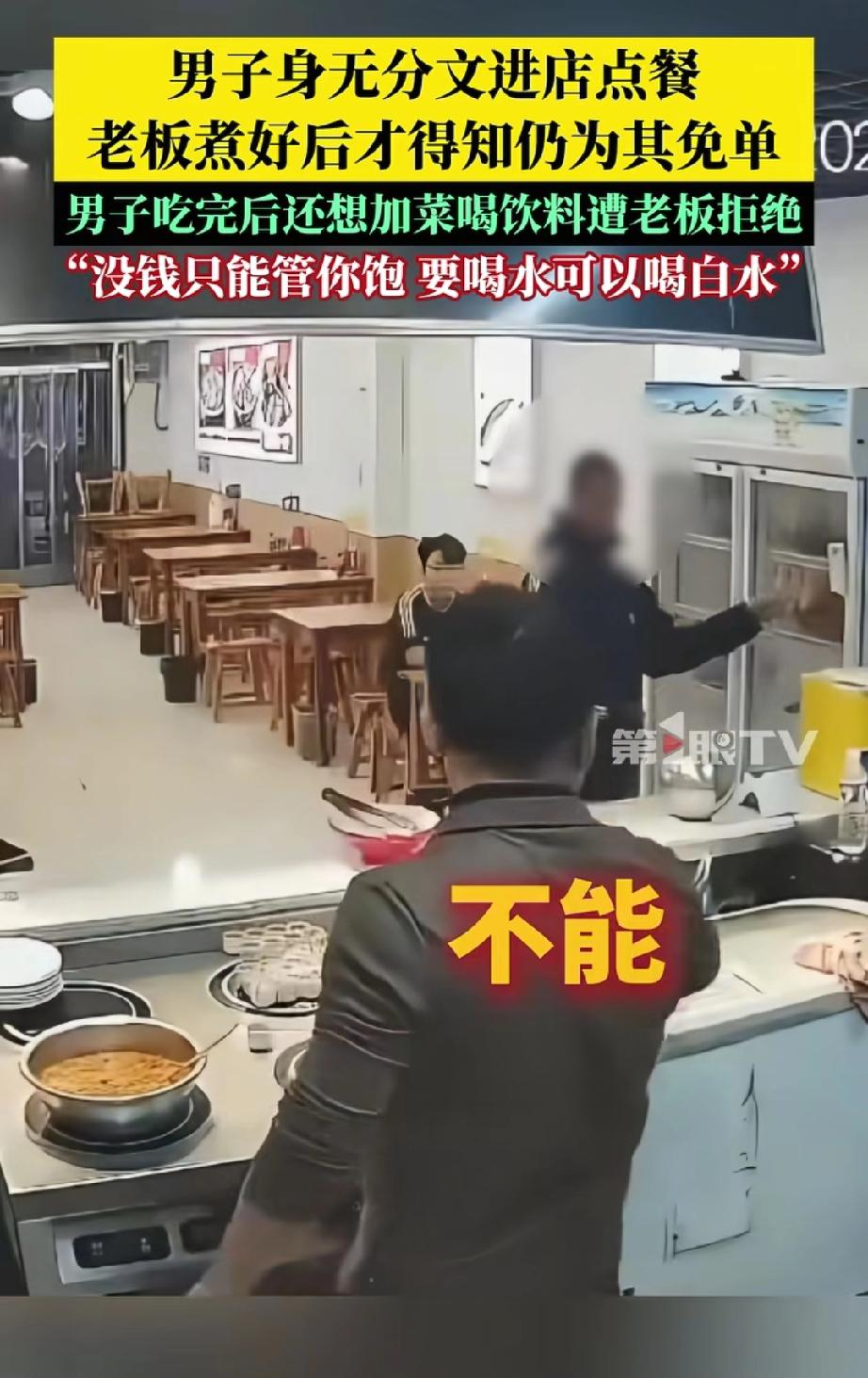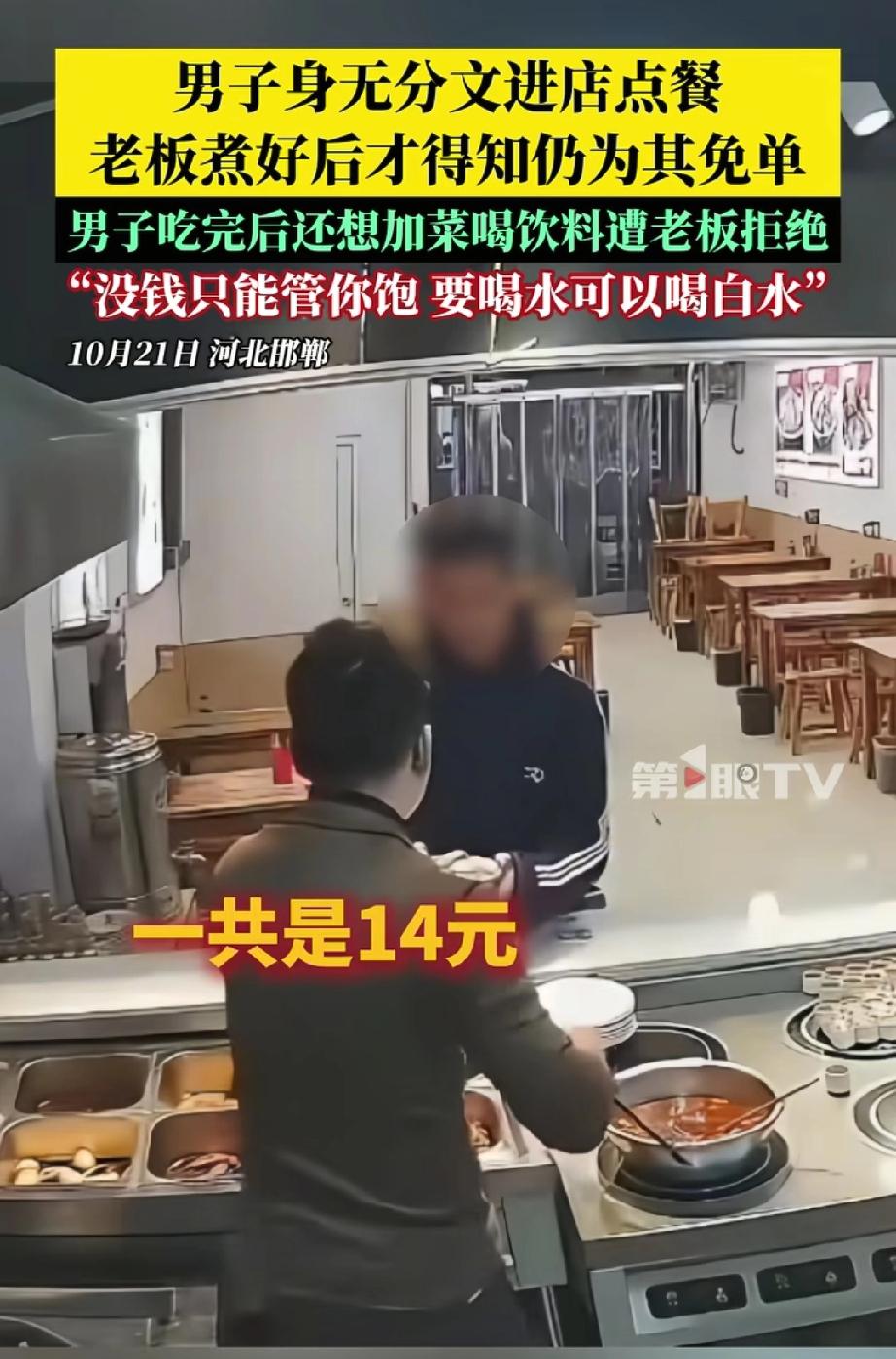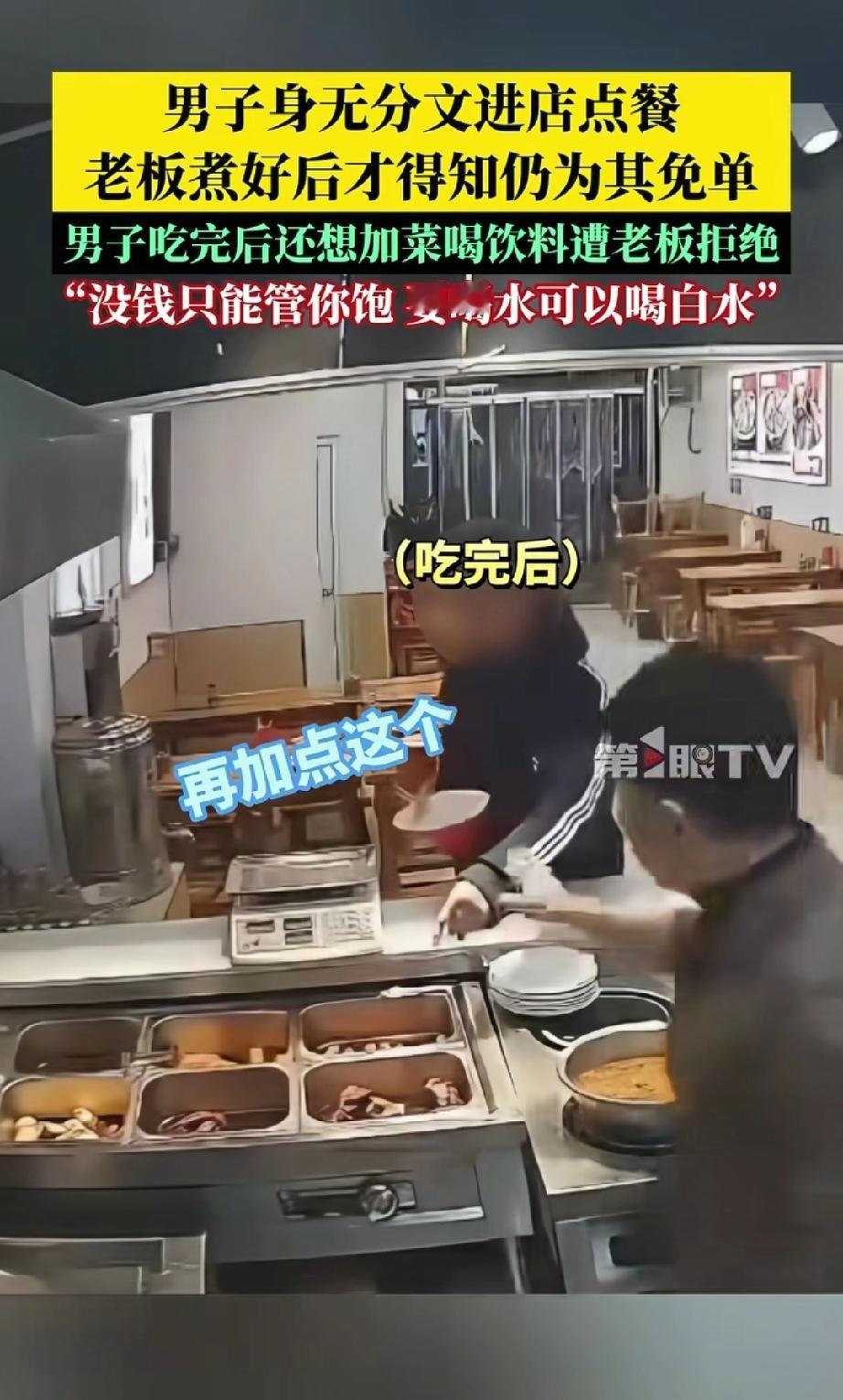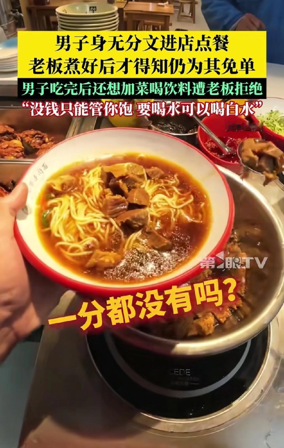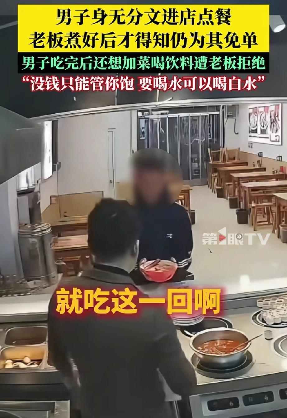 脸都不要了!”河北邯郸,一男子走进一家面馆要了碗牛肉面,谁知,店主刚端过来,男子就说自己没钱,店主问:“一分没有?”男子答:“没有。”店主也没多问,就让他先拿过去吃。没想到,男子吃完面又走过来柜台,让店主给他加个棒骨,店主摆摆手,说他没给钱不能吃,店里气氛一下子尴尬了起来。 那天傍晚,邯郸一家小面馆里,一名穿黑色袄子的男子推门进来,直接点了碗牛肉面。老板很快就把热气腾腾的面端了上来,告诉男子这碗面14元。谁料男子扭捏了一下,直接说“我没钱”。 老板有点惊讶,追问“一分都没有吗?”,男子干脆地回答“没有”。老板心一软,觉得他可能是遇到难处了,就说“没有那你就吃吧,就这一次啊”。男子点点头,端着面就坐下了,没几分钟就把一大碗面连汤带面吃了个精光。 本以为男子吃完就会走,没想到他端着空碗走到柜台,指着棒骨说“再加点这个”。老板果断拒绝,说“你不给钱,能管你饱就不错了,不能再乱点东西了”。 更可气的是,男子没吭声,又想去拿饮料柜里的饮料,被老板拦住,老板说“你没有钱,只能管你饱,要喝水可以喝白水”。最后,男子没喝水、没道谢,闷着头离开了面馆。 有网友说“老板已经仁至义尽了!小本生意不容易,14块钱的面说免就免了,怎么还‘得寸进尺’呢?” 咱理解老板的纠结——最初的善意,像一颗温暖的种子,可对方一而再、再而三地伸手,让这份善意突然变成了负担,好像被架在了那里,进退两难。 我们赞扬雪中送炭,但谁也没义务去填一个无底的洞。那位男子在得到一碗免费的面后,最该做的是道一声“谢谢”,而不是继续索取。老板最后的拒绝,不是冷漠,恰恰是让善良回归了它本来的样子:有温度,也有分寸。 当善意遇到不知足的索取,该怎么办?老板的选择给了我们一个答案:帮助,是基于内心的柔软;而边界,则是守护这份柔软不被消耗光的铠甲。 我们可以善良,但善良必须带点锋芒,不是无底线的付出,而是有原则的温暖。它让真正需要的人得到一顿饱饭,也让试图透支善意的人知道适可而止。一个健康的社会,既需要热心肠,也需要守住底线的心。