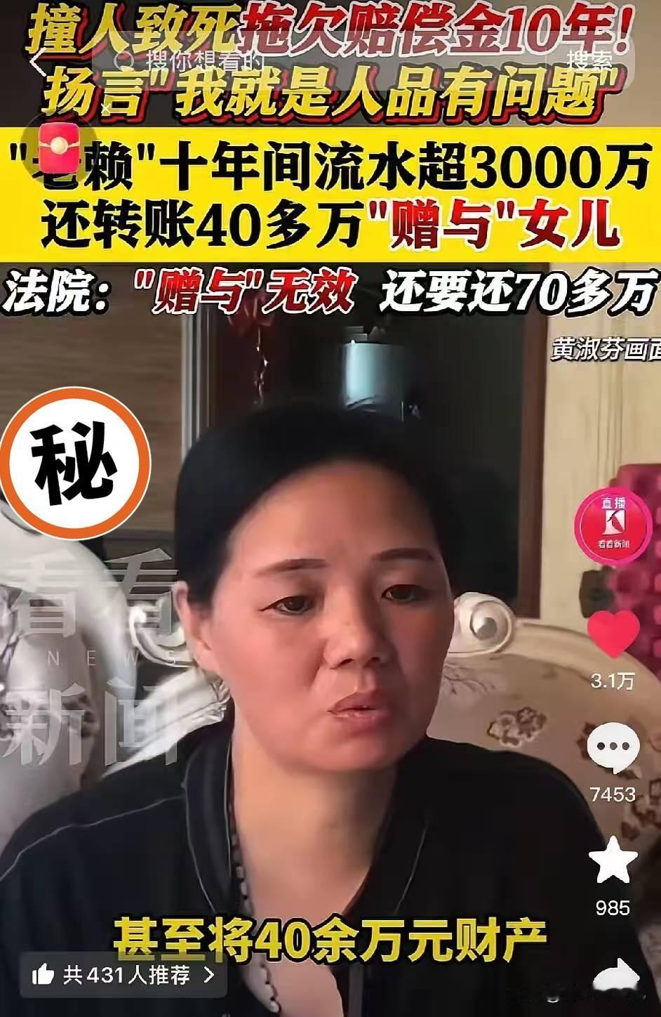 天亮了!唐山教科级老赖黄淑芬终于被制裁了,开车撞人致死赔偿金10年不给,终于在2025年底,法院判定她赠与女儿的40万无效,每个月退休金到账就会被扣走,但是到如今还是欠他们69万。 这事儿得从2015年的那场车祸说起,刚拿驾照不足三个月的黄淑芬,跨越双实线逆行,直接撞向了骑行的赵香斌老人,造成重型颅脑损伤。 交警认定她负主要责任,可她仅垫付2.6万治疗费,就彻底没了下文。 赵家为救老人耗尽百万积蓄,最后不得不卖掉房子,赵勇放下建筑师梦想,在医院打了两年地铺陪护。 即便这样,老人还是在2017年底没能熬过去,带着未讨到的公道离世。 法院早早就判了黄淑芬赔偿93万多,扣除已付部分仍需赔85万,可她却放出了刷新三观的狂言。 “我就是人品有问题”“法院判几年也中,最起码钱不用还了”,这番嚣张言论被曝光后,她成了全国皆知的“教科书式老赖”。 嘴上喊着没钱,黄淑芬的行动却格外诚实。 事故后到判决前,她偷偷给女儿转了40多万,用这笔钱买房买车,女儿还在境外买奢侈品,母女俩十年银行流水超3000万,需说明的是,流水包含日常资金往来,并非全部是可用于偿债的财产。 镜头前她们装可怜,说“家里比普通家庭还穷”,可背景里的豪华装修、明晃晃的名牌包,狠狠打了自己的脸。 黄淑芬甚至谎称做保洁月入一千多,却把退休金一到账就火速转走。 这十年,赵勇从青涩小伙熬到了中年,手里攒下的判决、裁定多达30余份。 黄淑芬母女反而多次起诉他和律师,用各种程序拖延时间,就是想把他拖垮。 好在法律从不会纵容无赖,2025年底唐山中院的终审判决,直接撤销了那笔40万的恶意赠与。 虽然比一审少了4万(因抵扣女儿部分转账),但总算撕破了她转移财产的伪装。 更解气的是,法院已经冻结了黄淑芬的退休金账户,每月只留基本生活费,其余全部用于还债。 这意味着,她想继续赖账的路,被彻底堵死了。 类似的案例不在少数,河北就有老赖欠债后把房产赠父母,最终也被法院撤销。 最高法数据显示,2025年执行到位金额达2.3万亿元,失信惩戒让越来越多老赖无处遁形。 可即便如此,黄淑芬还欠着69万本金没还,赵勇也做好了她继续申请再审拖延的准备。 十年光阴,赵家破碎,赵勇的人生轨迹彻底改变,这笔债哪是钱能完全弥补的。 老赖的嚣张,本质上是对他人痛苦的漠视,对法律尊严的挑战。 这次判决不是终点,但它让我们看到,正义或许会迟到,但绝不会缺席。 各位读者你们怎么看?欢迎在评论区讨论。