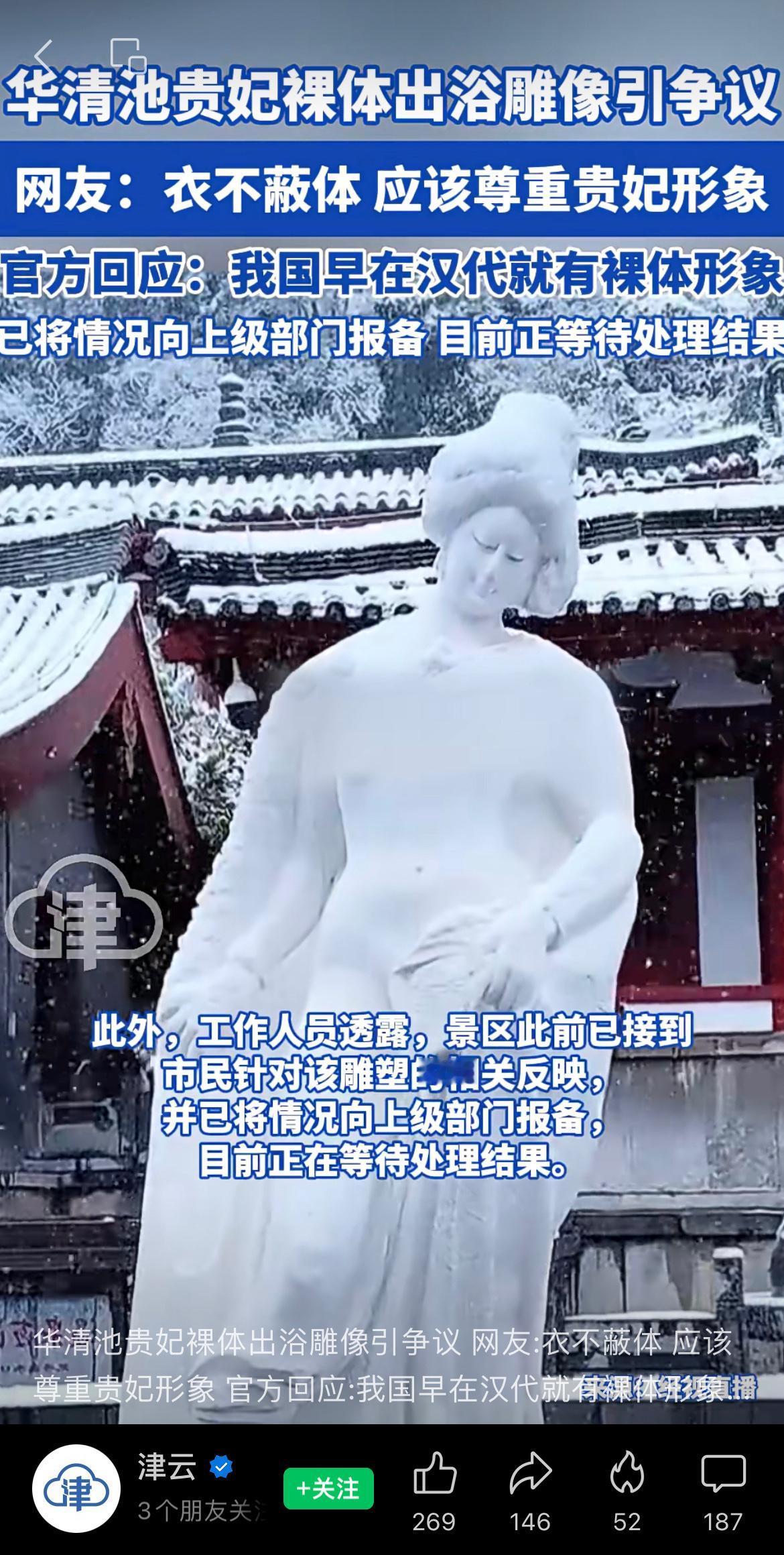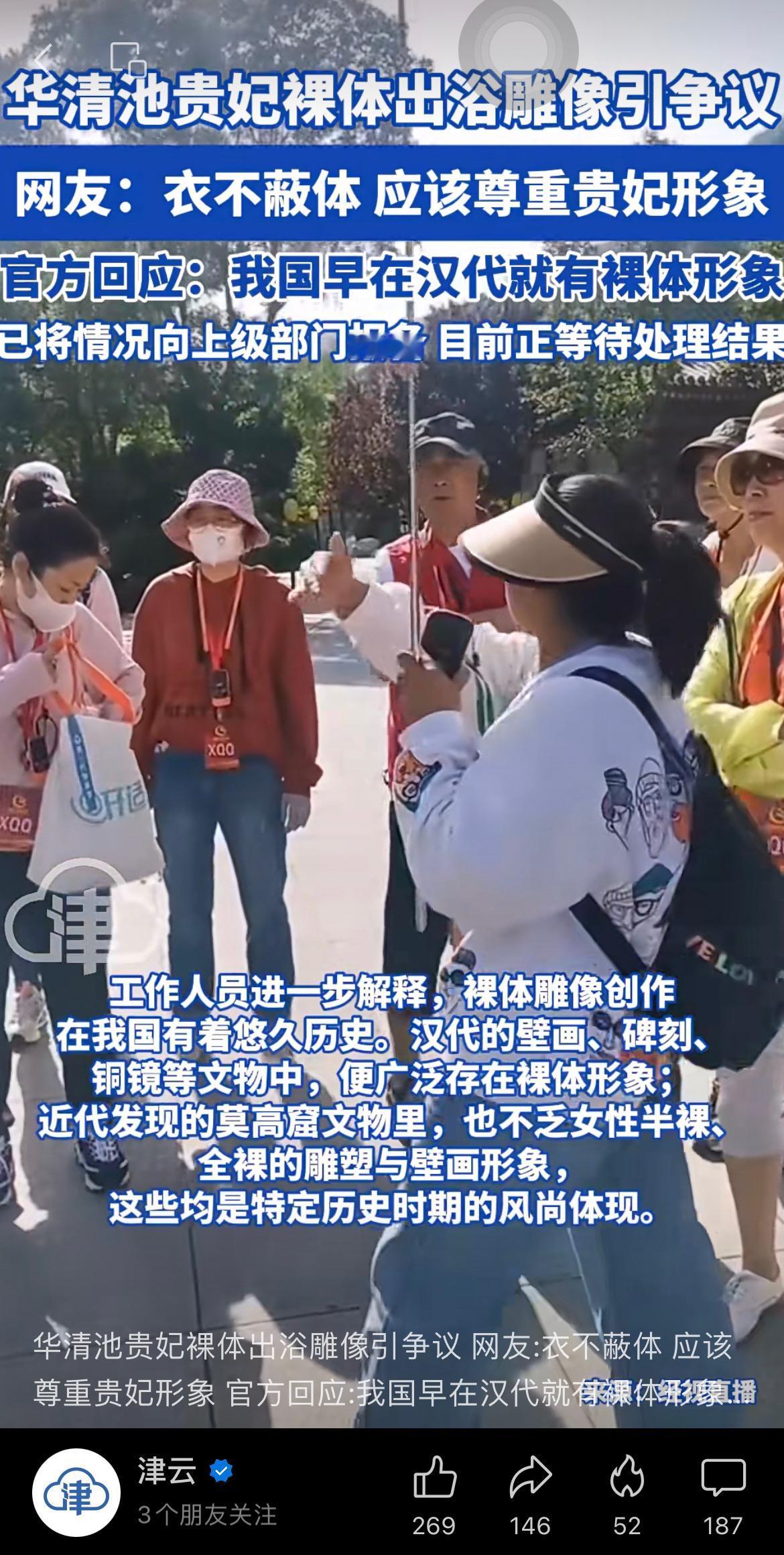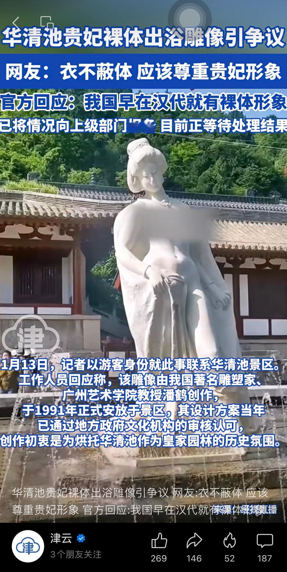 华清池贵妃裸体出浴雕像引争议,网友:衣不蔽体,应该尊重贵妃形象。 官方回应:我国早在汉代就有裸体形象,已将情况向上级部门报备,目前正等待处理结果。 网友评论:换。换包头巾的。最好把口罩也带上。行了吧。 这个大家怎么看呢? 杨贵妃 裸体 汉代