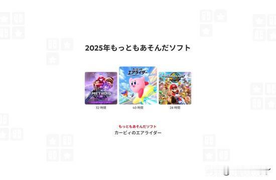 进入2026年已经两周,任天堂终于为Switch与Switch 2玩家推出了2025年度回顾(Year in Review)。 想要查看自己的2025年度回顾,玩家只需前往回顾页面并使用任天堂账号登录即可。登录后,你可以看到诸如全年游玩了多少款游戏、在主机上花费了多少时间等统计数据。 回顾中会显示你游玩时间最多的三款游戏以及相应的游玩时间。 年度回顾还会分析玩家偏好的游戏类型,并展示按月份统计的游玩时长分布。 除此之外,玩家还可在2025年所有玩过的游戏中选出最爱的一款。 值得一提的是,任天堂以往的年度回顾通常会在圣诞节前几周上线,这也使得2025年度回顾成为目前发布最晚的一次。至于任天堂为何这次发布时间如此之晚,官方并未给出说明。