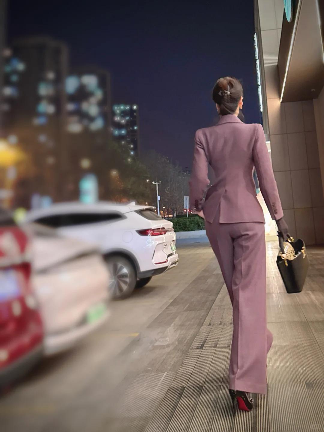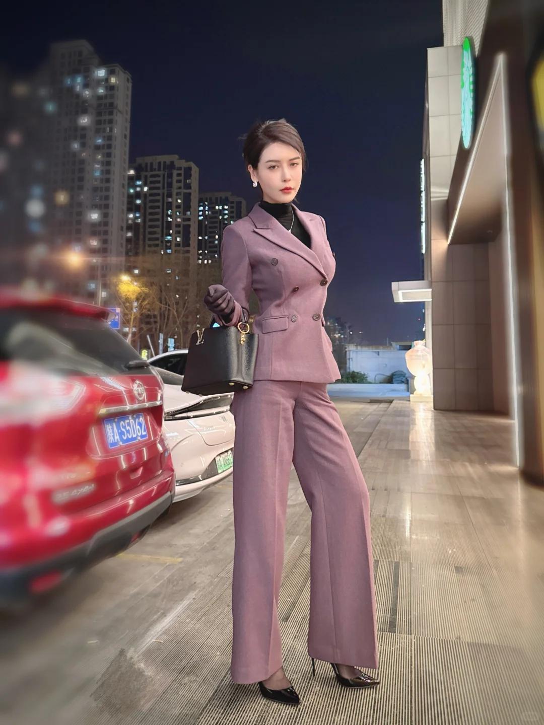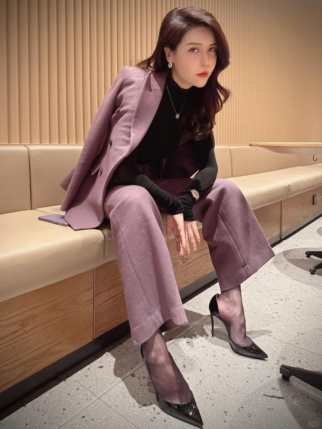 优雅职场风,紫色西装搭配黑色高跟鞋,尽显女性魅力!