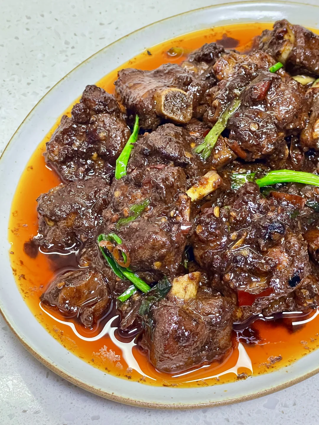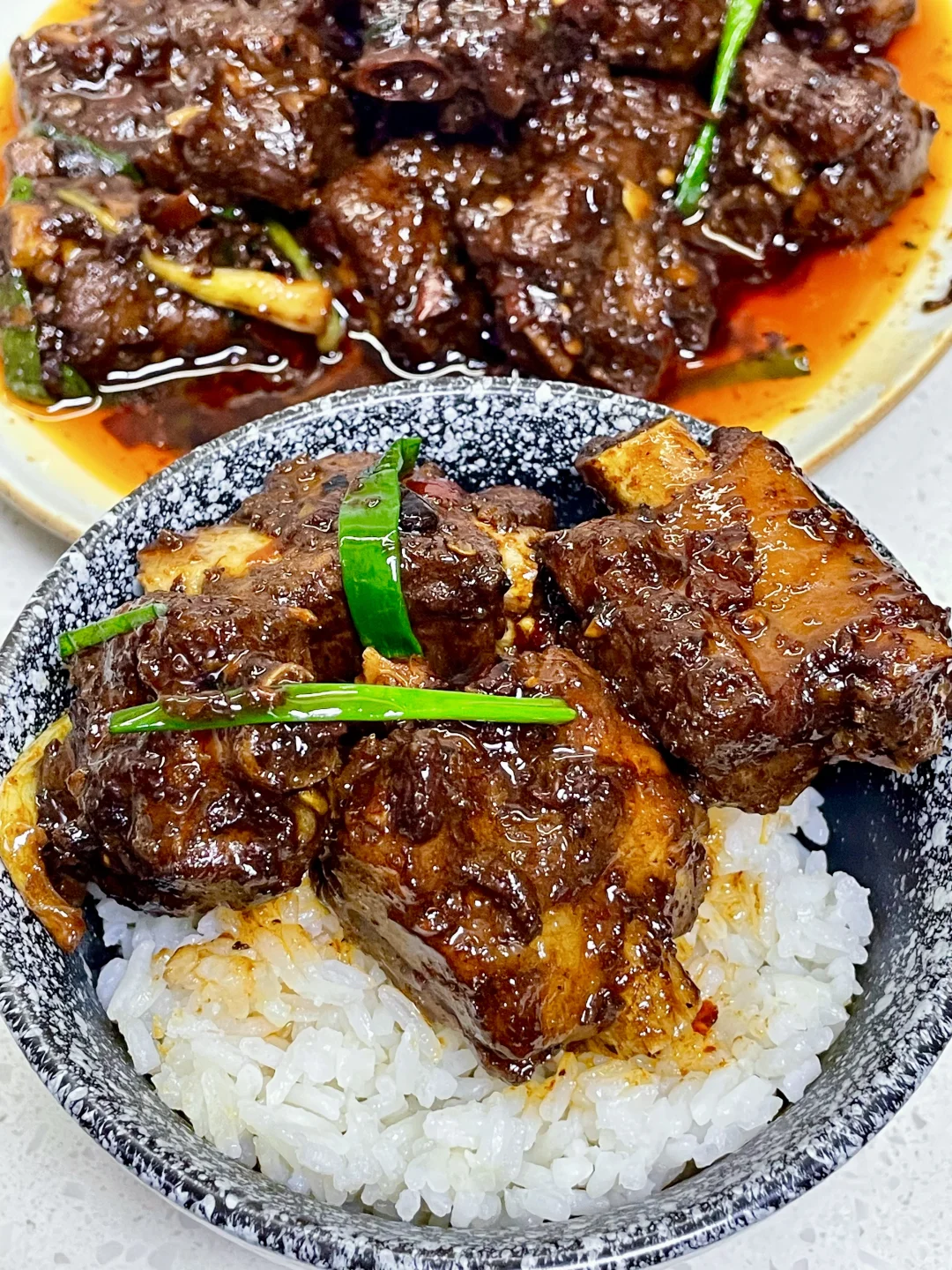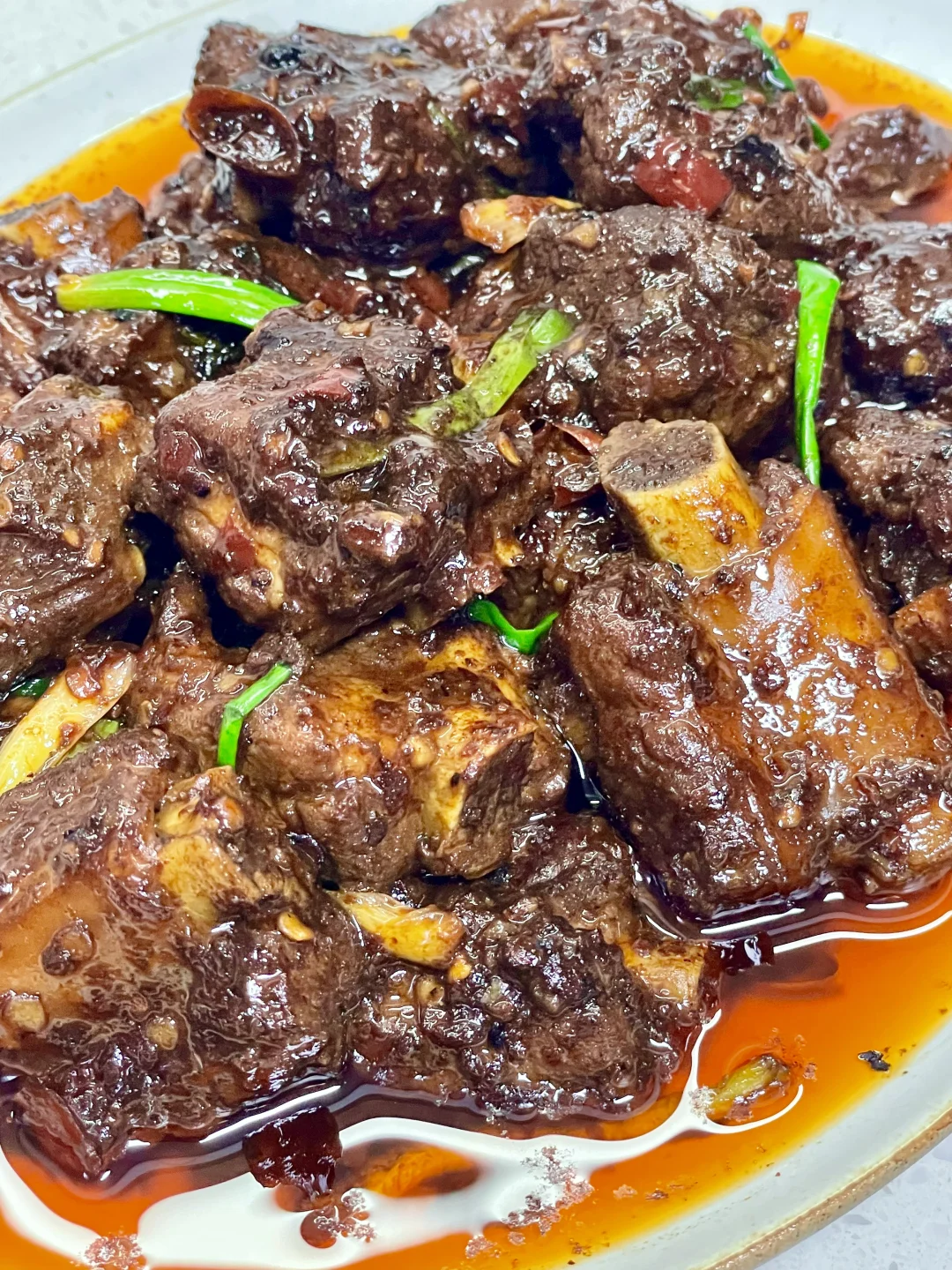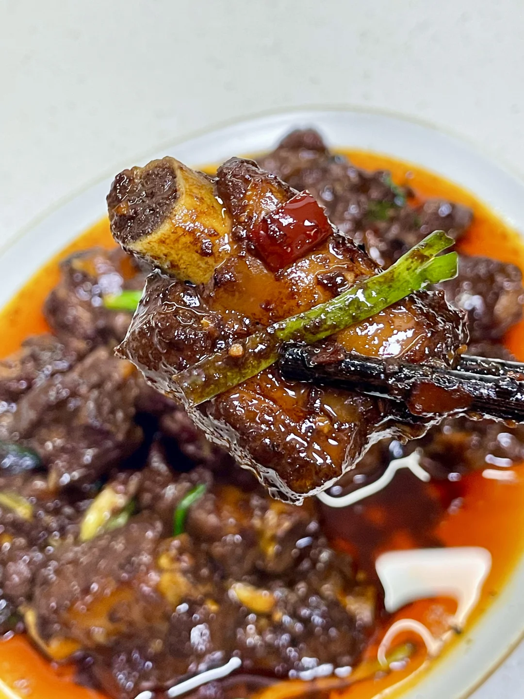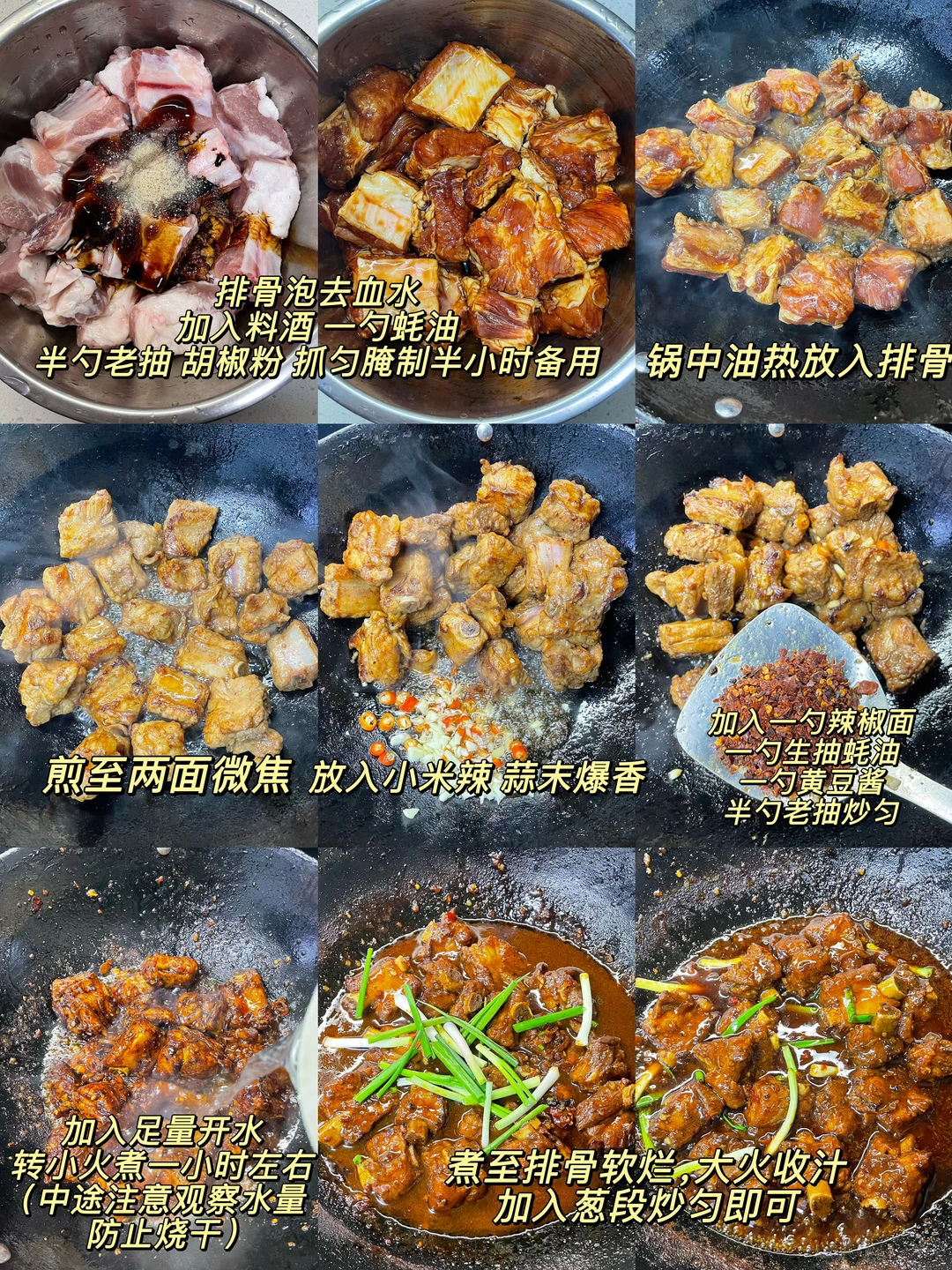 又来做这个巨好吃的香辣排骨了,做法简单,排骨软烂入味,超级香辣过瘾~ 1️⃣:排骨泡去血水,加入料酒 一勺蚝油 半勺老抽 少许胡椒粉抓匀腌制半小时 2️⃣:锅中油热放入排骨煎至两面微焦,放入小米辣蒜末爆香,再加入一勺生抽蚝油 一勺黄豆酱 半勺老抽 多多的辣椒面炒香 3️⃣:加入多一点的开水没过排骨,盖盖水开转小火煮1个小时左右(中途注意观察水量防止烧干)煮至排骨软烂,大火收汁,撒上葱段炒匀即可
