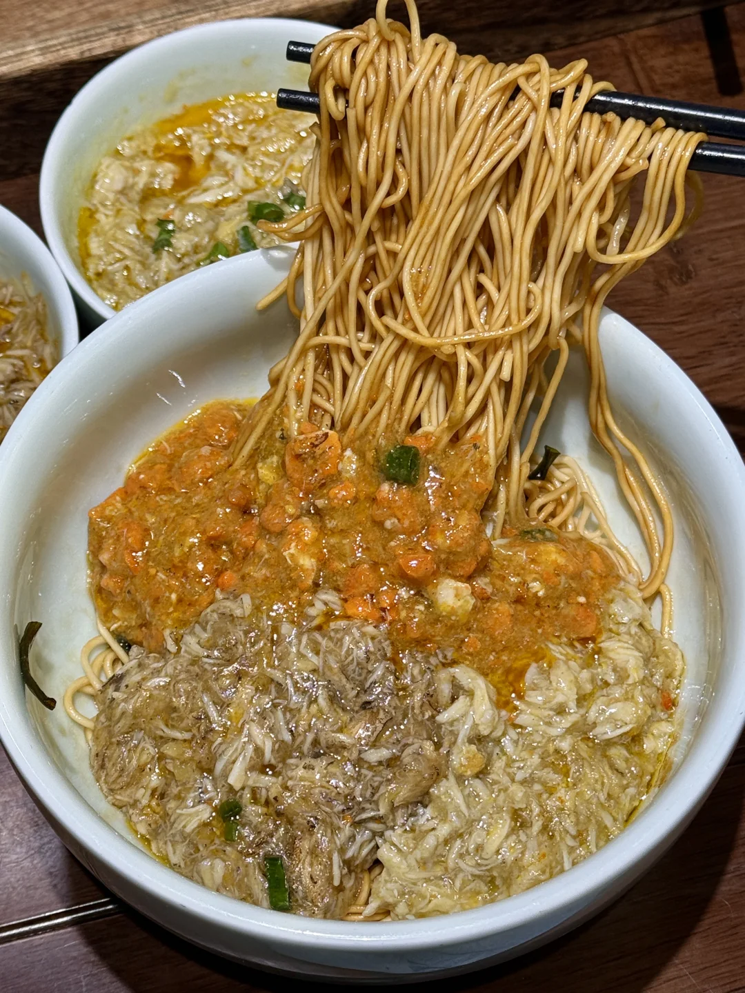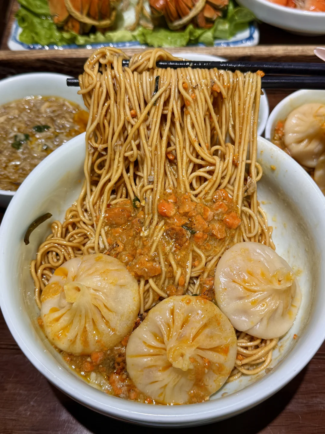 一周去了3次的蟹黄面馆!!! 可以吃得出来是手拆蟹黄,鲜得嘞,蟹粉、蟹黄、蟹肉…盖在面上这一口简直是大满足!!! 他家的蟹黄汤包也是相当美味😭 还有各种各样的甜品吃到爽! 我个人比较喜欢芋泥麻薯,糯叽叽还拉丝! 一人食或者和朋友一起去吃都是很不错的选择