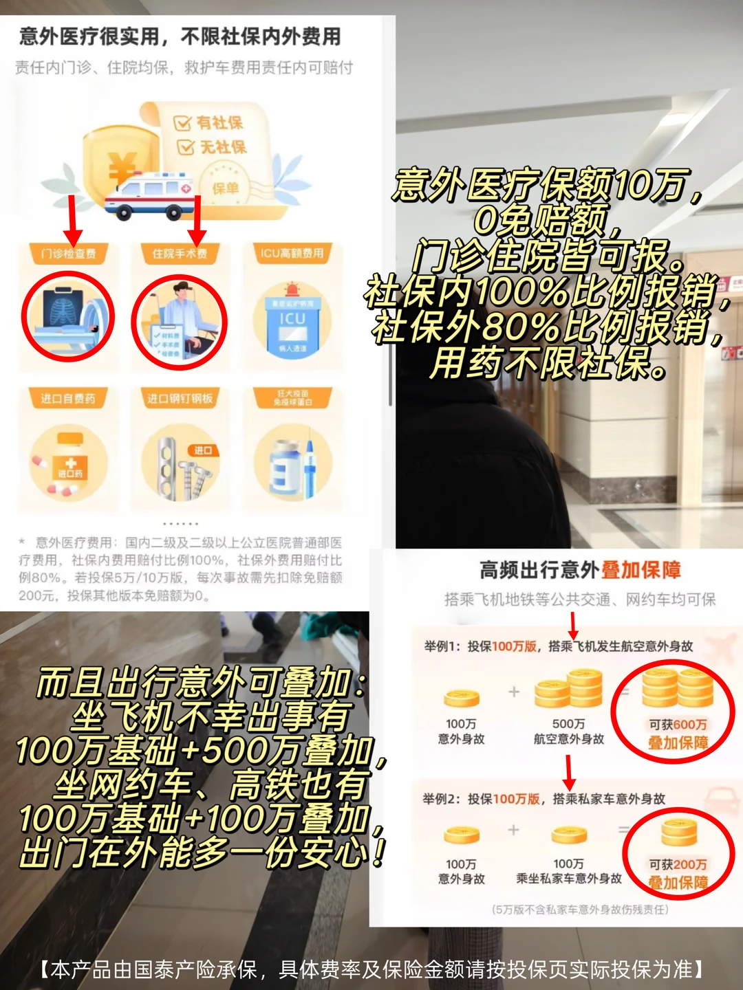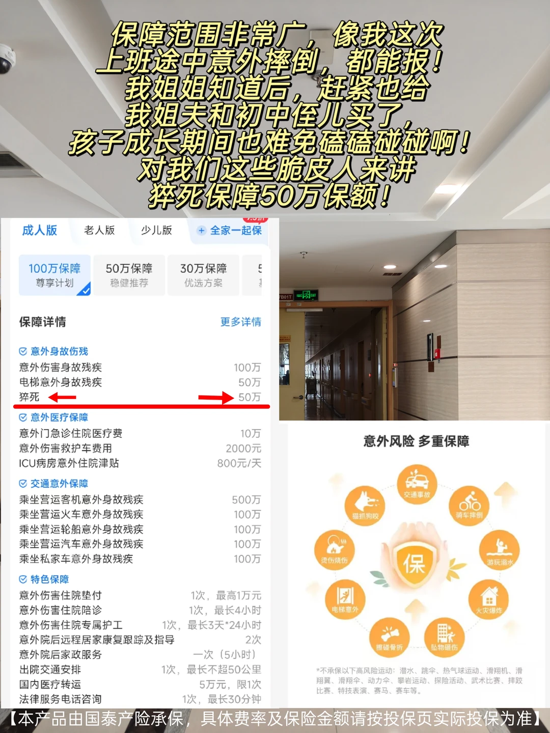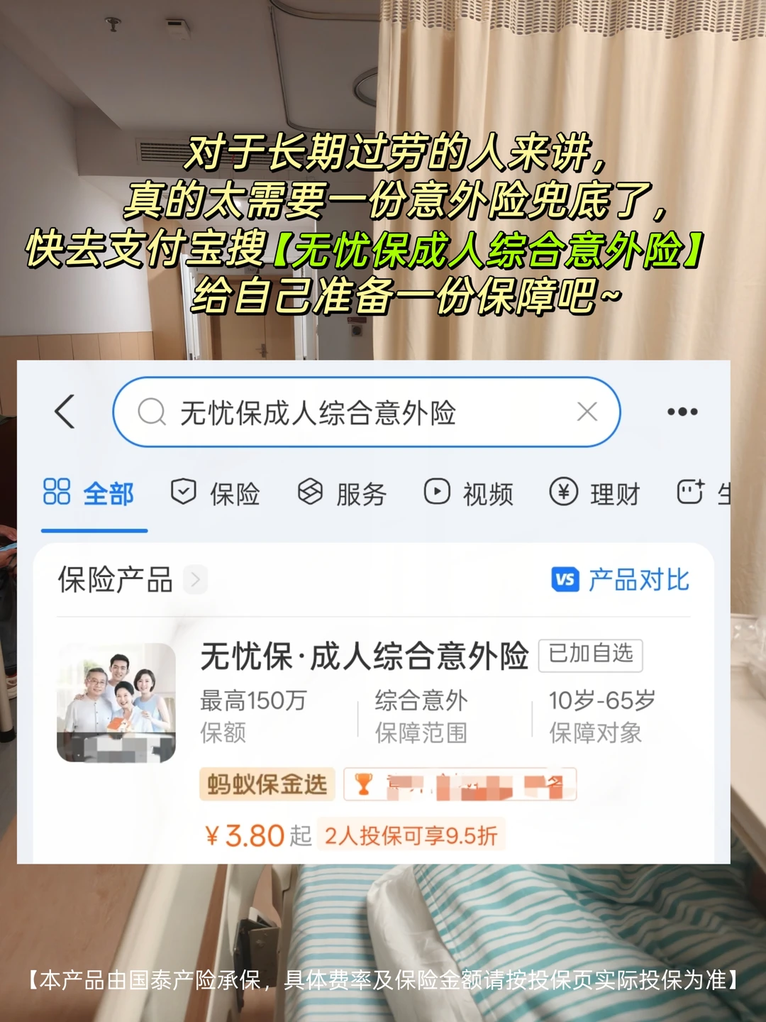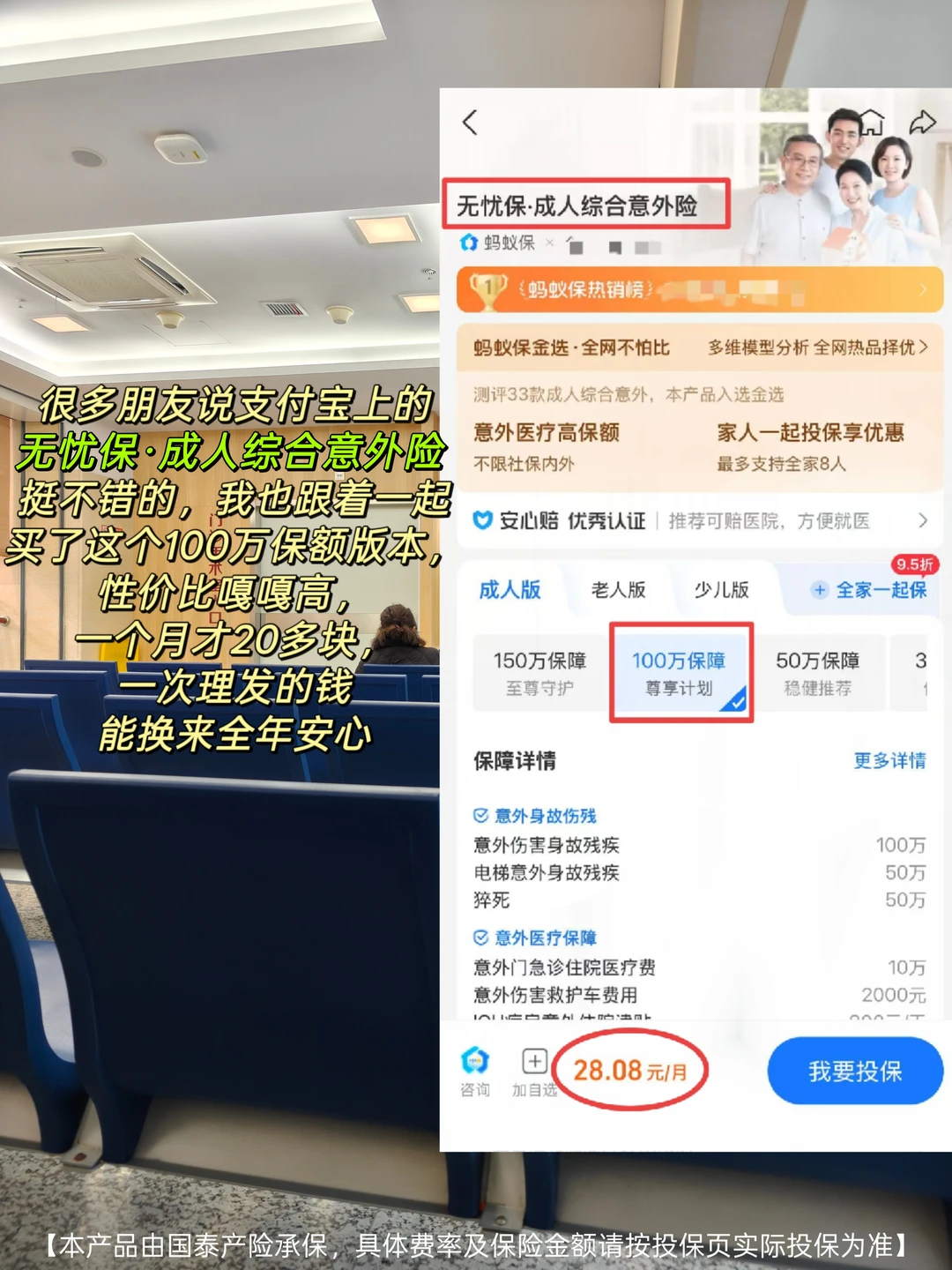 连续10天加班到深夜,脑子昏沉像灌了铅,早上赶地铁脚一滑,直接坐地上——尾椎骨剧痛 去医院拍片+理疗花了小两千。医保只报了一小半,剩下全自掏,肉疼。这还只是小伤,要是骨折了,后续治疗费、误工费不敢想 现在打工人太难了,拼命熬夜加班,身体早就透支了。听说隔壁就有程序员熬夜后猝死,赔偿都扯了好久。更离谱的是,有人脆皮到连打喷嚏都能闪到腰——意外根本不分场合,但医药费都实实在在从钱包扣 这次摔伤后我才意识到,意外保障真的不能少。赶紧找朋友打听意外险,朋友给我安利了支付宝上的【无忧保·成人综合意外险】,说它特别适合我们这种经常加班、需要通勤的打工人。我仔细研究比对了其他的保险,最后发现还是这款意外险最好,总结了几个优势给大家分享~ ①保障无死角:小磕小碰也算! 它覆盖了打工人可能遇到的各种意外场景: 不管是办公室晕倒受伤、日常通勤意外,还是出差的交通意外都能保。尤其是猝死保障,对咱们长期加班的打工人来说太刚需了 而且不光赔身故/伤残,门诊、住院的医药费也能报,连住院垫付、陪诊这些增值服务都有,实用性拉满 ②赔付顶呱呱:小伤不心疼,大险有底气 意外医疗是意外险的核心,这个成人综合意外险的报销条件很友好 100万版本的无忧保意外医疗有10万保额,不限社保内外用药,社保内最高100%比例报销,社保外80%比例报销,还0免赔额 给大家算笔账:假设摔伤骨折花了2万,医保报完自费1万(社保内7千+社保外3千) 无忧保能报:7000 + 3000×80% = 9400元,自己只掏600块,医疗负担一下就轻了 而且猝死最高赔50万;100万保额版的话,坐飞机意外身故可赔600万,高铁、网约车可赔200万,保额足够扎实 ③花小钱办大事 100万保额每月才20多块起,也就一杯奶茶钱,完全不心疼。更划算的是全家一起投保能享95折,最多8位家人能一起保,给爸妈安排上也花不了多少 ④没啥投保限制:10至65周岁,基本都能买 不用体检!不用健康告知! 只要年龄在10至65周岁,能正常工作生活,就能投 长期过劳的人,真的太需要一份意外兜底。上支付宝搜【无忧保成人综合意外险】,花点小钱给自己和家人一份保障,别等意外发生了才后悔 【本产品由国泰产险承保,具体费率及保险金额请按投保页实际投保为准】
