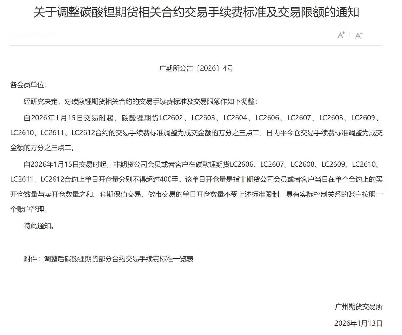 广州期货交易所关于调整碳酸锂LC期货相关合约交易手续费标准及交易限额的通知