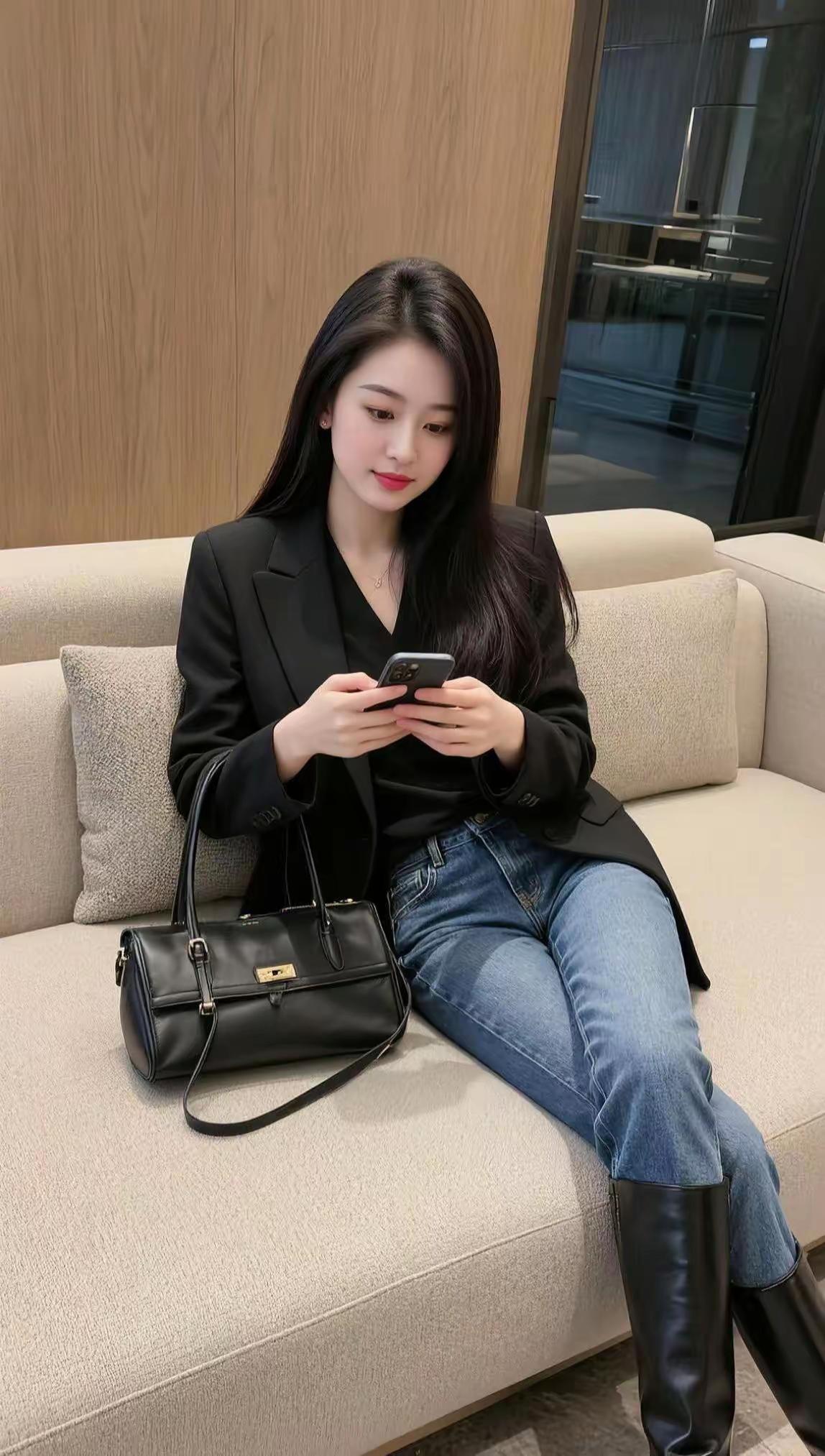 时尚穿搭,黑色西装外套搭配牛仔裤,尽显优雅与自信。