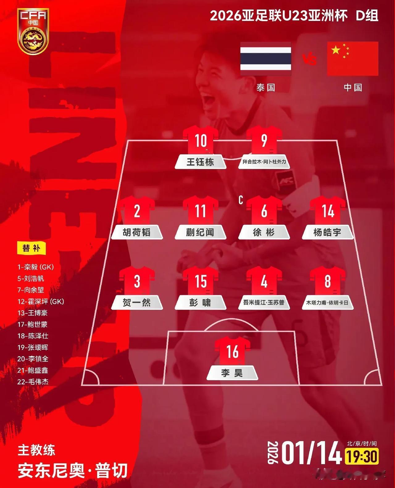 在打平就能出线的情况下,国足对阵泰国变阵4后卫,这是多么自信的球队。国足的志向绝不局限在小组出线,他们的目标是冠军。 末轮对阵泰国,国足的阵型由532变为4231,吾米提江与彭啸搭档中后卫,贺一然、胡荷韬担任边后卫。 徐彬和杨皓宇组成双后腰,王钰栋和木塔力甫两翼齐飞,蒯纪闻担任前腰,拜合拉木担任中锋。 这一阵型攻击力非常强,体现了国足必胜的信心。