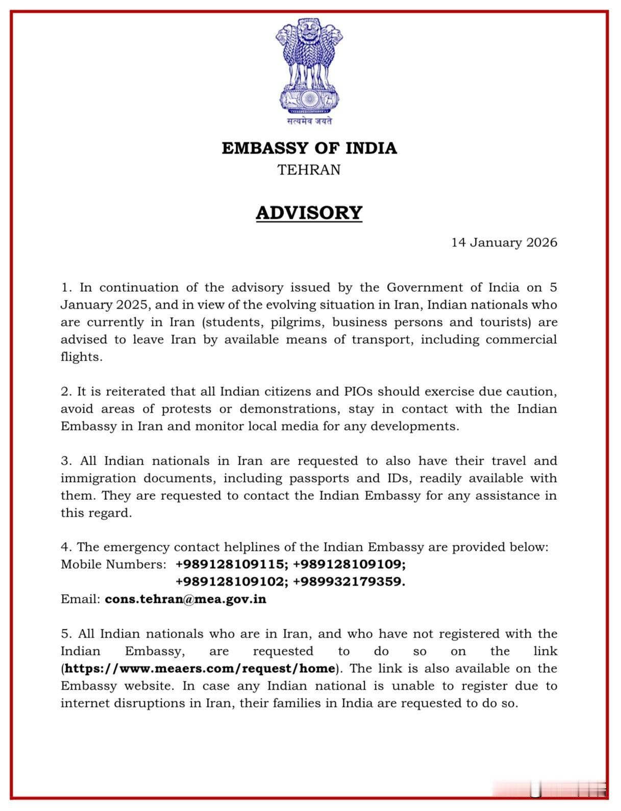 最新消息:印度驻德黑兰大使馆发布公告要求其公民尽快离开伊朗。 AI翻译: 印度驻德黑兰大使馆 公告 2026年1月14日 1. 继印度政府2025年1月5日发布公告后,鉴于伊朗局势的发展,现建议目前身处伊朗的印度公民(包括学生、朝圣者、商人和游客)通过商业航班等现有交通方式离开伊朗。 2. 特此重申,所有印度公民及海外印度裔人士应保持高度谨慎,避开抗议或示威区域,与印度驻伊朗大使馆保持联系,并关注当地媒体的最新动态。 3. 要求所有在伊朗的印度公民随身携带旅行和移民相关文件,包括护照和身份证件。如需相关协助,可向印度大使馆寻求帮助。 4. 印度大使馆紧急联系热线如下: 移动电话:+989128109115;+989128109109;+989128109102;+989932179359。 电子邮箱:cons.tehran@mea.gov.in 5. 所有在伊朗且尚未在印度大使馆完成登记的印度公民,需通过链接()完成登记,该链接也可在大使馆官网查询。若因伊朗网络中断无法完成登记,可由其在印度的家属代为办理。