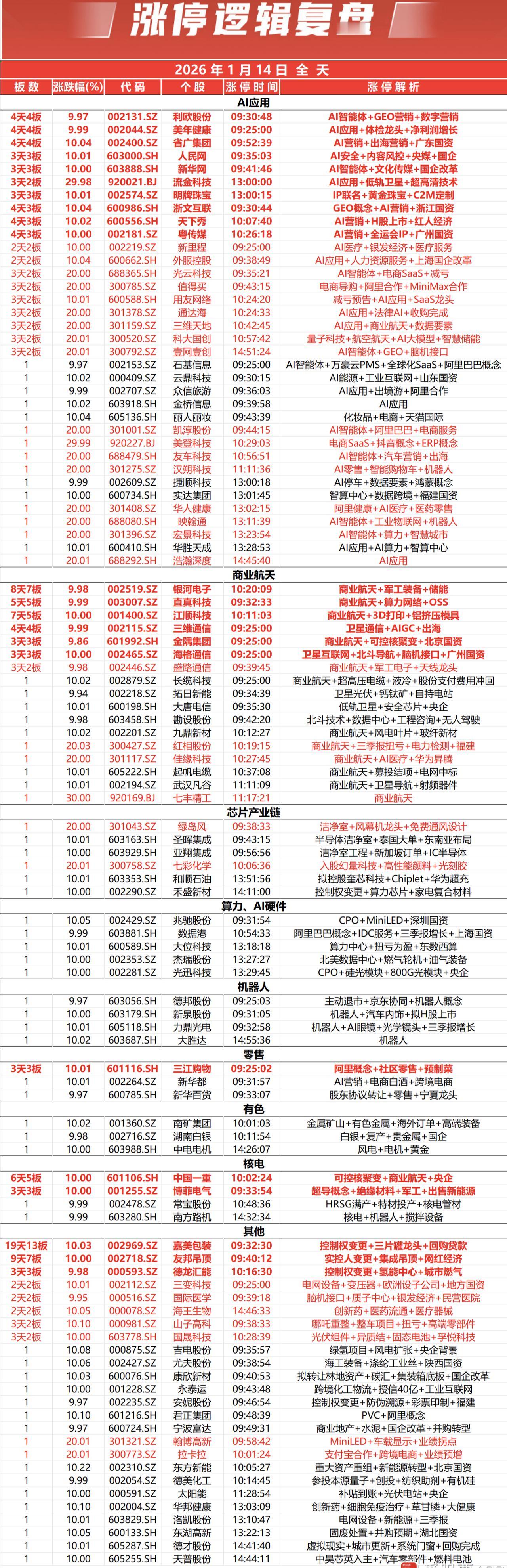 连板高标(1月19日)14板--锋龙股份,优必选 入主+机器人;4板--新