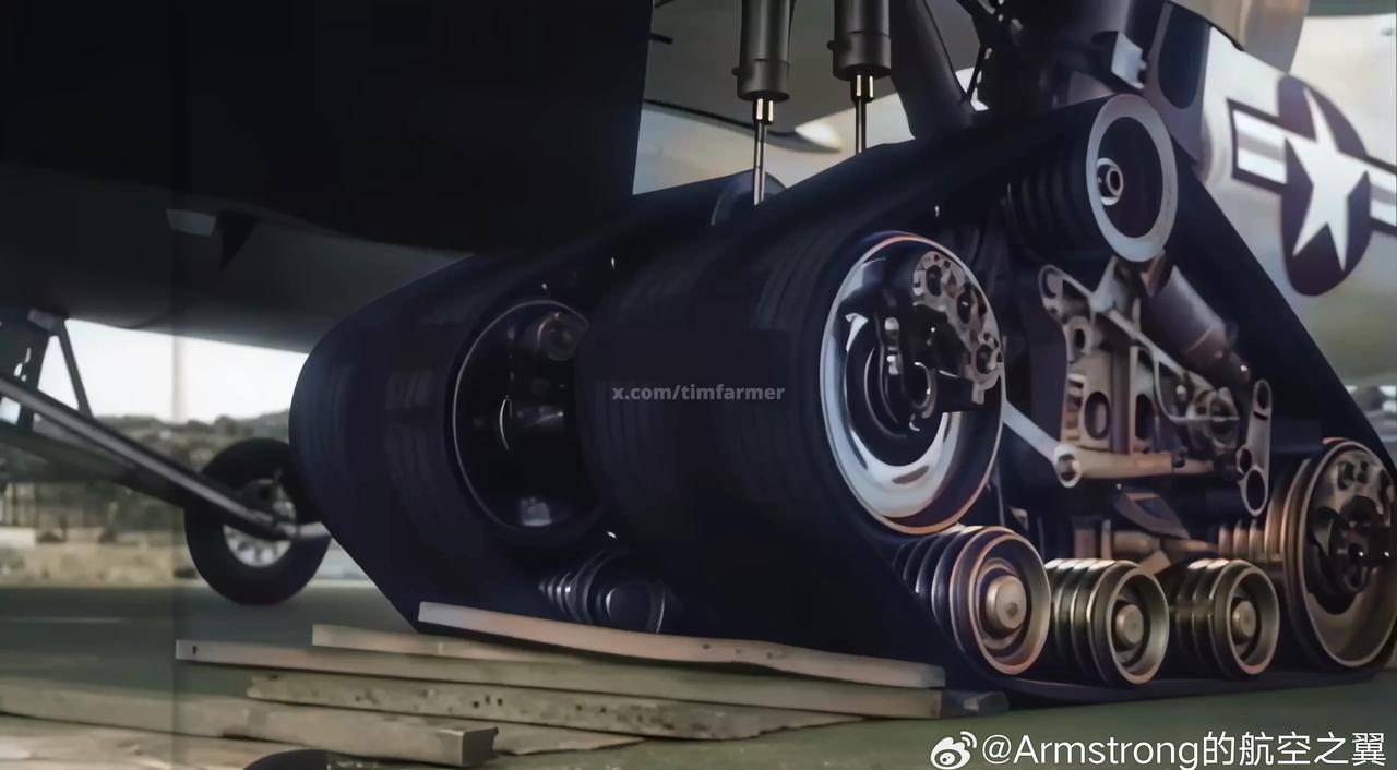 40年代末,美国空军在波音 B-50B “超级堡垒” 上测试了由Firestone(凡士通)公司开发的履带式起落架。烽火问鼎计划 每天认识一件新兵器 冷战初期,美军担心核打击后的常规跑道会被摧毁,因此希望大型轰炸机能够在未经平整的荒地、泥地或松软的泥土上起降。 这种起落架模仿了坦克履带。通过巨大的橡胶带和滚轮组增加与地面的接触面积(单位受力面积约减小到三分之一),防止沉重的轰炸机陷进软土中。 实验结果显示确实显著降低了对地面的压强,使飞机能够在非铺装路面降落。但履带系统极其沉重(比传统轮式起落架重得多),且在高速滑行时会产生剧烈的振动和巨大的噪音。此外,其复杂的机械结构导致维护难度极大。 随着喷气式飞机的普及和更轻便的多轮组起落架技术的成熟(例如后来B-52采用的多轮式起落架),履带式起落架方案最终被放弃。 这架进行实验的具体型号通常被称为EB-50B。除了B-50,美国当时还在B-36巨型轰炸机和C-82运输机上测试过类似的履带系统。