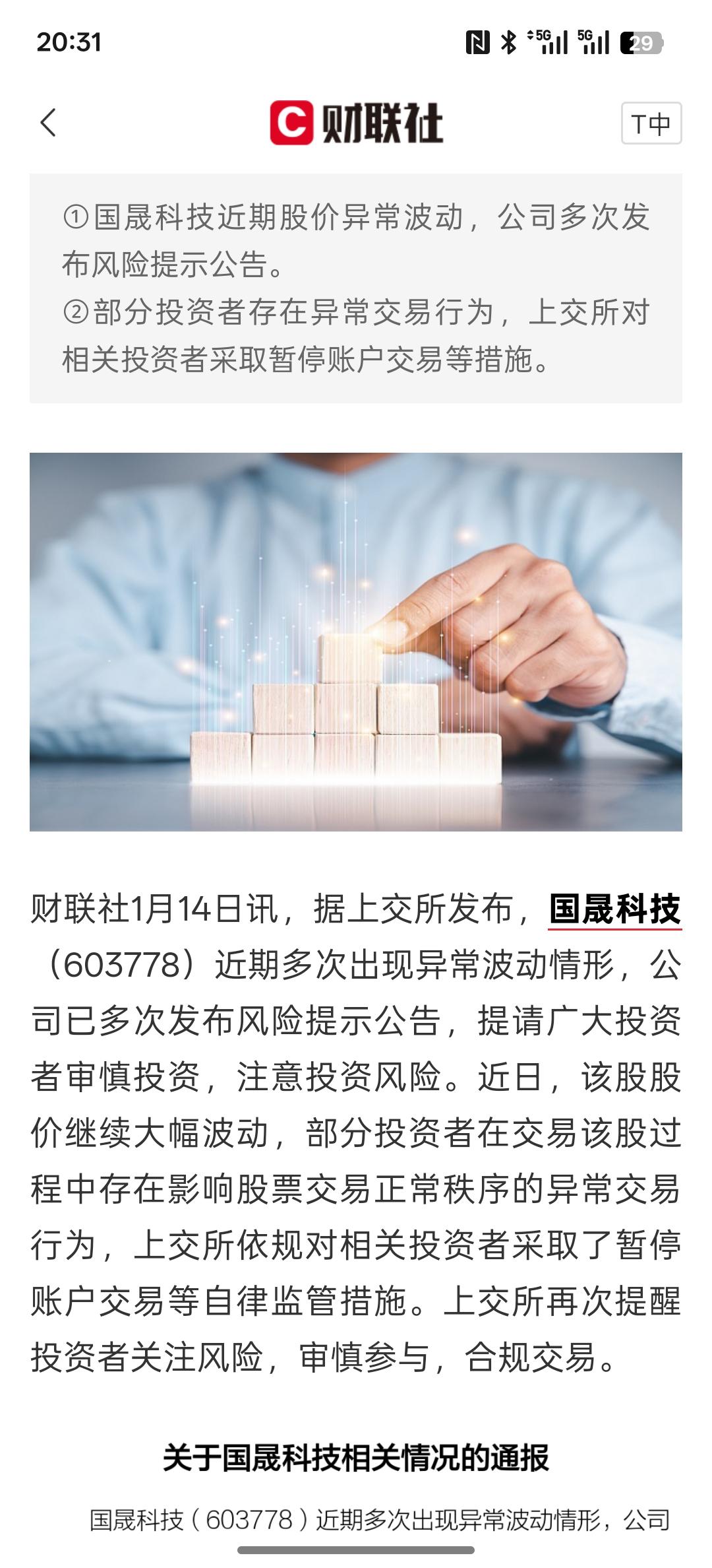 明天没得玩了,上交所:对国晟科技相关投资者采取暂停账户交易等措施,直接给你暂停交易,把你按在地板上摩擦,就等于拔网线了!那下跌的话就只能挨板子!这种股价异常波动大幅上涨!涨幅过大,与公司基本上都不匹配!明天大盘就会下跌!有些账户被暂停交易的话,基本上就卖不动了!影响正常交易的次序就是资金大幅的进出入