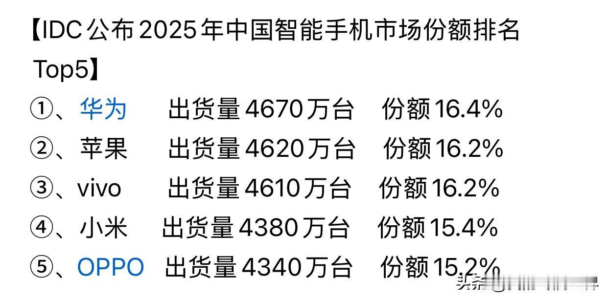 恭喜华为2025年手机总销量国内排名第一,整体销量和去年差不多,另一个原因去年排名第一的vivo,销量相比去年下滑严重,导致去年各手机品牌销量过于集中,相互之间差距不大,这也是华为自2020年以后,时隔5年重回国内销量第一,对于华为来说,更需要稳扎稳打,解决芯片产能和完善鸿蒙系统,是当前主要问题。