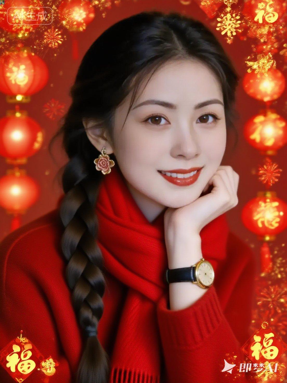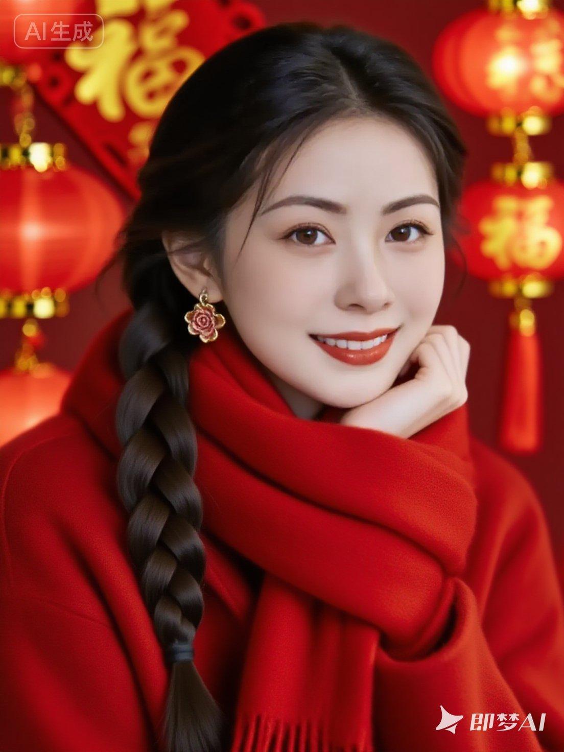 漂亮女孩,动作随机,戴着红色的贝雷帽,穿着红色露肩毛衣,长波浪卷发,看向镜头