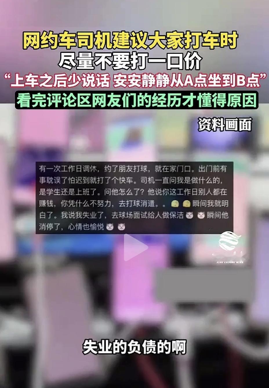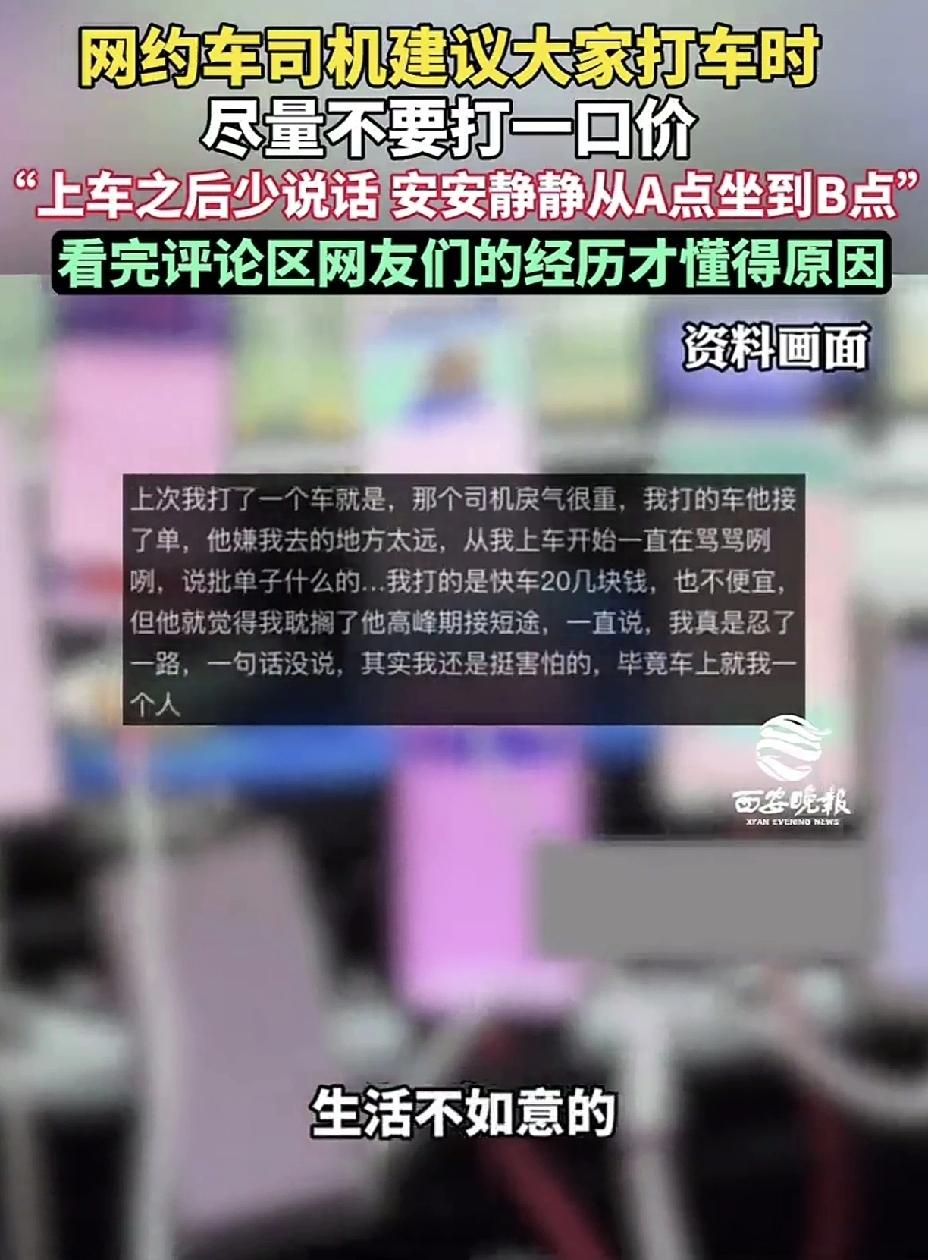 打滴滴你还敢选一口价吗?有网约车司机发视频警告乘客,从A点到B点最好安安静静少说话,威胁意味十足!其声称进入这个行业的人不是失业就是负债,本就濒临崩溃边缘,乘客的话可能成为压垮骆驼的最后一根稻草,这话听着就让人毛骨悚然。 当然,也有网友调侃并奉劝各位网约车司机,要老老实实服务乘客。选择一口价的乘客,不是失业就是负债,服务不好真容易出问题。若不喜欢一口价订单,就别接,对双方都好。既然接了单,就要遵守服务合约。 换个角度看,该司机是否存在编造恐怖信息、严重扰乱社会秩序的行为?网约车出行本应便捷又温暖,如今却成了让人步步惊心的“战场”。如此一来,网约车招募司机的准入规则会更严格,这也会截断部分失业人士的一条退路。 当然,这位司机也并非毫无缘由地这么做。想想之前,北京有司机面无表情地警告想开空调的乘客别说话,称容易出事;长春司机因乘客关车门声音大而辱骂威胁;南京深夜甚至有司机持刀捅伤乘客。 你认为这位网约车司机的观点正确吗?