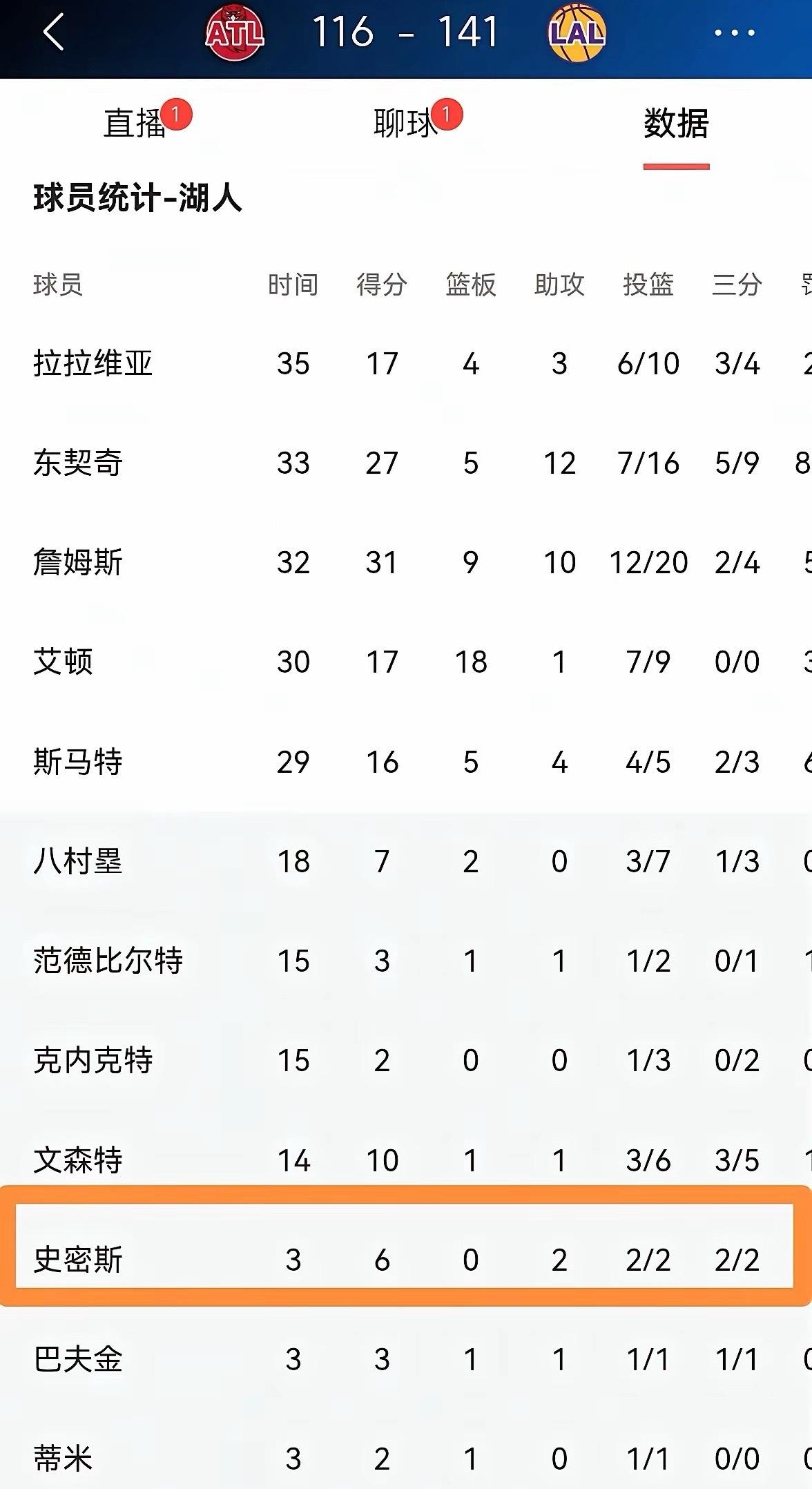 我强烈建议湖人主帅雷迪克重用小将史密斯!在今天湖人主场以141:116大胜老鹰的比赛中,小将史密斯替补出战3分钟,三分球2中2得到6分,还有2助攻,史密斯的整体表现非常不错。 ​老实说,以湖人目前的阵容配置来看,史密斯完全可以取代克内克特的位置,起码史密斯拥有一定的持球进攻能力,而且史密斯的三分投射能力不比克内克特差。