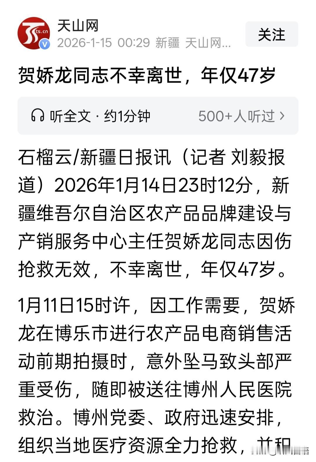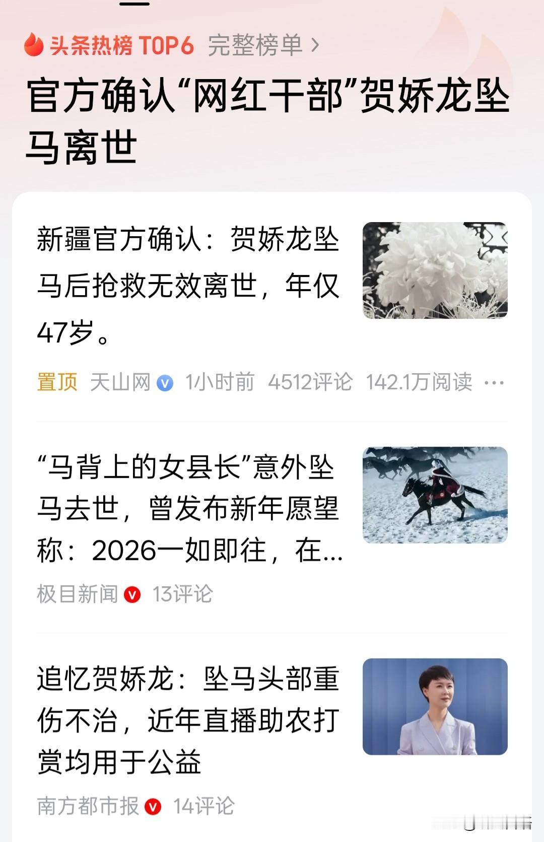 夜里刷到一条突发消息,贺娇龙姐姐真的离开了!我从未如此热切地盼望这是一则谣言! 多好的姑娘啊!为了新疆的文旅事业,为了新疆的三农发展,她开创了新疆旅游与农产品销售的崭新局面,却为了自己挚爱的事业,奉献出了宝贵的生命。基层党员的责任与担当,在她身上体现得淋漓尽致。 实在是令人痛心疾首、扼腕叹息! 你是党和人民的好女儿,全国人民会永远铭记你!