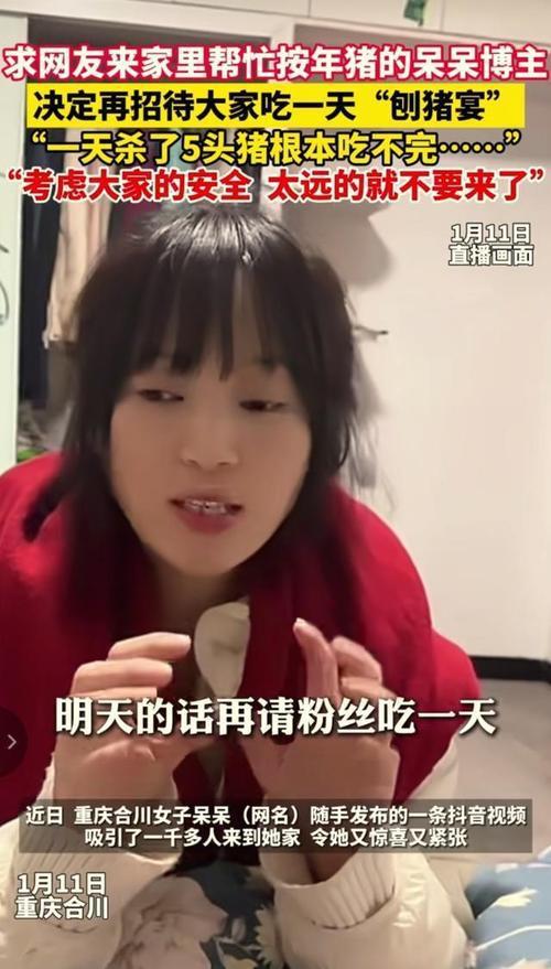 喊网友吃杀猪饭的呆呆爆火:一场流量狂欢背后,藏着中国人最缺的东西 一个重庆姑娘的“按猪求助”,让全网为之疯狂。合川女孩“呆呆”一句“家里杀年猪,缺人帮忙,管吃刨猪汤”,5个粉丝群一夜爆满,4000多名网友从渝川甚至更远地方奔赴乡村,直播间3000万人在线围观,两天涨粉超170万,当地文旅、公安连夜赶来保驾护航。 这波走红看似离谱,戳中了当代人最柔软的神经。网络世界充斥着精致滤镜后的剧本化表演、为博眼球的审丑炒作,网友早已审美疲劳。呆呆的视频里没有套路,只有对年迈父亲的心疼、想让家门口停满车的可爱攀比,以及“管饭”的朴实邀约。这份不加修饰的真实,像一股清流击穿了算法裹挟的功利空间。 网友们奔赴的不是杀猪饭,是久违的烟火气和人情味。成年人在城市里戴着面具打拼,邻里之间老死不相往来,过年只剩手机里的群发祝福。曾经杀年猪时全村帮忙、围坐喝汤的热闹,早已成了遥远的乡愁。呆呆家的院子里,素不相识的人自发分工按猪、烧火、洗菜,孩子们在田埂奔跑,成年人聊起家常。热气腾腾的刨猪汤里,煮的是中国人刻在骨子里的集体记忆与温情联结。 这场意外走红没有变成无序闹剧。当地部门快速响应维持秩序,送上特产和景区门票,整理更多刨猪汤点位,让流量变成实实在在的文旅红利。比起刻意策划的网红打卡,源于民间的真诚与民俗的温度,才是最动人的流量密码。 呆呆的爆火从来不是偶然。再快的时代,人们对真诚的渴望、对温情的追求从未改变。网红们还在靠扮丑、炒作博眼球时,一份朴实的求助、一顿热闹的杀猪饭,就足以引发全网共鸣。 你多久没感受过这种纯粹的热闹了?如果有机会,你会奔赴一场陌生人的杀猪宴吗?评论区聊聊你的看法!