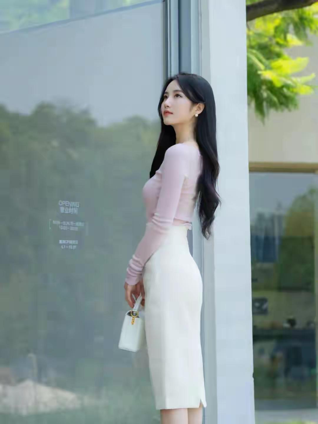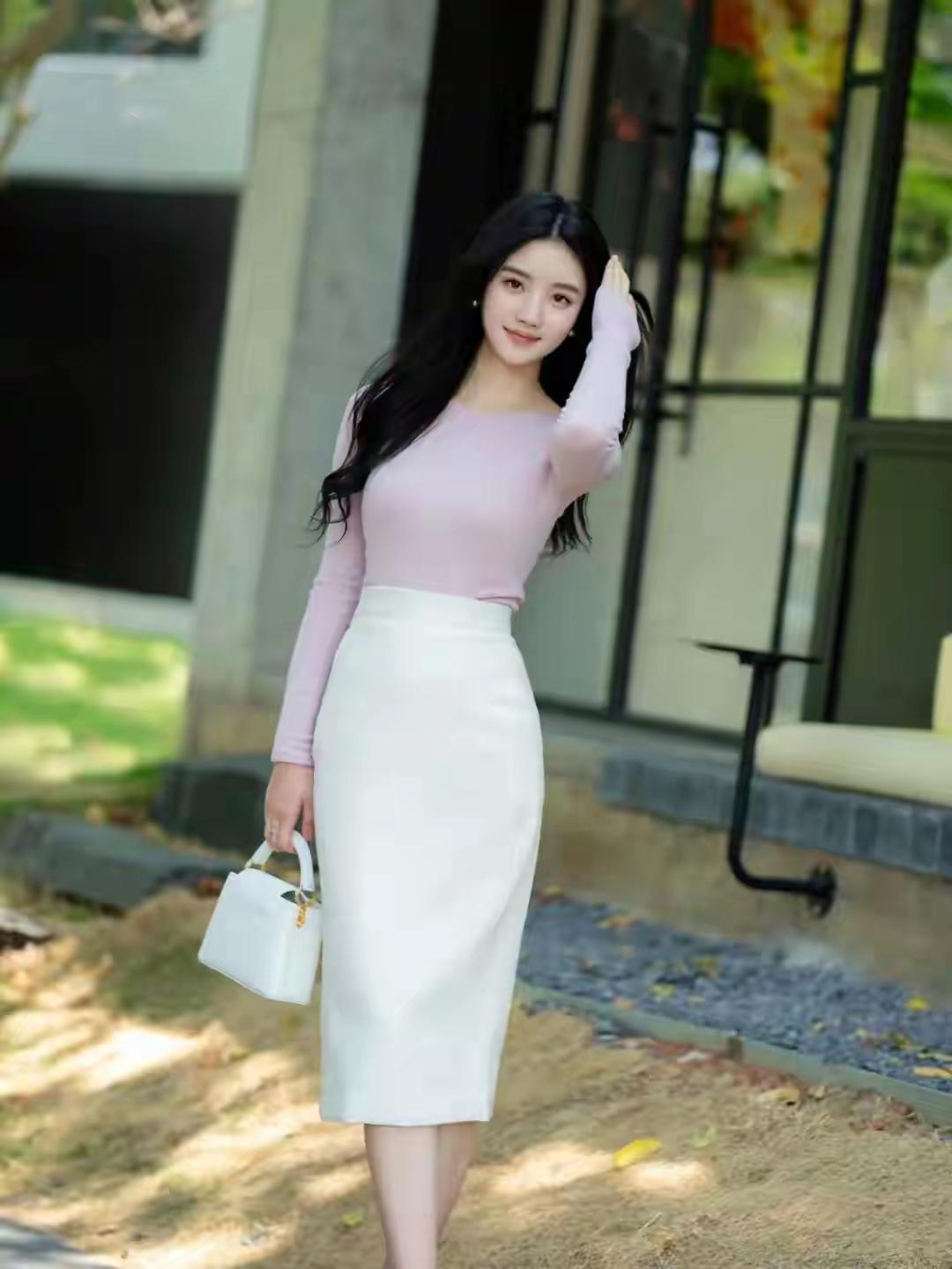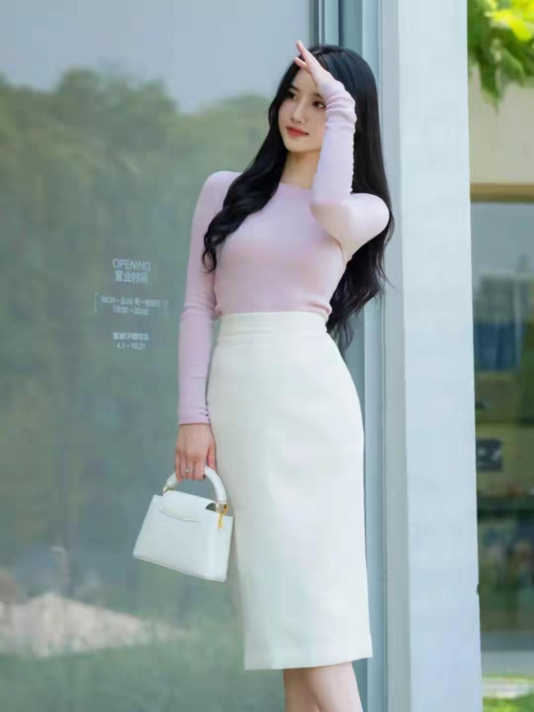 优雅气质穿搭,粉色长袖上衣搭配白色高腰裙,手拿小包,尽显时尚魅力!