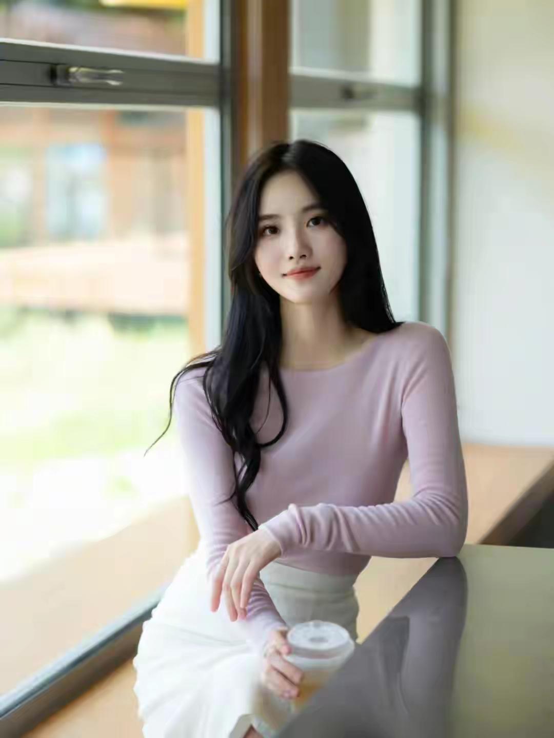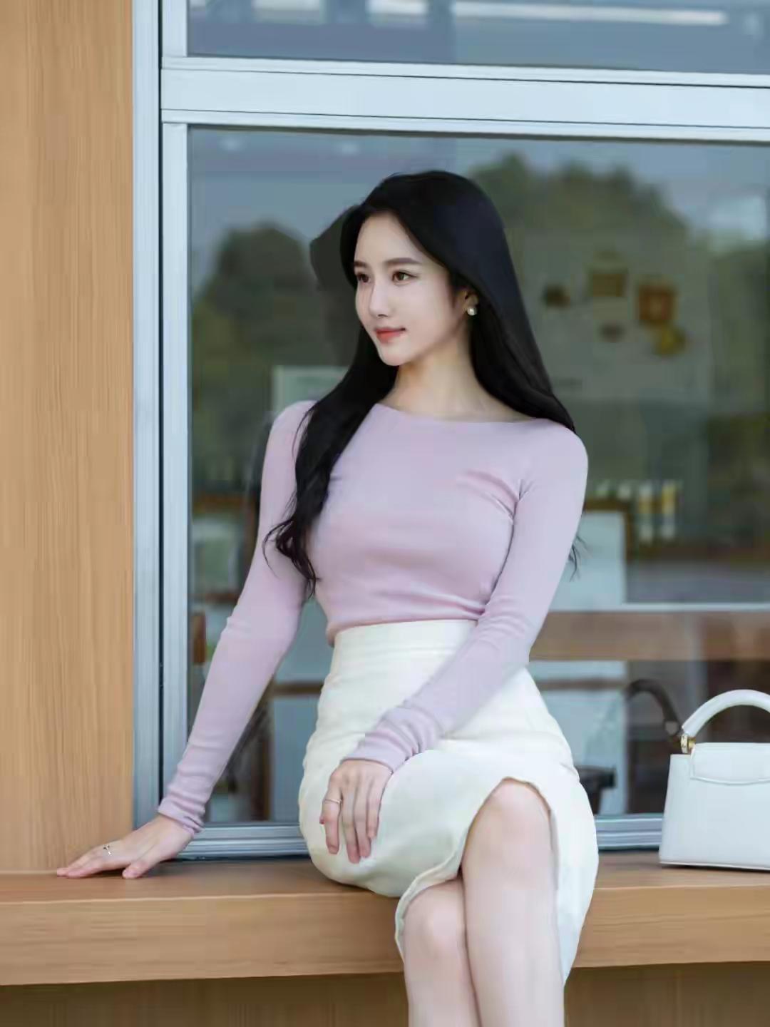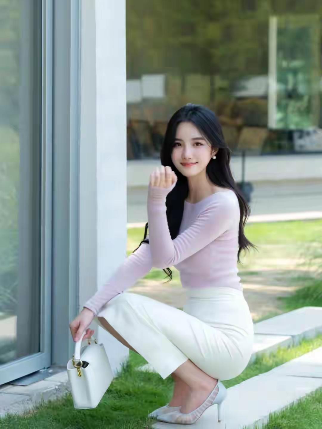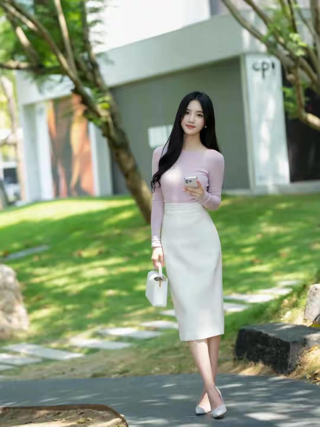 优雅气质穿搭,粉色长袖上衣搭配白色高腰裙,手拿小包,尽显时尚魅力!