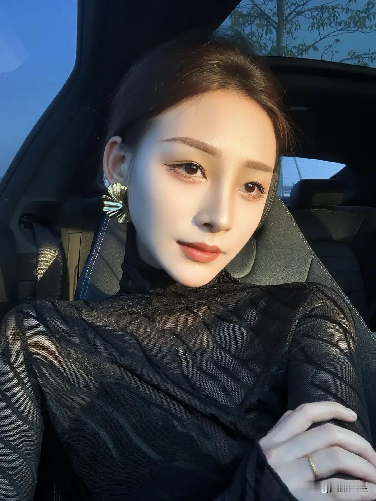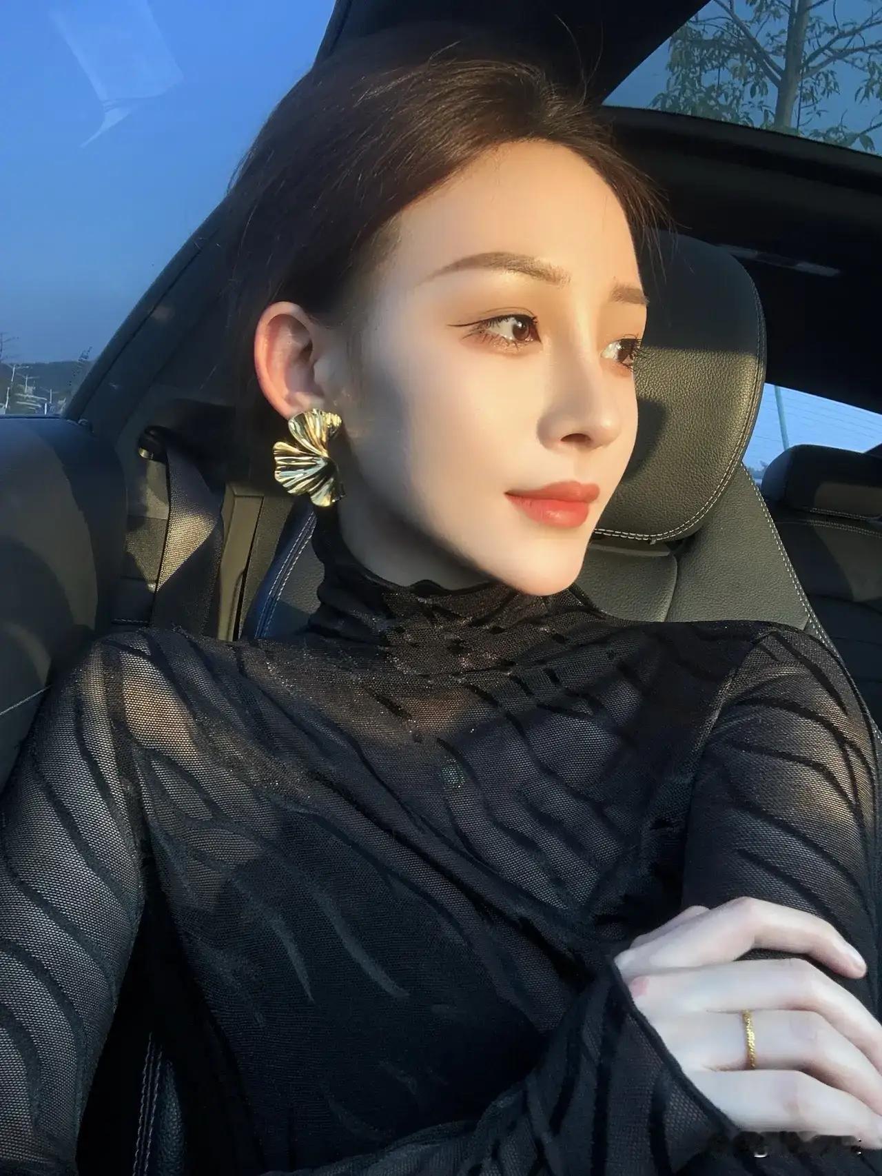 优雅黑丝绒,车中自拍照,闪耀耳环,温柔妆容,完美一天