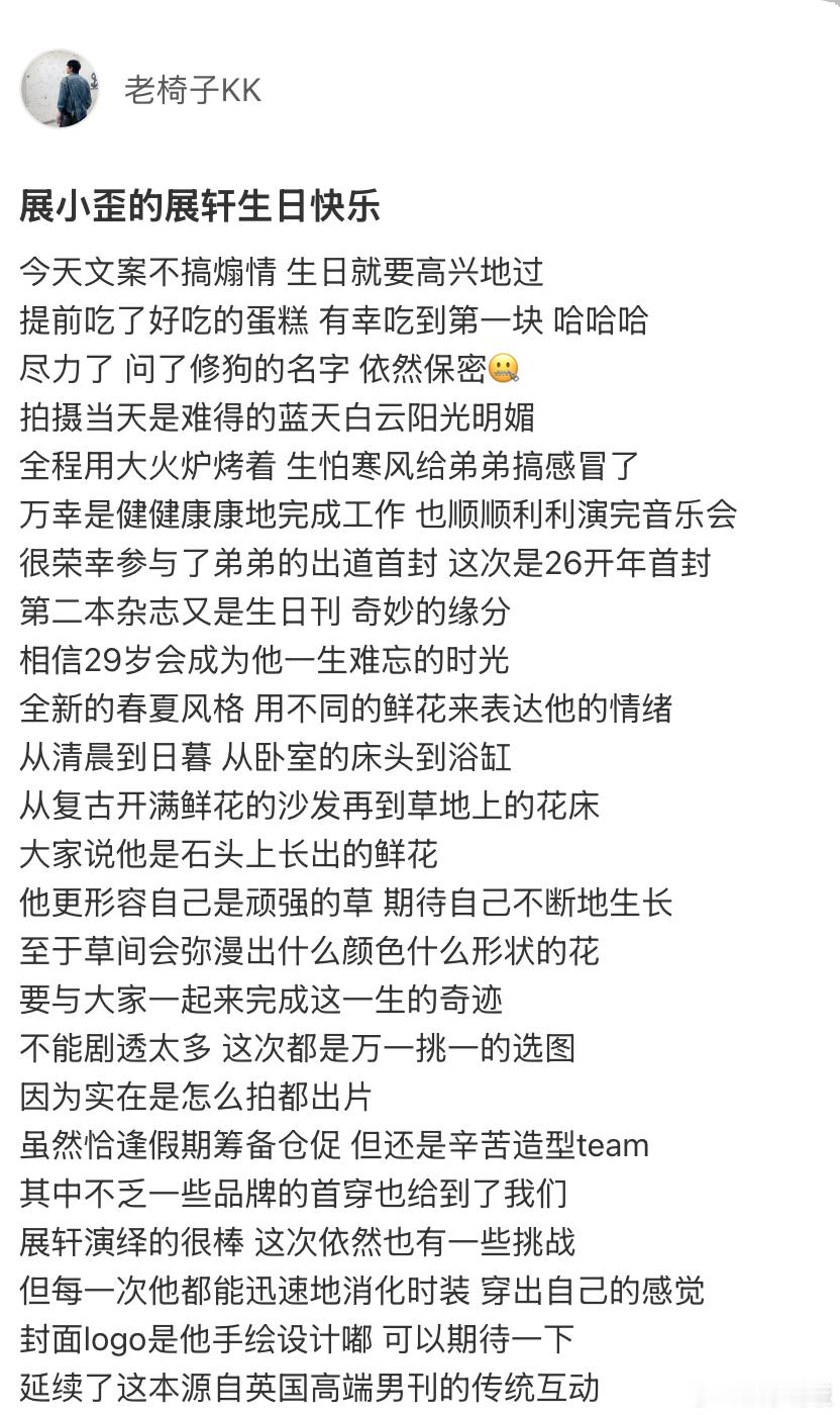 展轩手绘杂志封面logo展轩觉得小狗的名字太土要改名 设计师分享和合作感受:29 岁生日刊 + 26 开年首封的缘分太妙了~拍摄那天问展轩的小狗叫什么名字,觉得之前的命有点土要改名 展轩还手绘了杂志封面 logo ,期待值已经拉满了 展轩