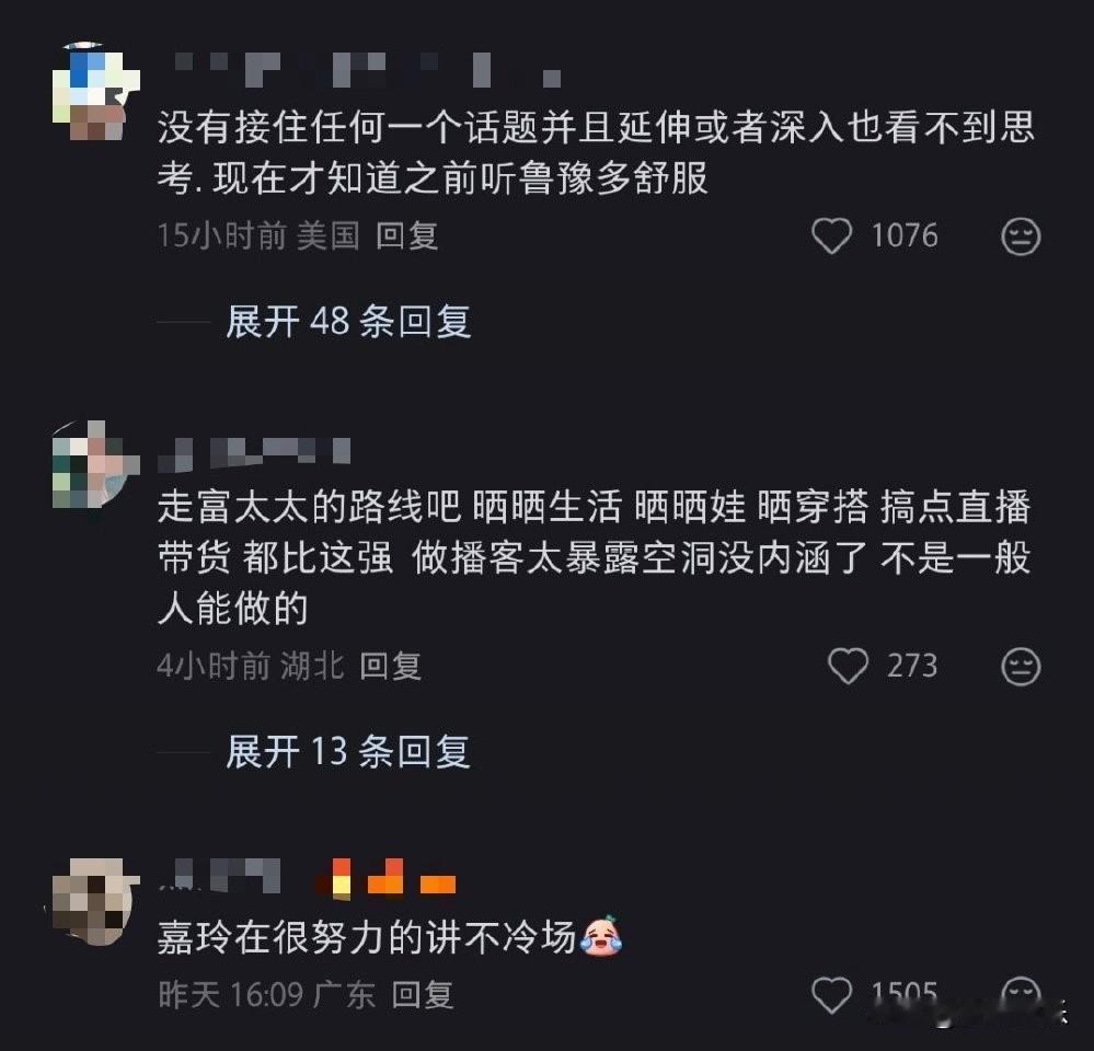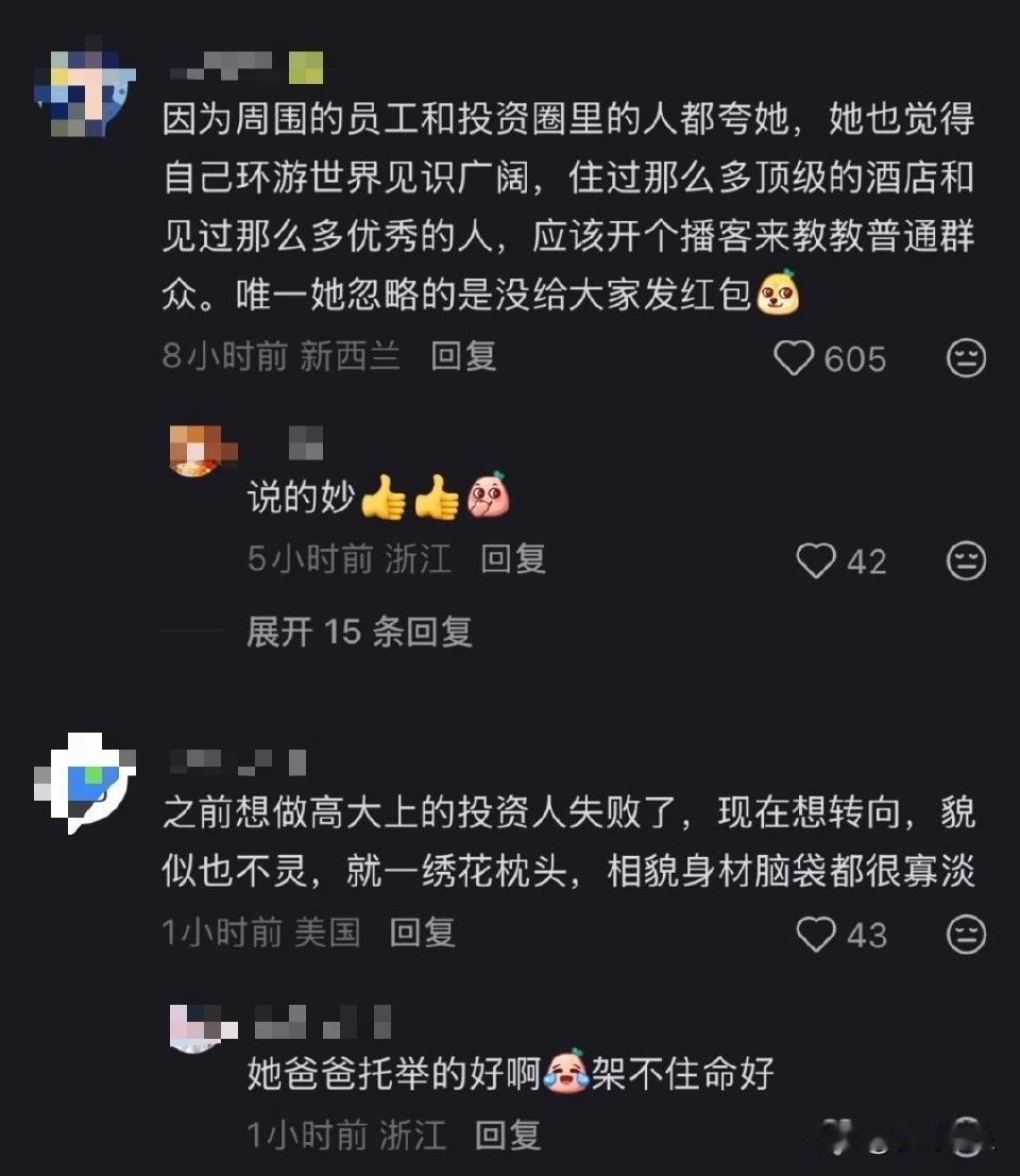 章泽天的播客,基本都是差评,说她的采访乏味又无聊。章泽天在播客里还讲了个她觉得很感人的小故事,就是她去不丹徒步时,在高山上看到了一朵盛开的花,当下感动到流泪。[灵光一闪]不是,这有啥好感动的?除了养尊处优、闲的无聊的阔太太,一般人还真get不到。 章泽天出来做播客,当然是想收割网友,希望大家夸她有才华、厉害!但是她放不下阔太太的架子,没有深度,也没有痛点,所以特别空洞,无法让网友共情。 她真不如出来分享阔太的生活可能大家还爱看,或者干脆听播客送券,绝对能扭转对她的评价[捂脸]