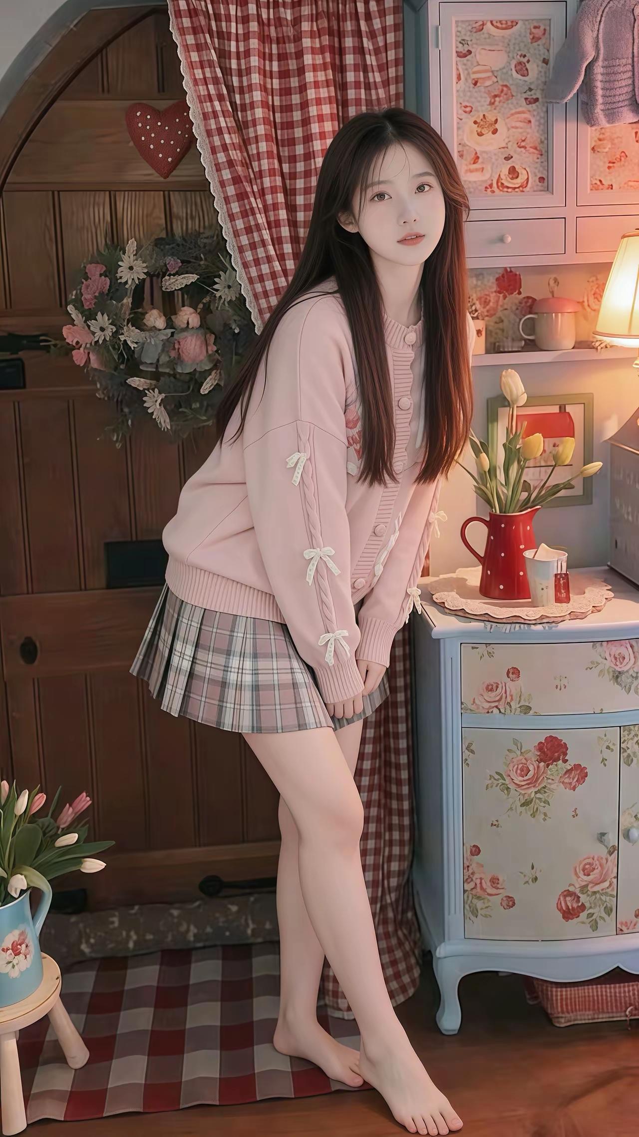 少女心满满的小屋,粉色毛衣与格子裙的完美搭配,温馨又可爱!💖🌸👗嫩粉色系穿搭 温柔粉色穿搭