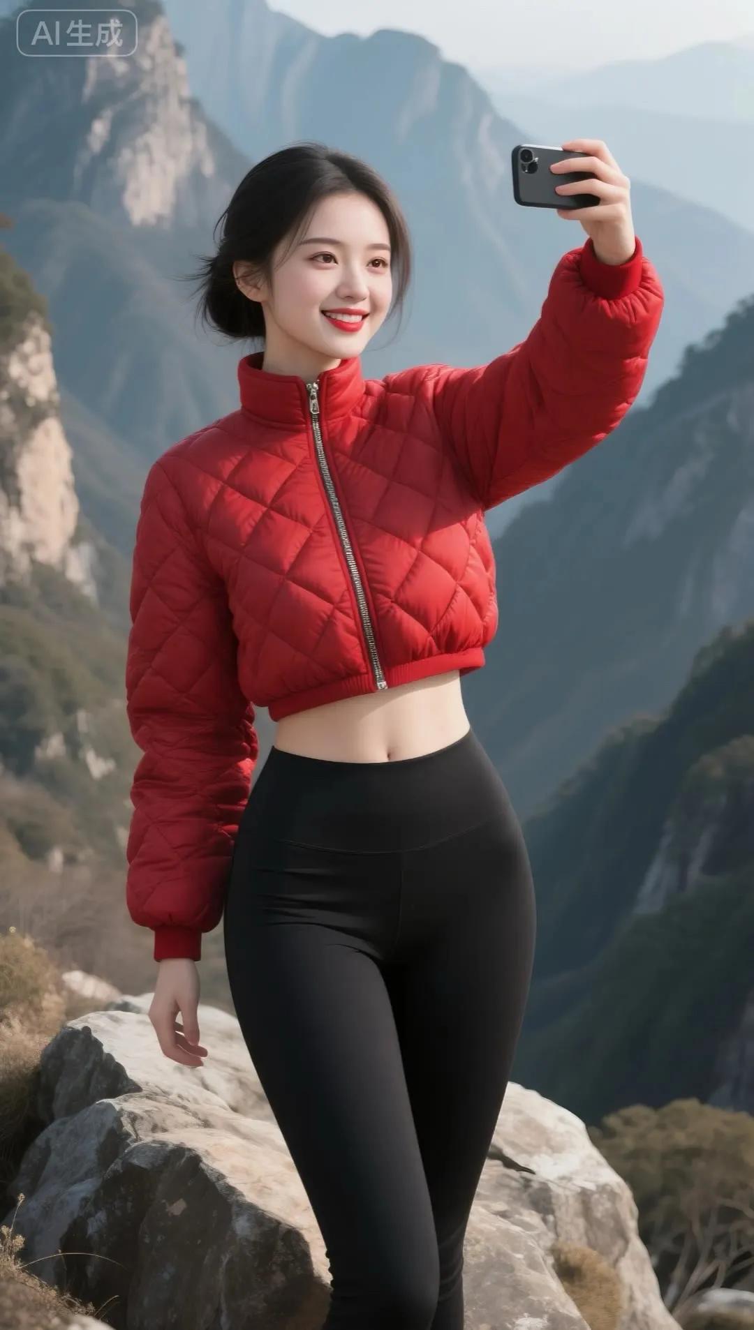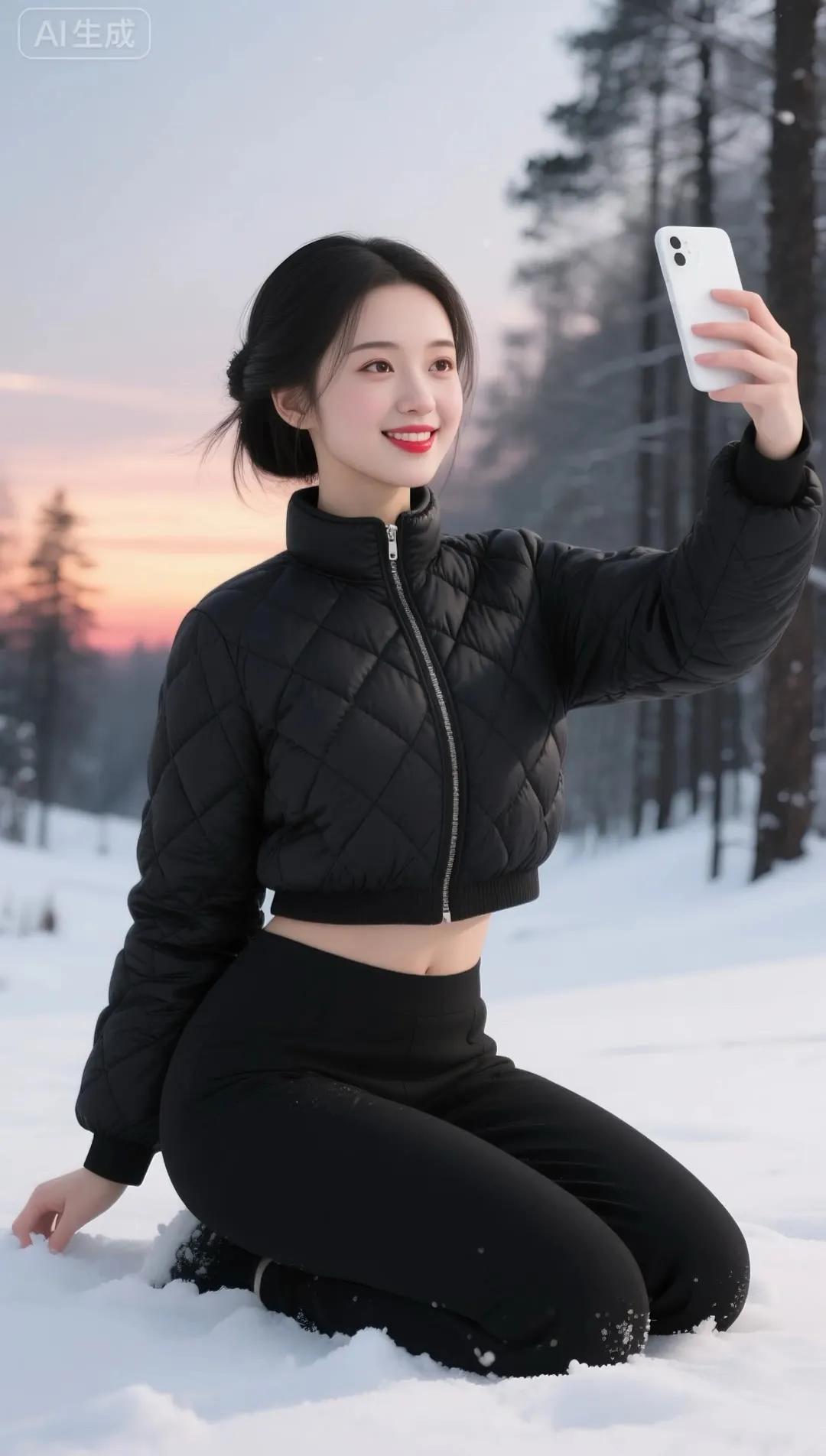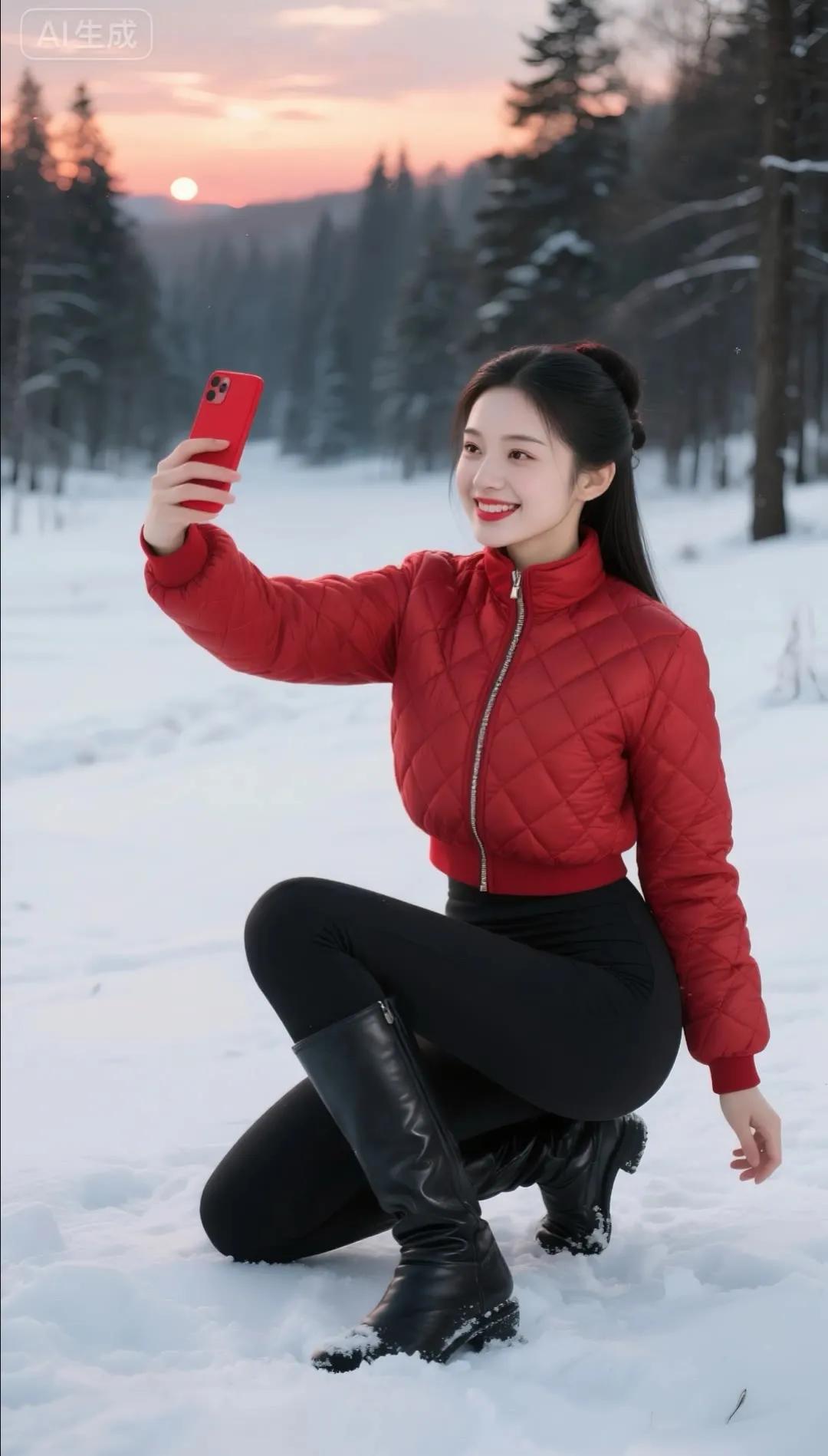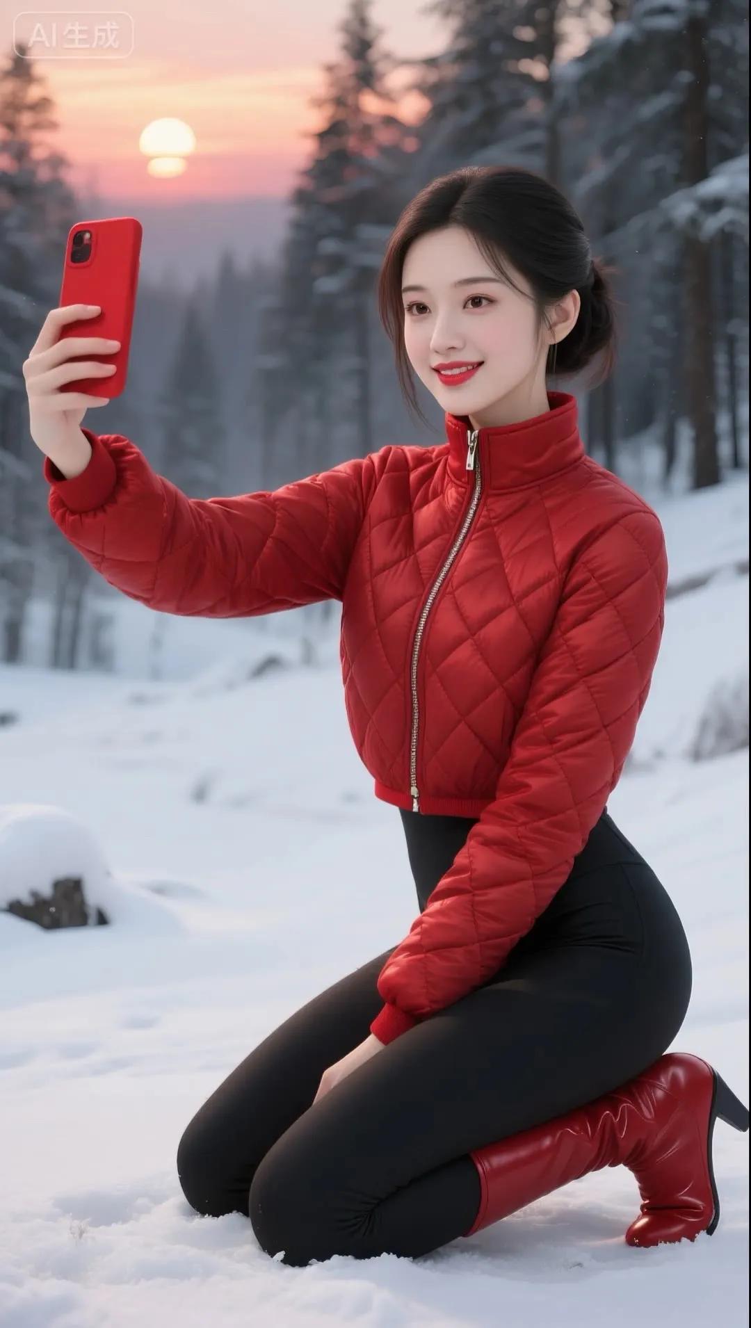 冬日雪景中的甜美自拍,红色羽绒服与白雪的完美搭配!🌨️📸